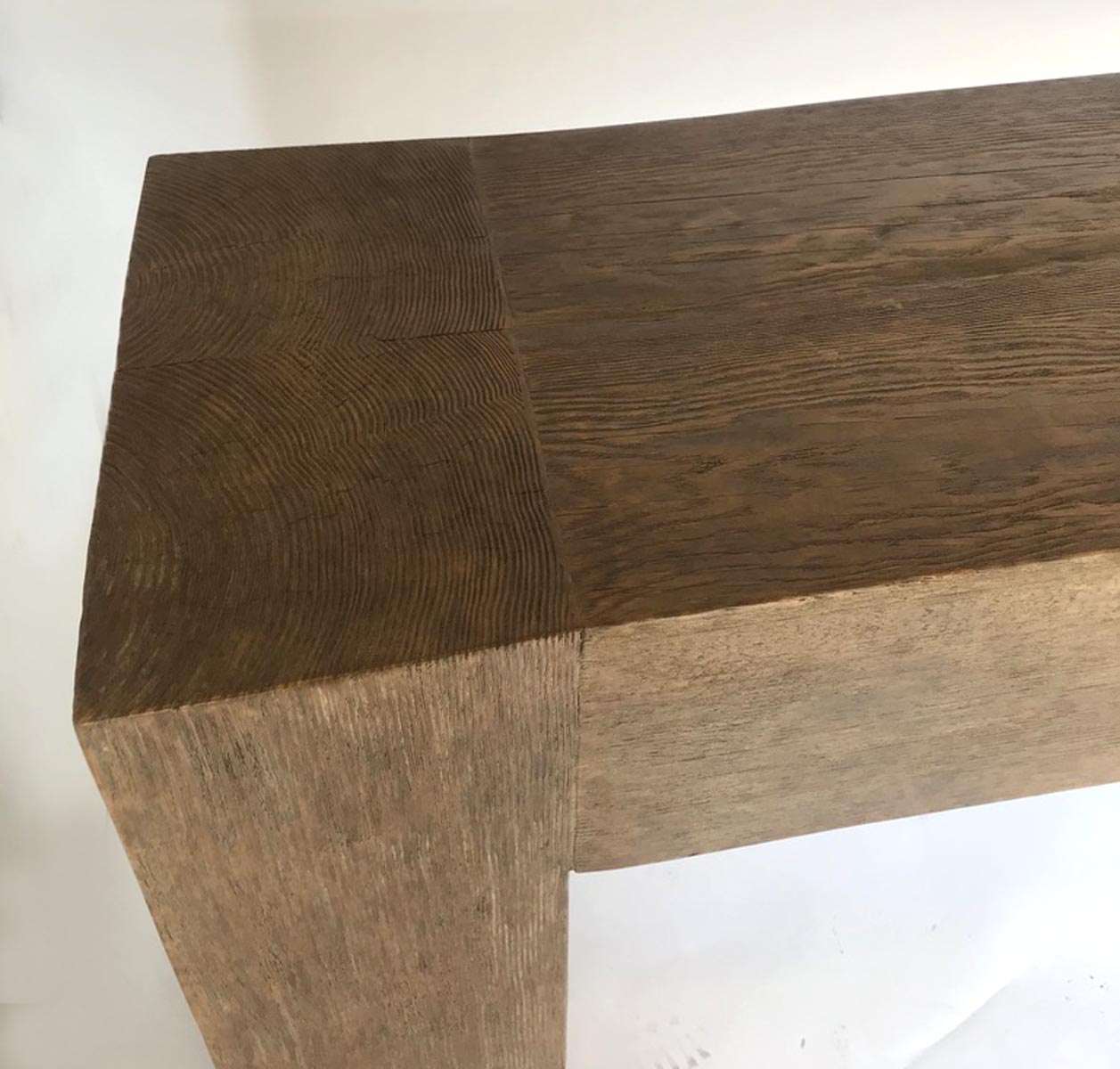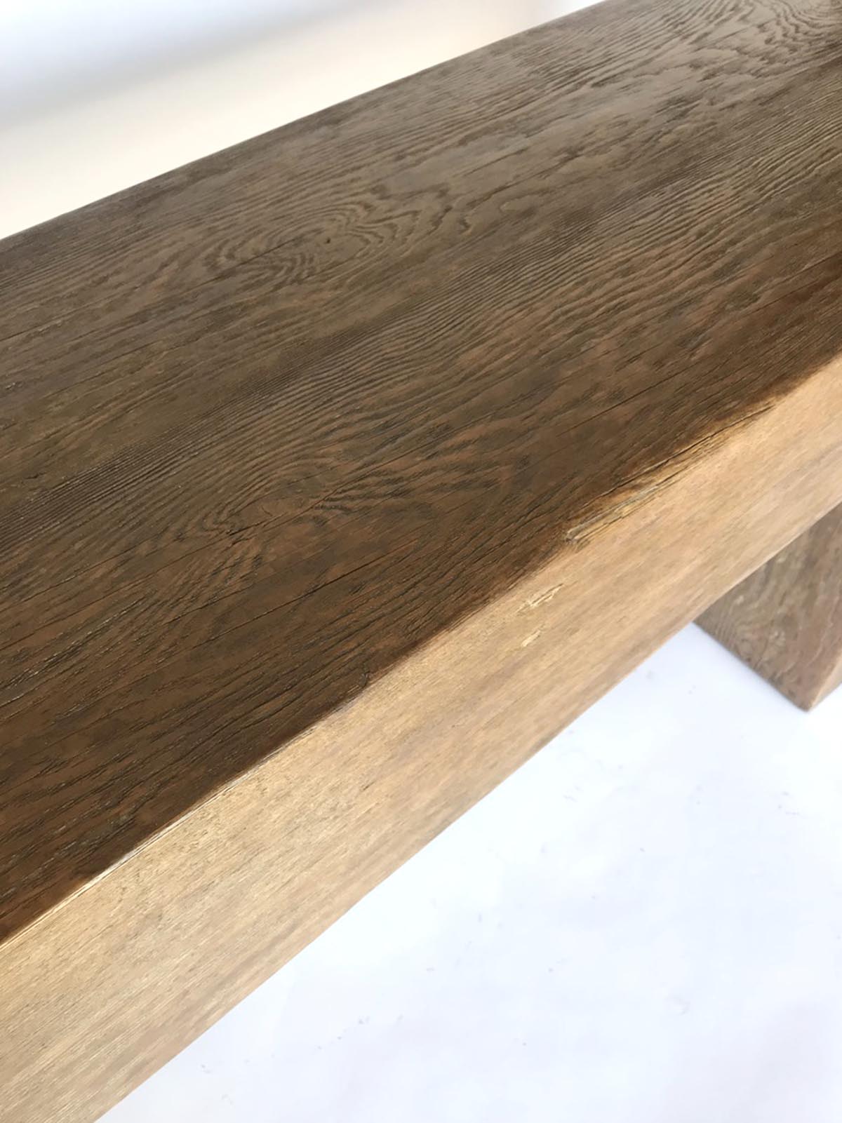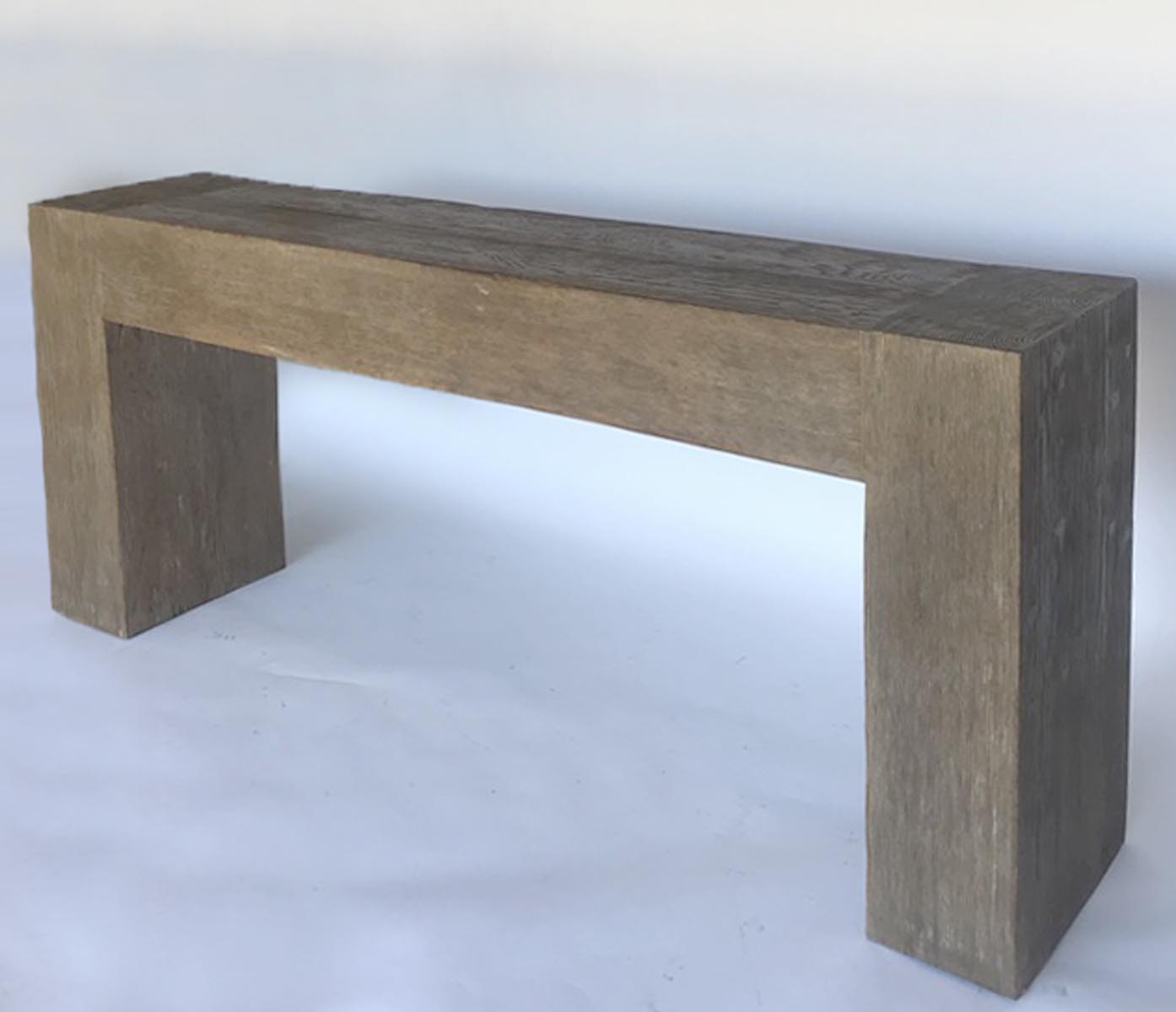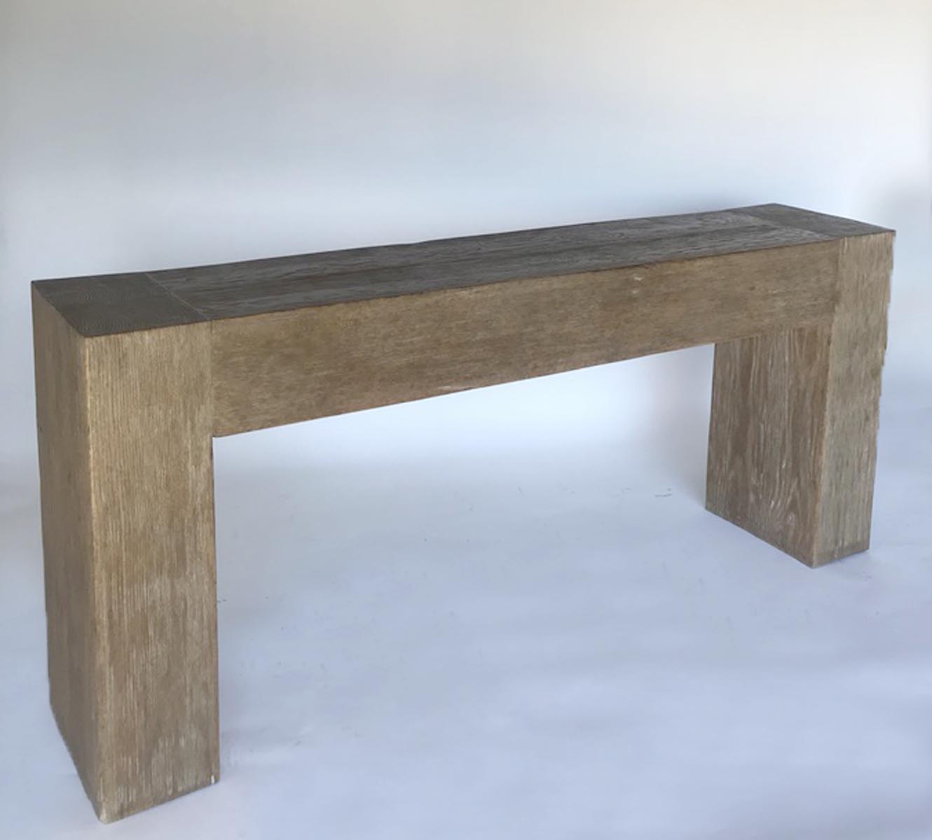 Waterfall console made from reclaimed 7.5 inch thick, solid wood. Modern clean lines, yet rustic. Natural wear to wood but finished and sealed for a smooth finish.