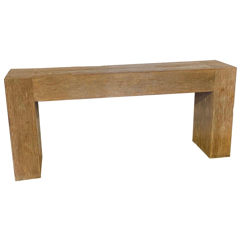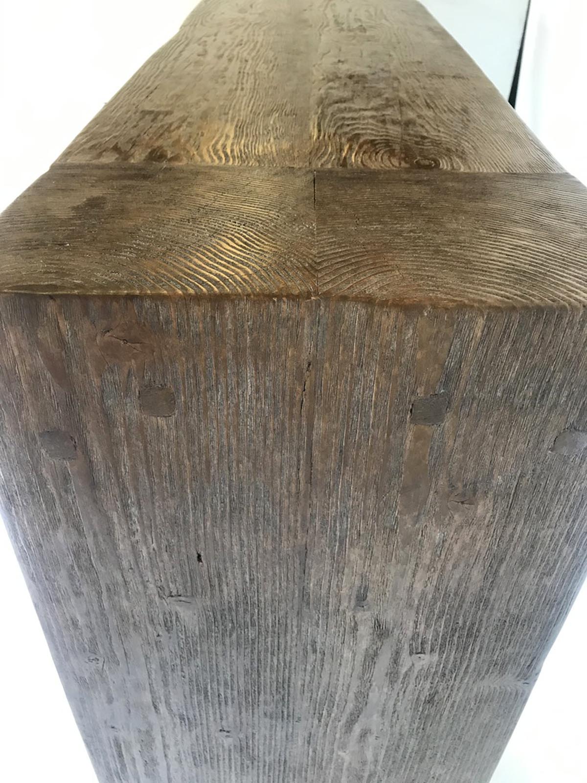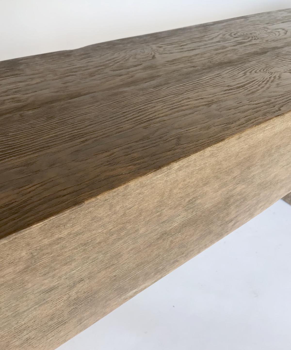 Waterfall console made from reclaimed 7.5 inch thick, solid wood. Modern clean lines, yet rustic. Natural wear to wood but finished and sealed for a smooth finish.