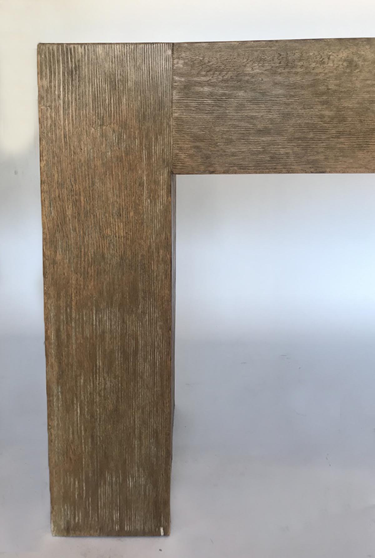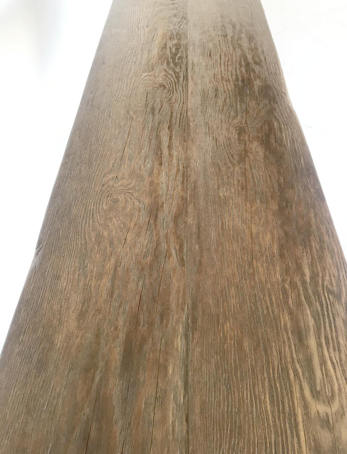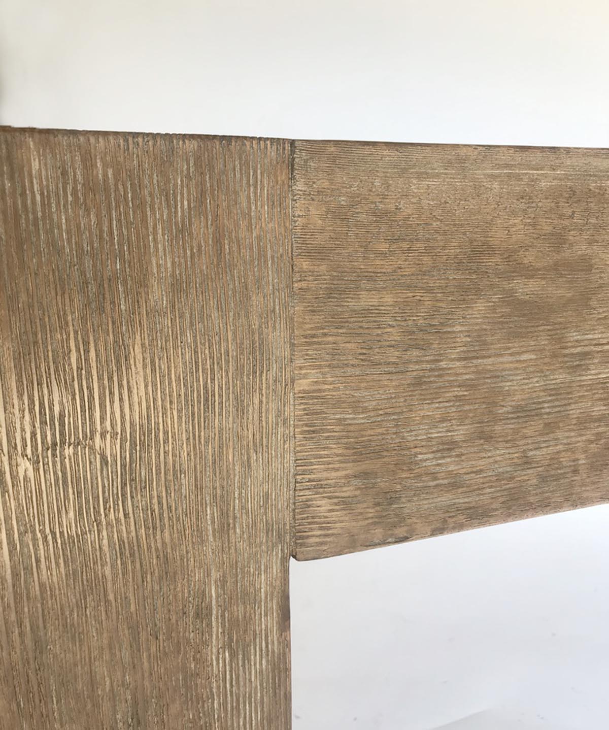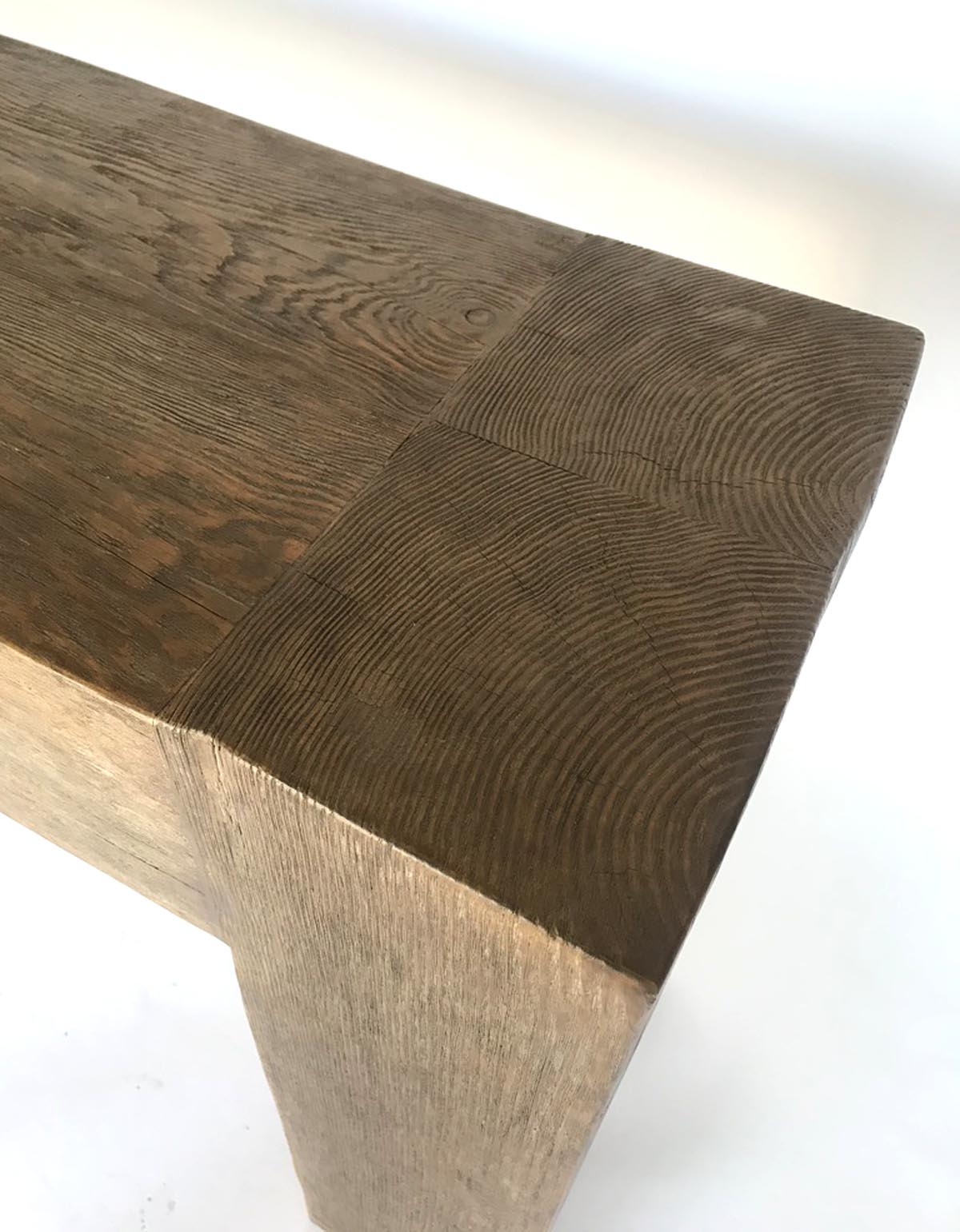 Waterfall console made from reclaimed 7.5 inch thick, solid wood. Modern clean lines, yet rustic. Natural wear to wood but finished and sealed for a smooth finish.