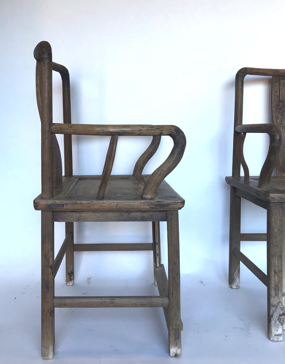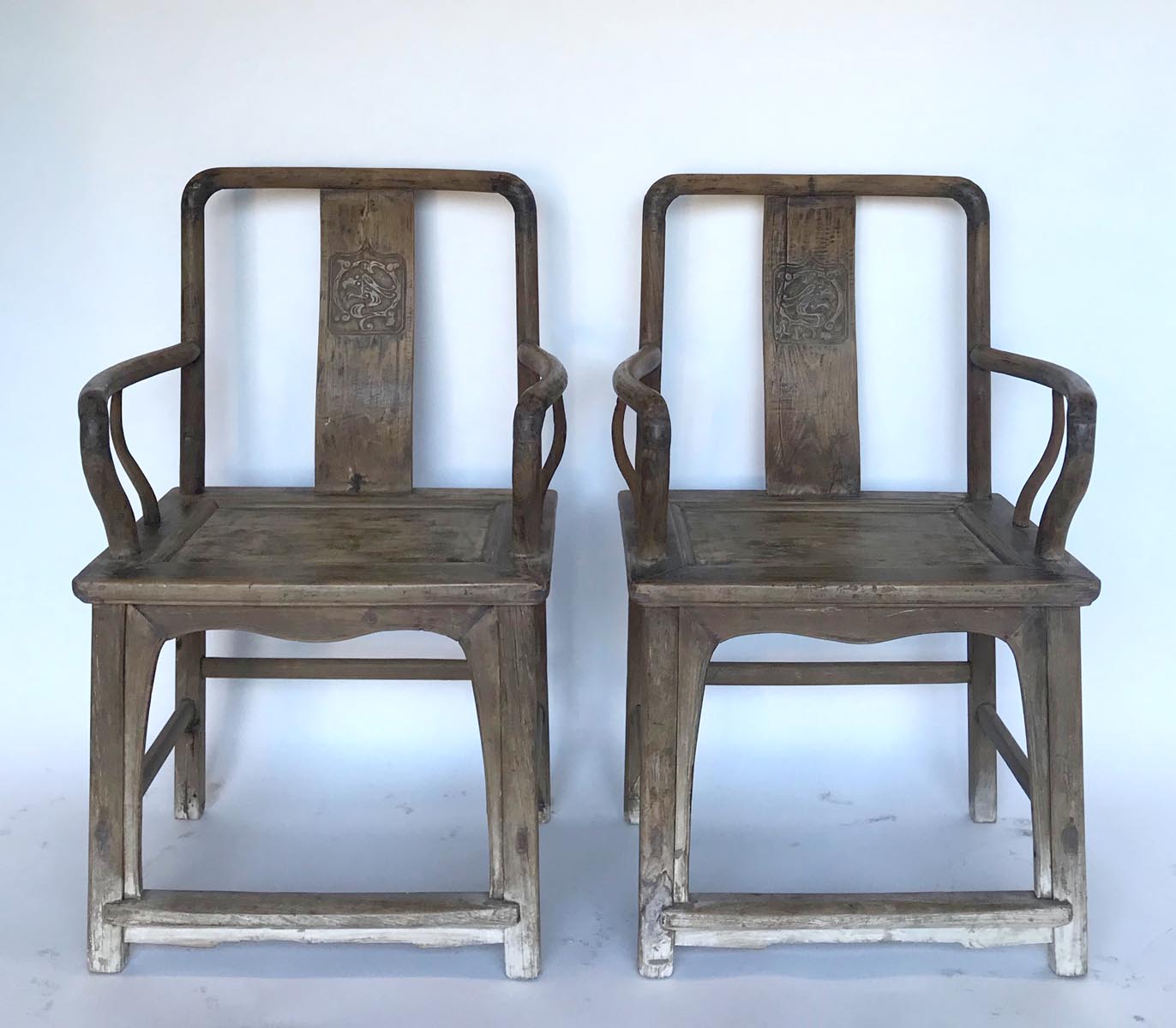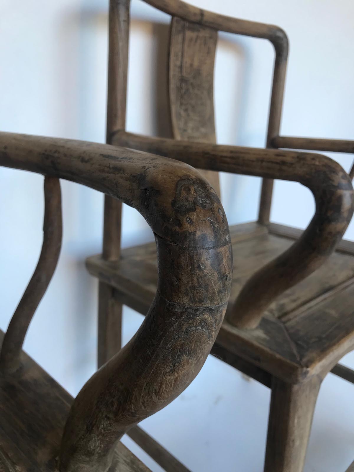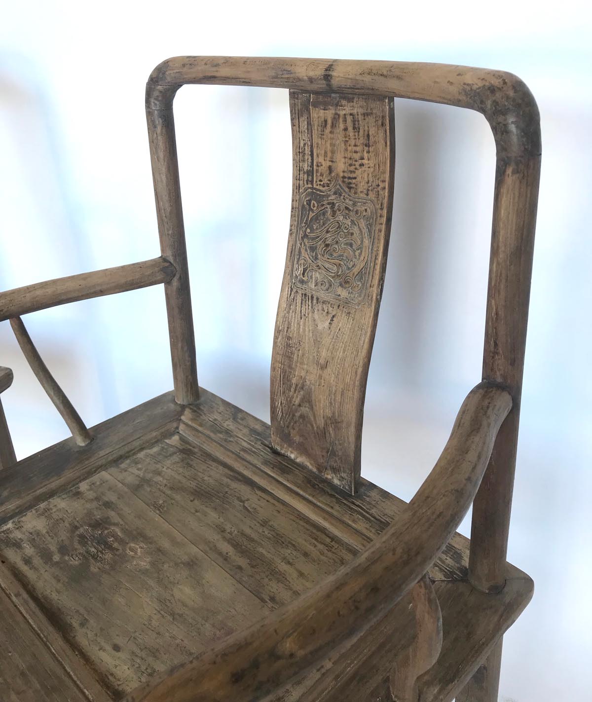 Chinese Qing dynasty chairs in light Elm. Mid 19th century construction featuring mortise and tenon joinery and wooden nails. Elegant craftsmanship the detail of the detail of curved arms. All parts of the chairs are smooth and have a natural patina. There are some old small remnants of black paint. Old repairs do not detract from the overall beauty of these chairs. The backs have a carving that is a stylized dragon. Priced and sold as a pair.