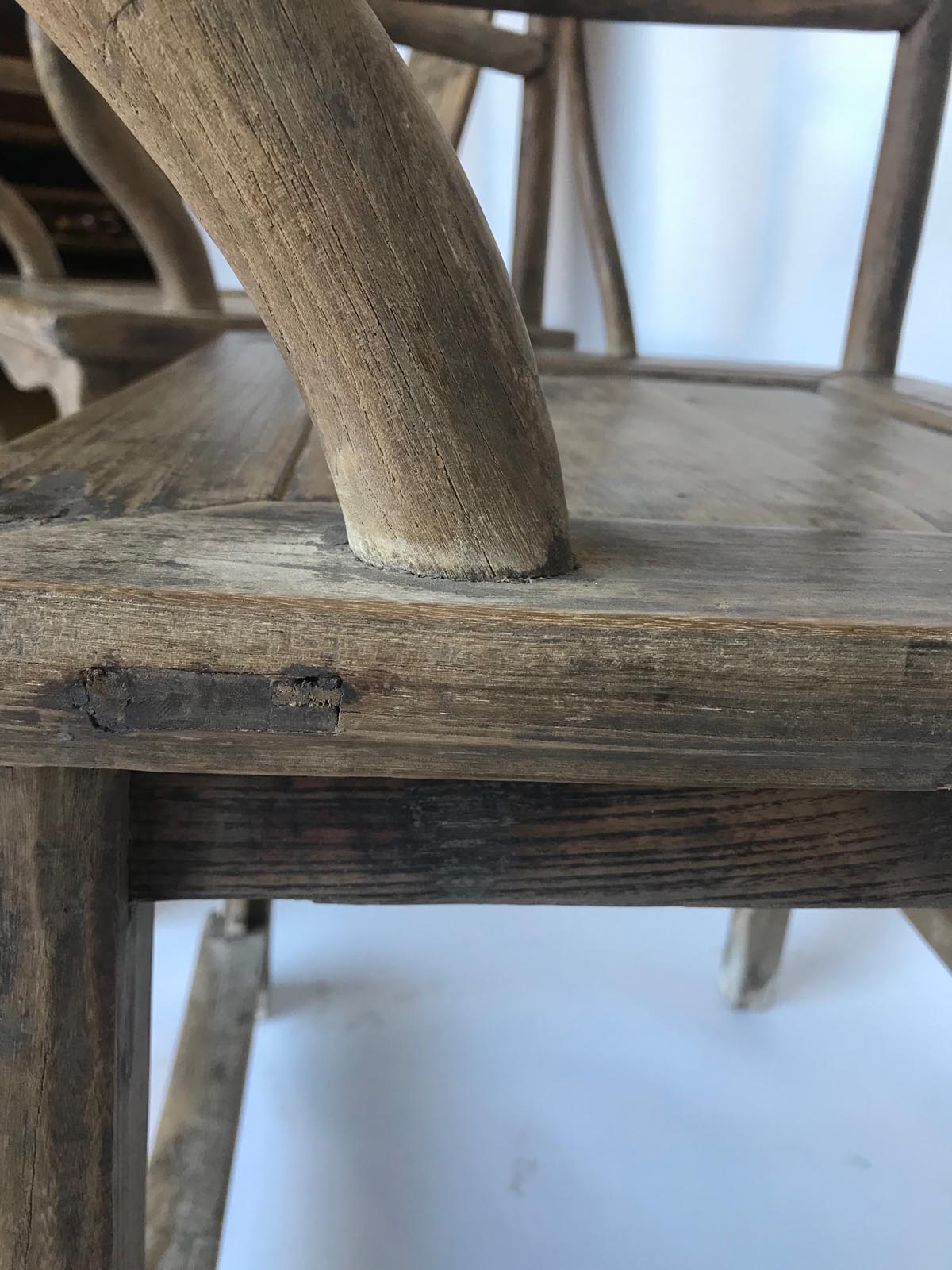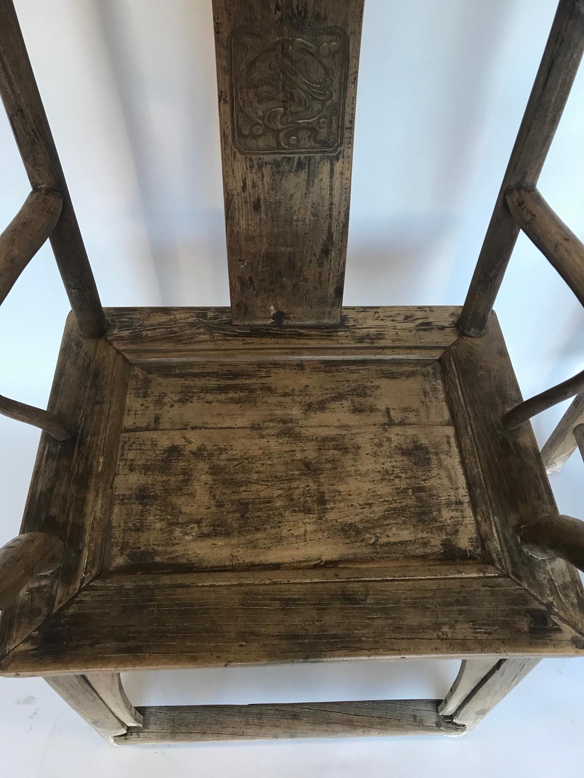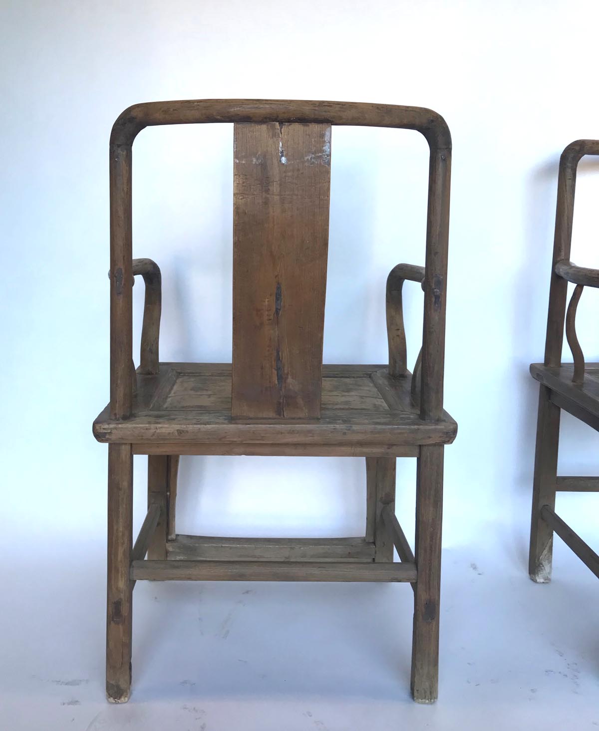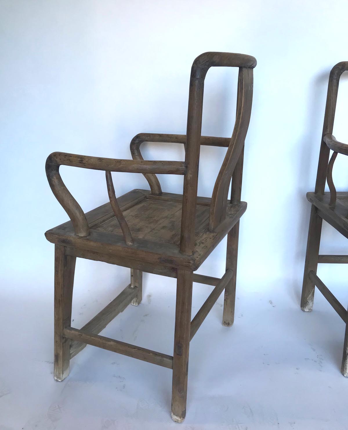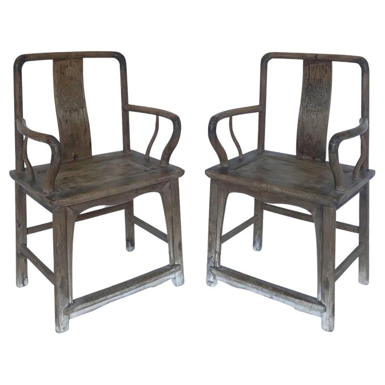 Chinese Qing dynasty chairs in light Elm. Mid 19th century construction featuring mortise and tenon joinery and wooden nails. Elegant craftsmanship the detail of the detail of curved arms. All parts of the chairs are smooth and have a natural patina. There are some old small remnants of black paint. Old repairs do not detract from the overall beauty of these chairs. The backs have a carving that is a stylized dragon. Priced and sold as a pair.
