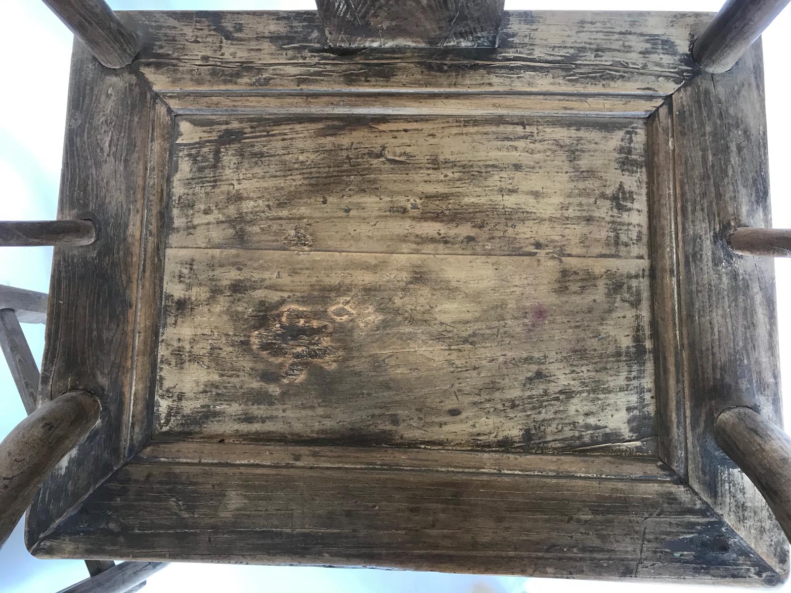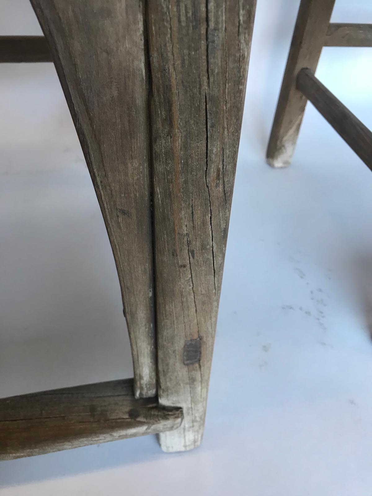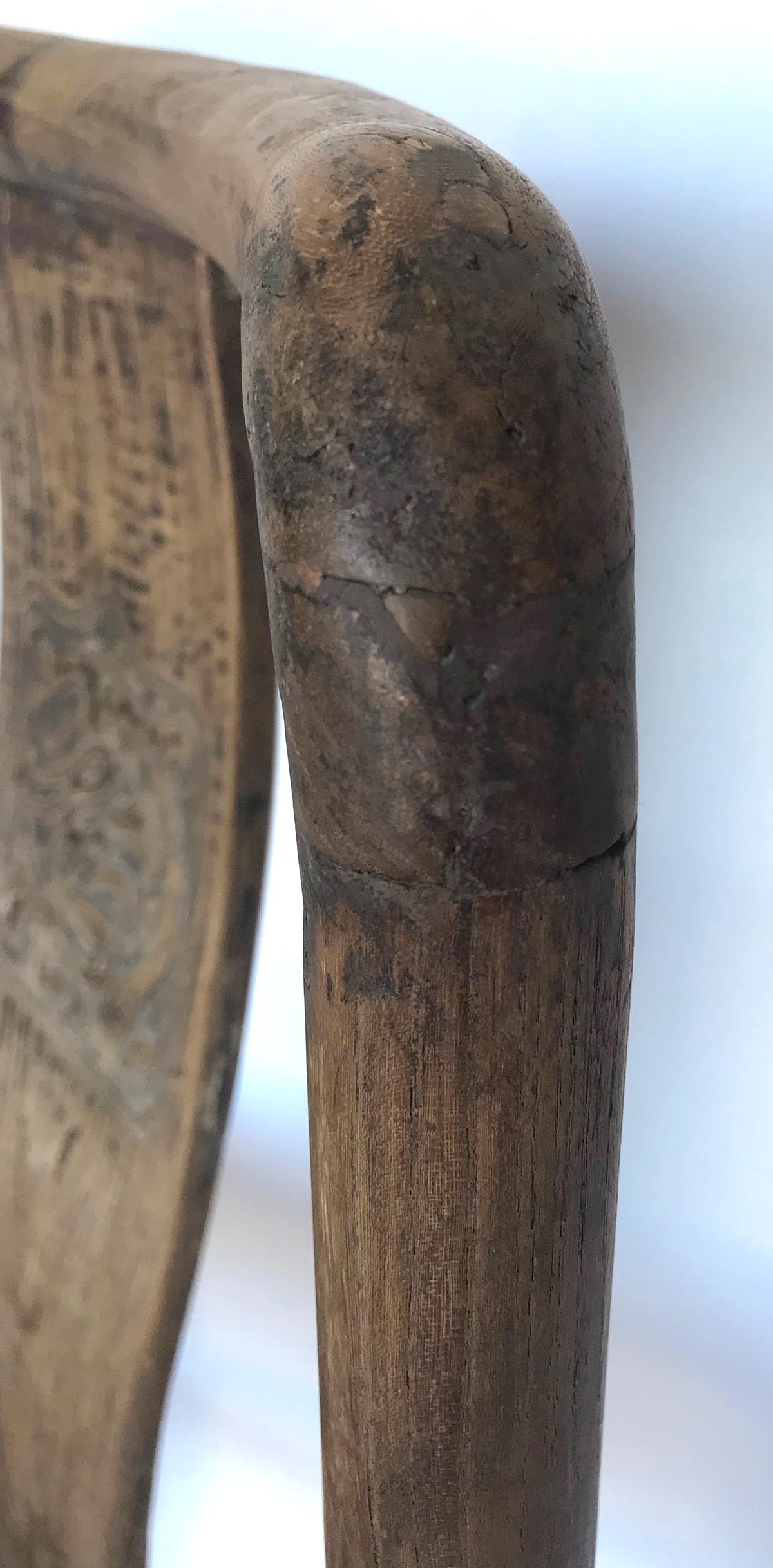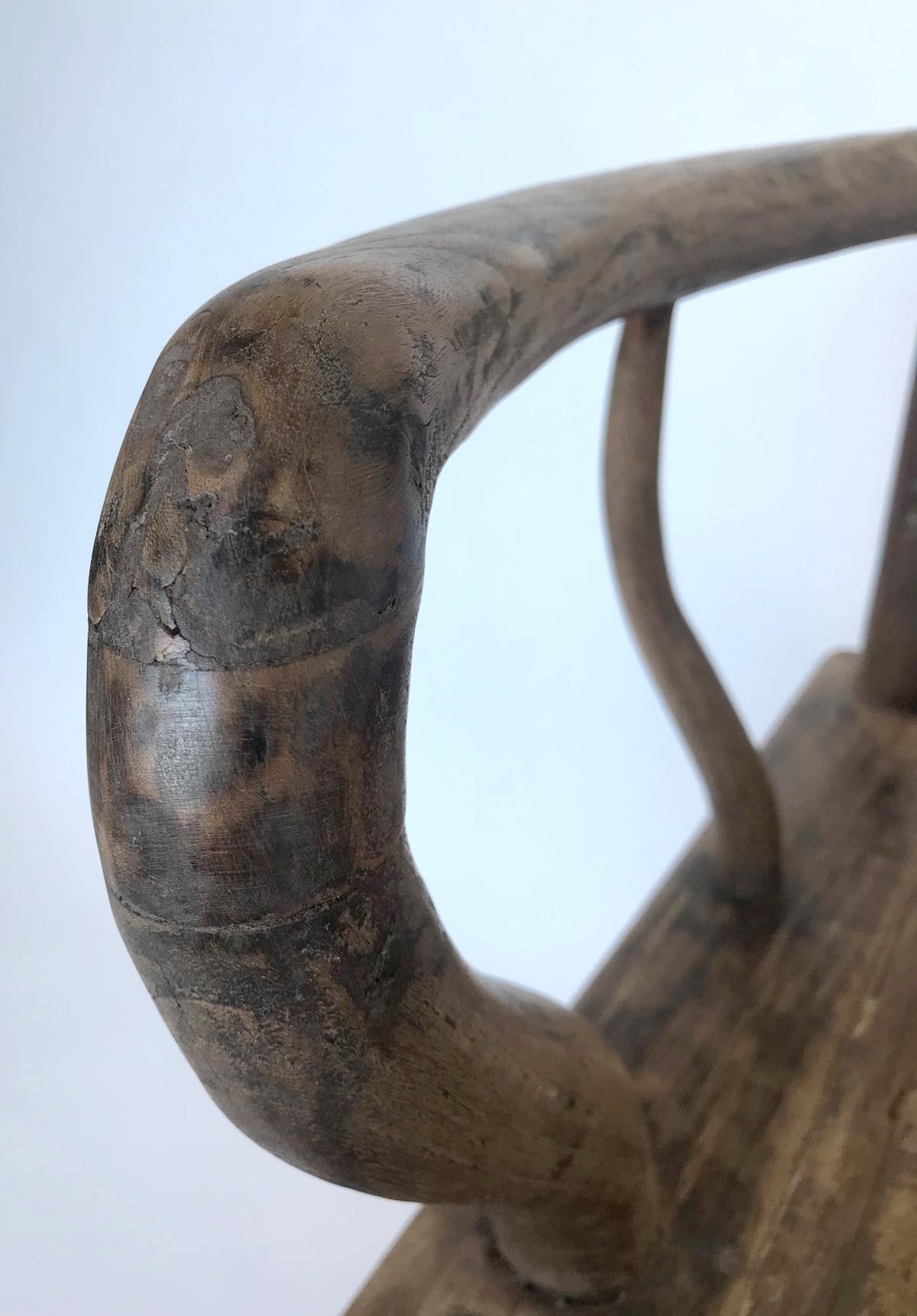 Chinese Qing dynasty chairs in light Elm. Mid 19th century construction featuring mortise and tenon joinery and wooden nails. Elegant craftsmanship the detail of the detail of curved arms. All parts of the chairs are smooth and have a natural patina. There are some old small remnants of black paint. Old repairs do not detract from the overall beauty of these chairs. The backs have a carving that is a stylized dragon. Priced and sold as a pair.