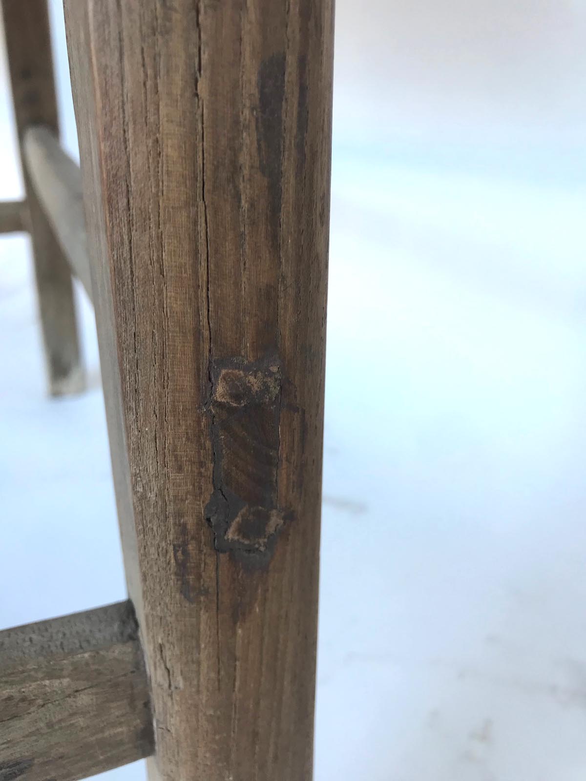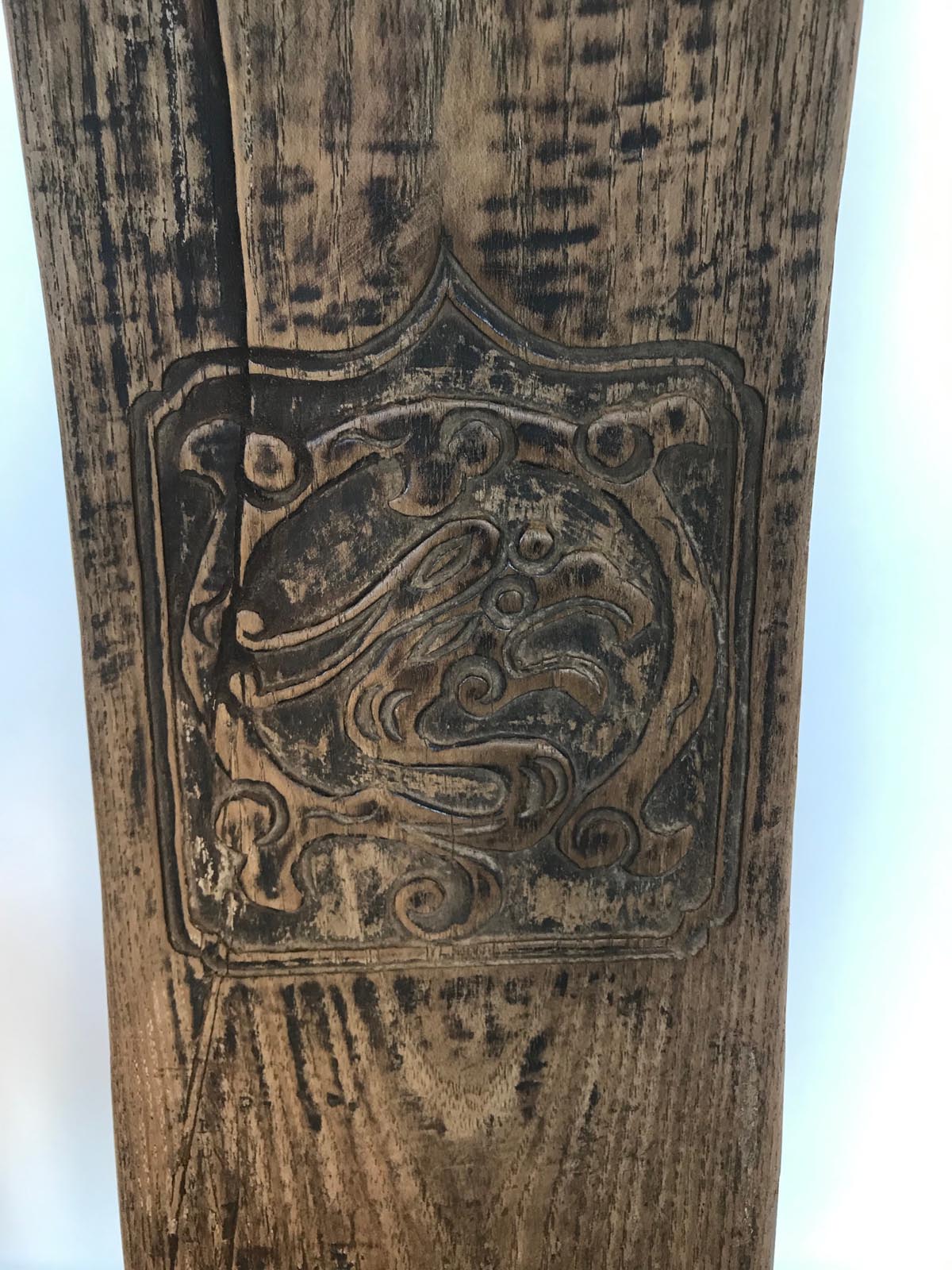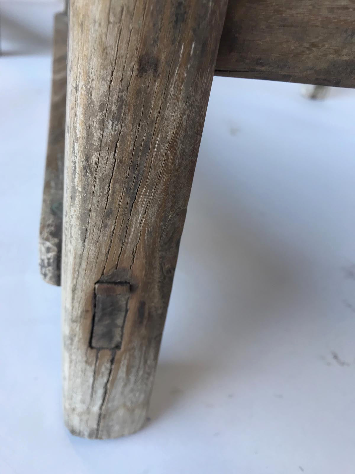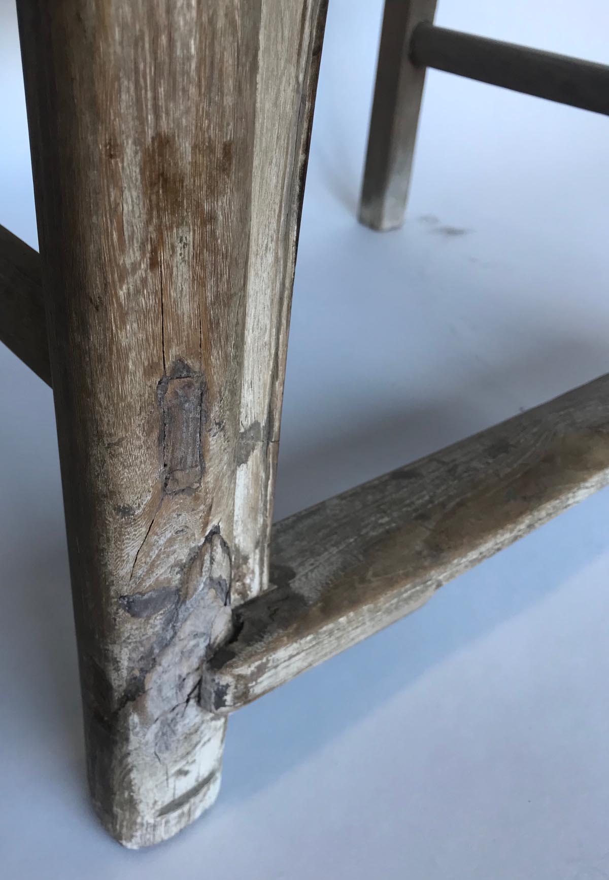 Chinese Qing dynasty chairs in light Elm. Mid 19th century construction featuring mortise and tenon joinery and wooden nails. Elegant craftsmanship the detail of the detail of curved arms. All parts of the chairs are smooth and have a natural patina. There are some old small remnants of black paint. Old repairs do not detract from the overall beauty of these chairs. The backs have a carving that is a stylized dragon. Priced and sold as a pair.
