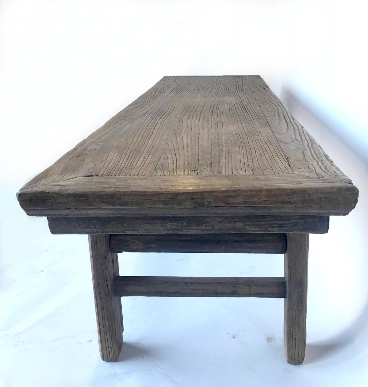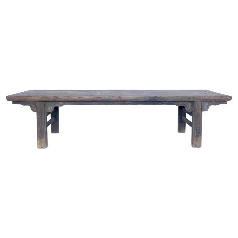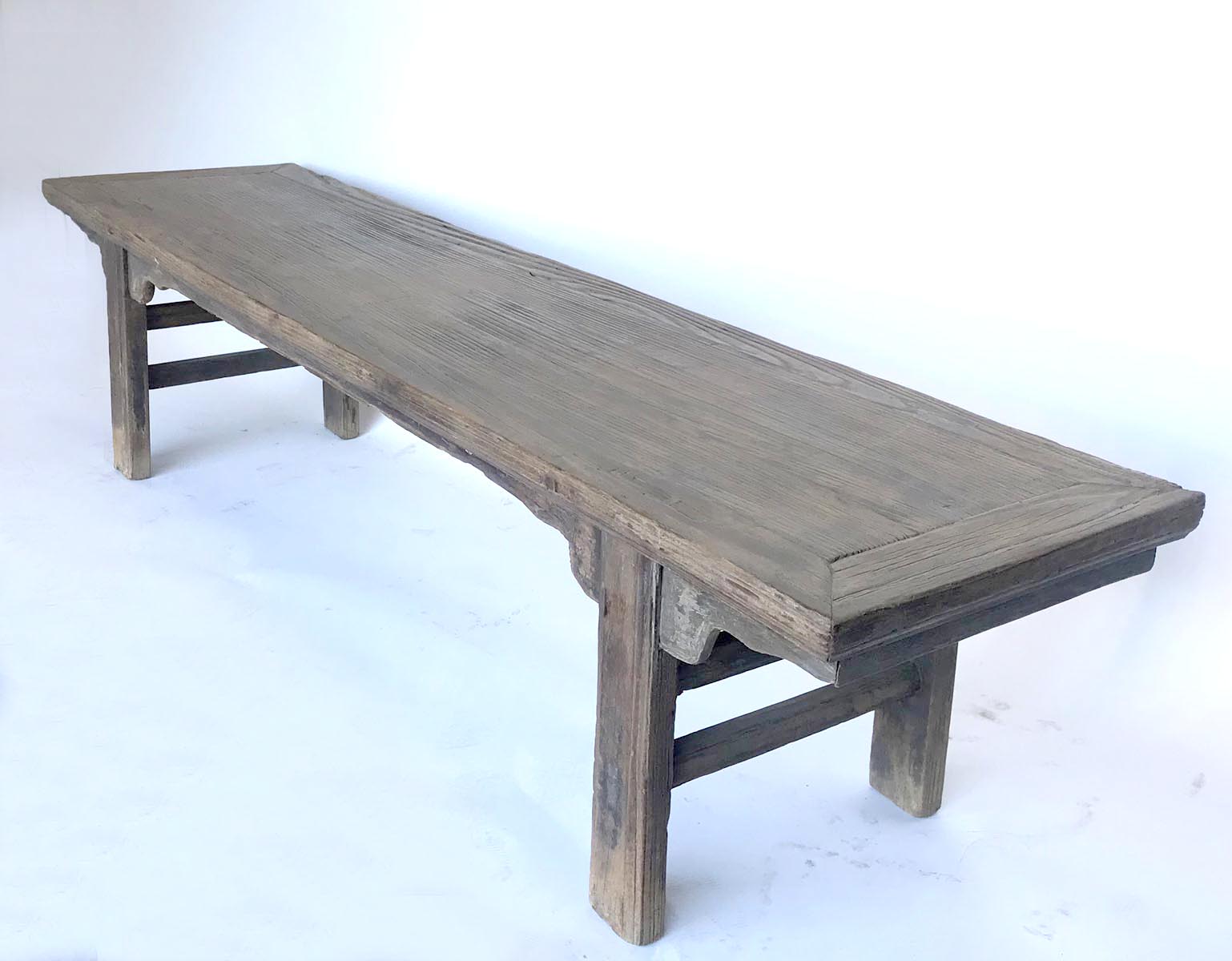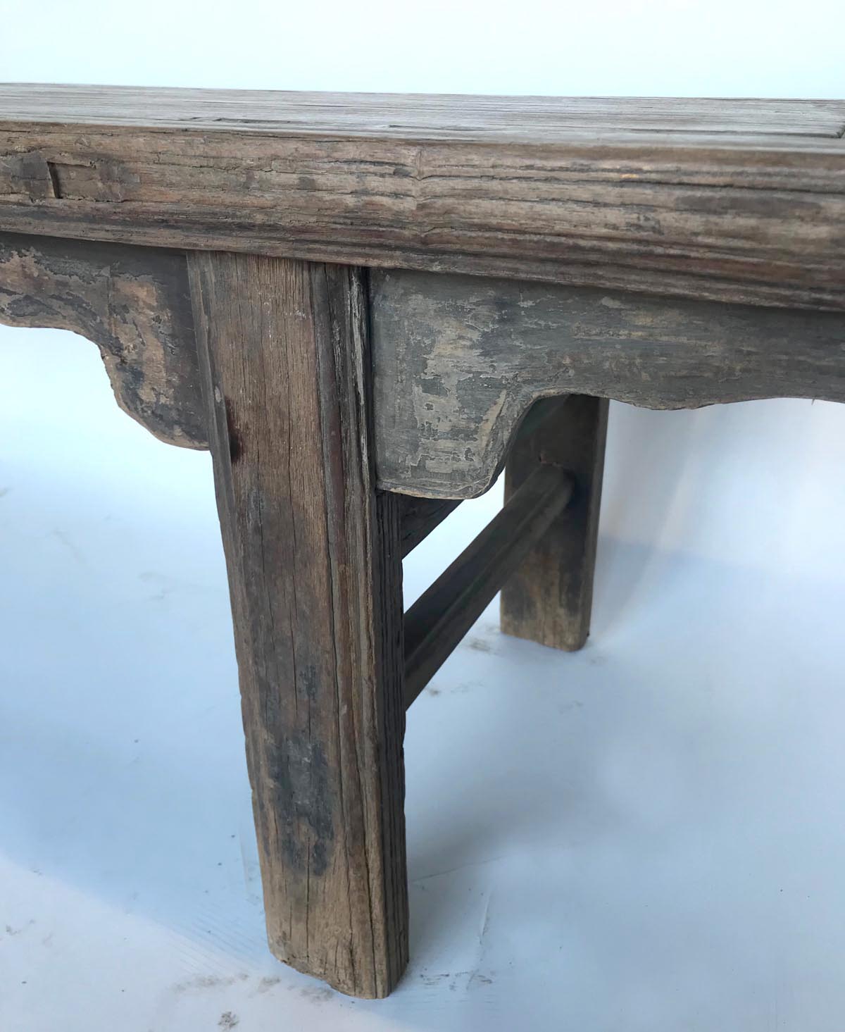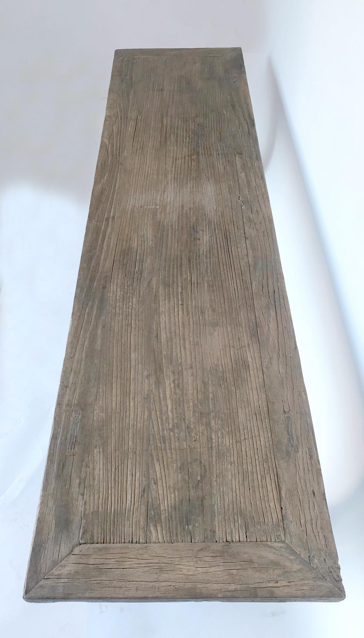 19th c. Chinese elm bench with framed seat. Pretty detailed carved apron. Rustic and elegant.