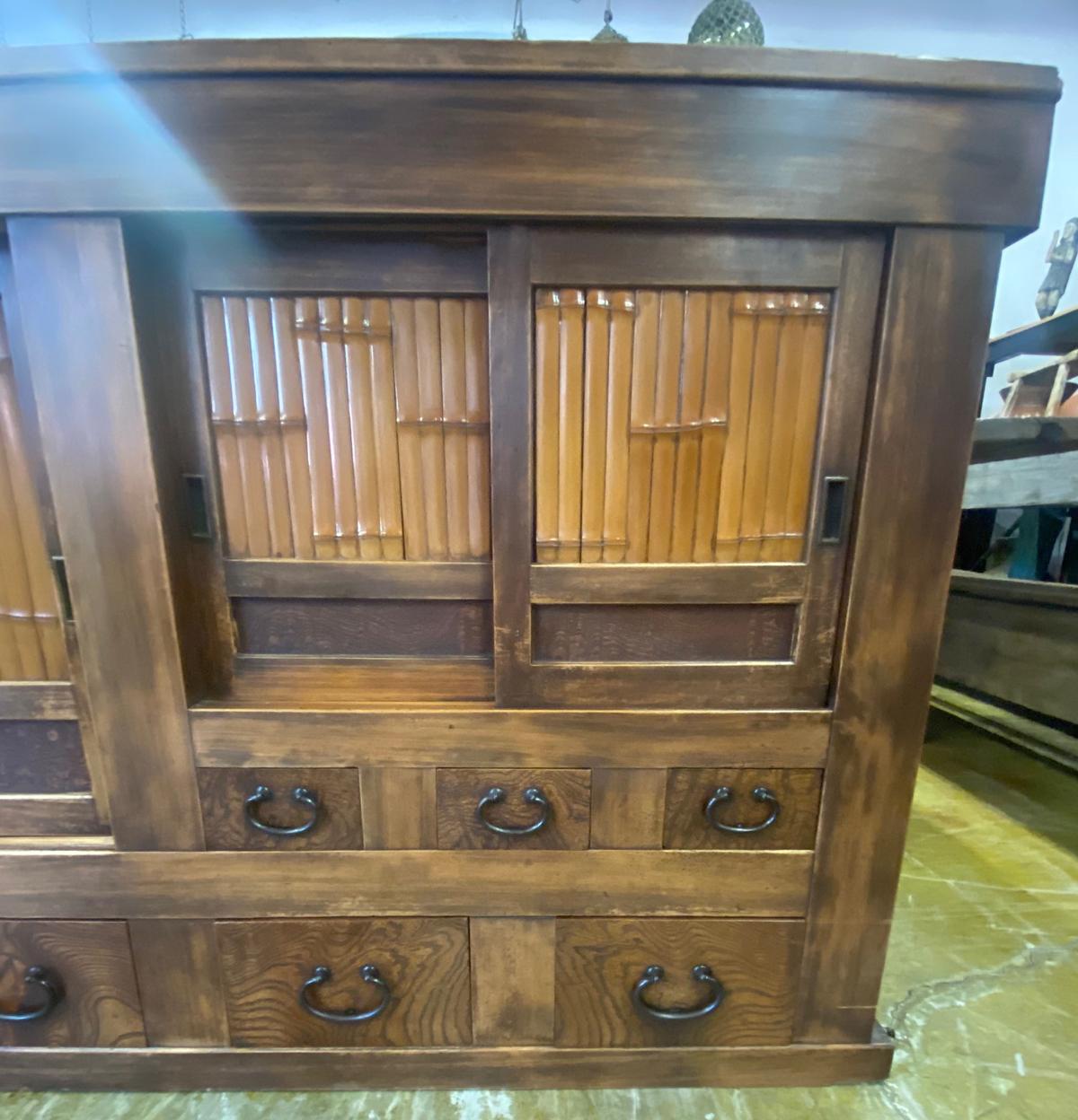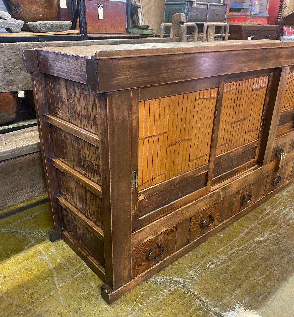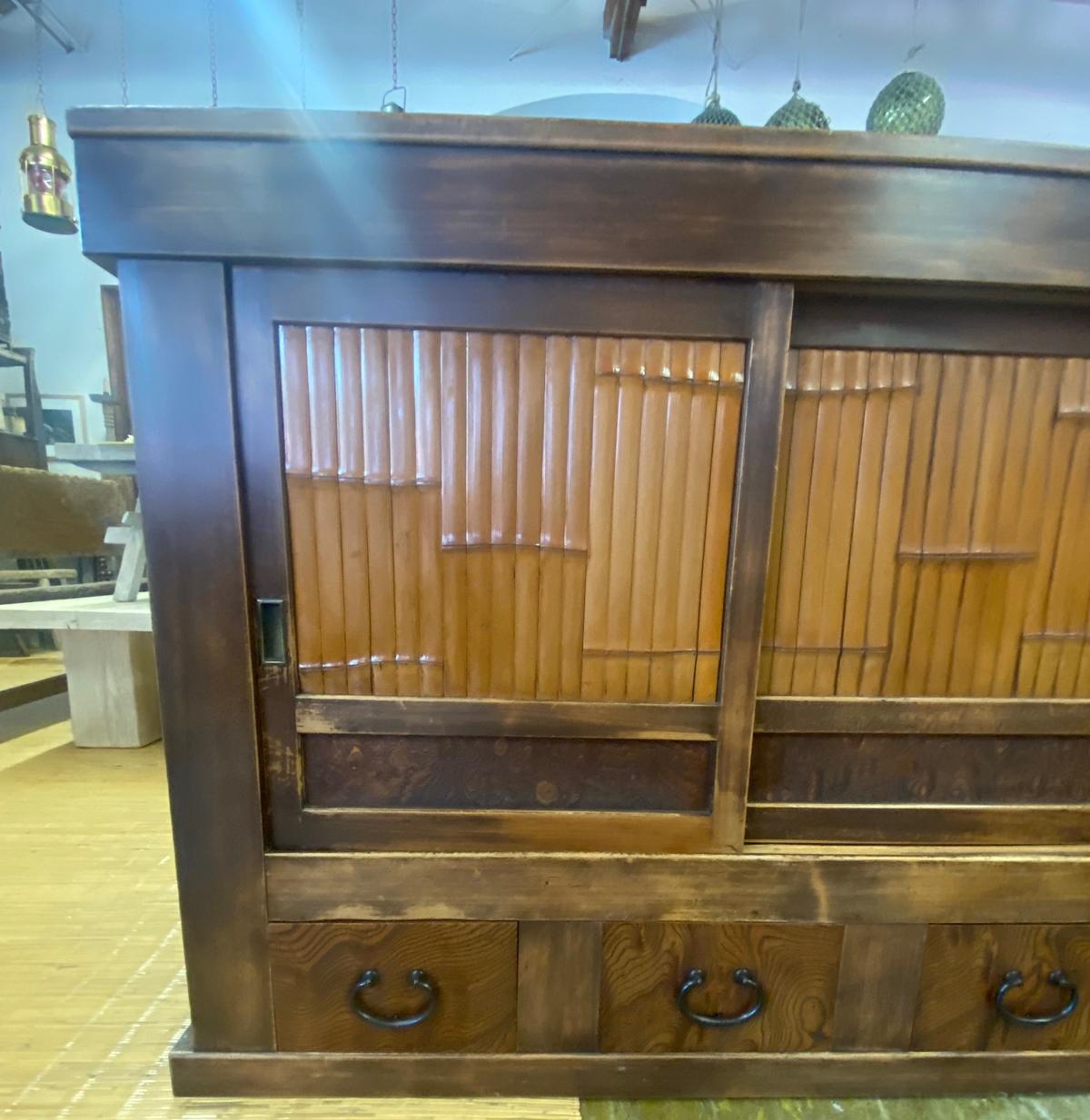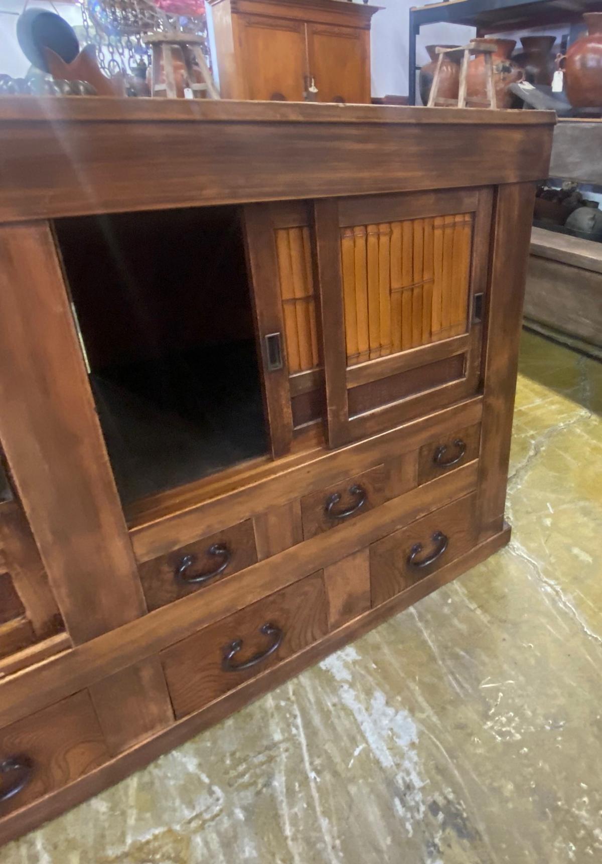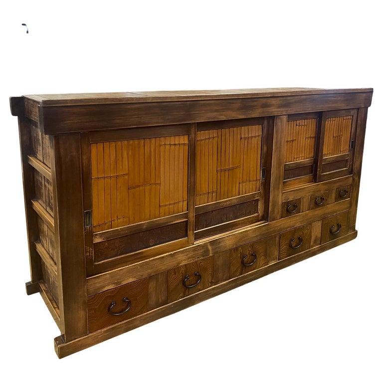 19th Century Shop Chest/Cabinet with Sliding Doors and Drawers. An unusual 19th century Japanese cabinet using bamboo and burled wood as design accents on the two sliding door sections and the drawers. The color of the wood variations of rich honey . This is a well constructed piece. Drawers have bamboo nails and work perfectly, as do the sliding doors. This is in very good condition considering its age and use. All hardware is original and forged iron. This cabinet is completely sturdy and functional.