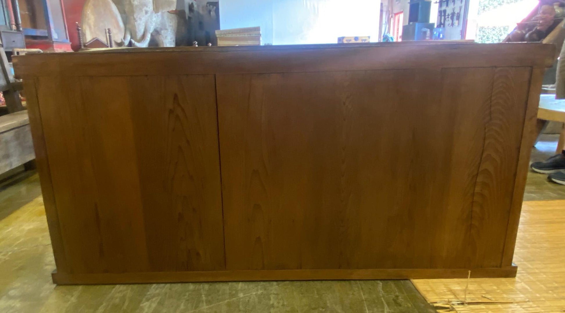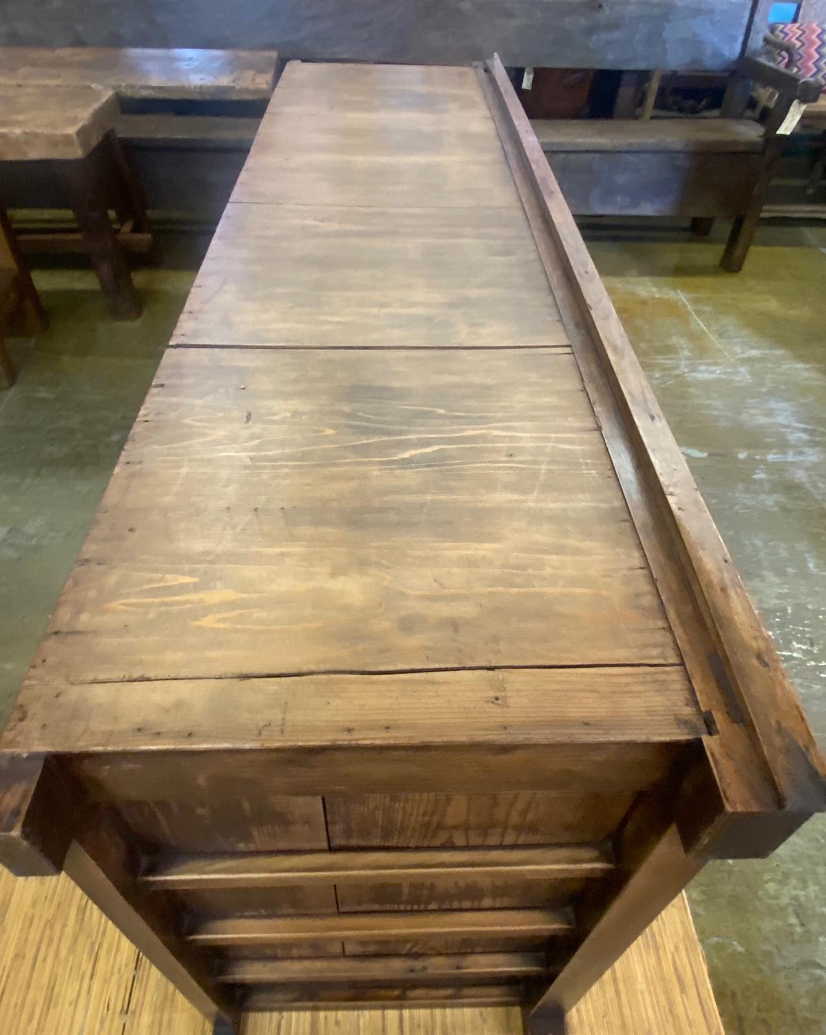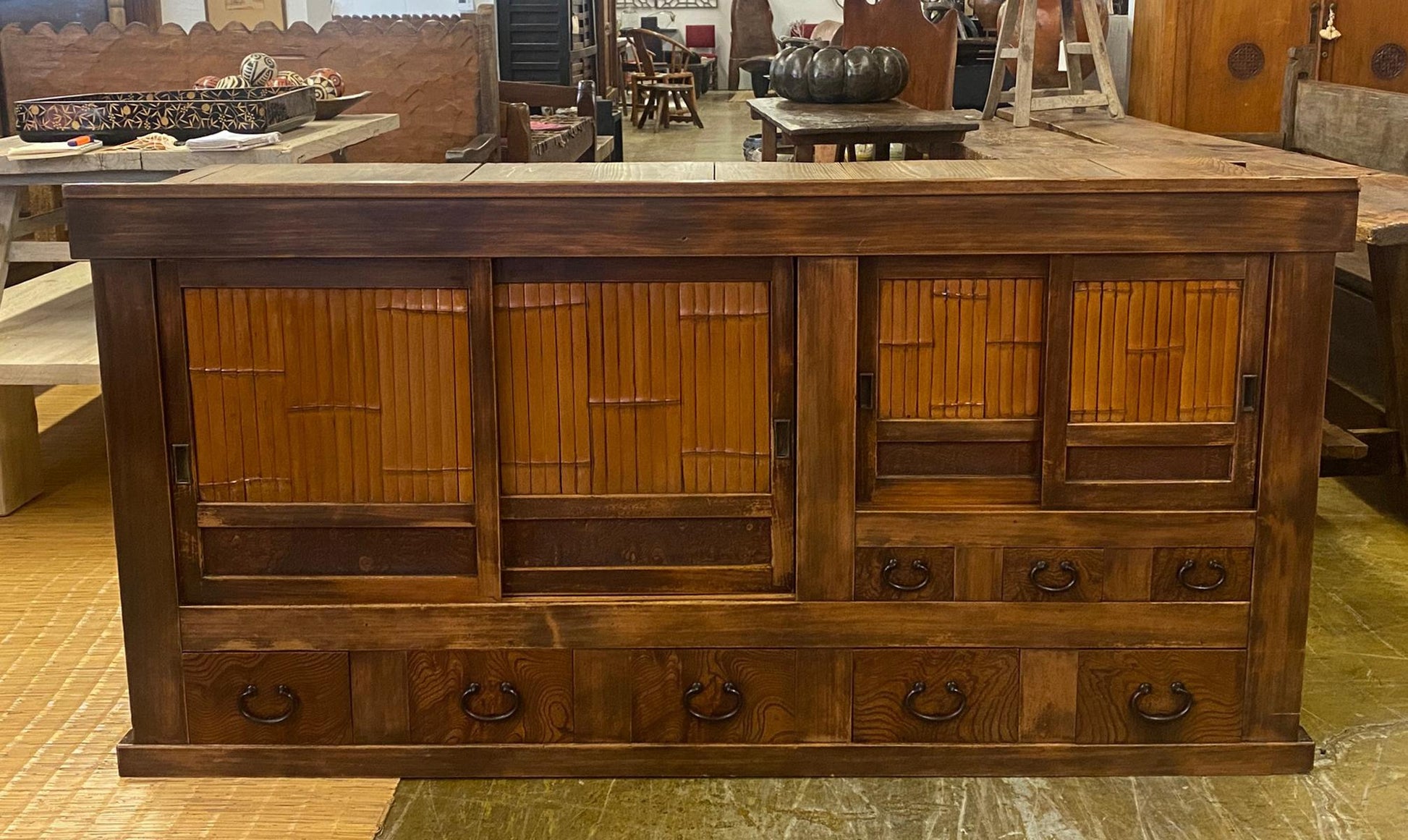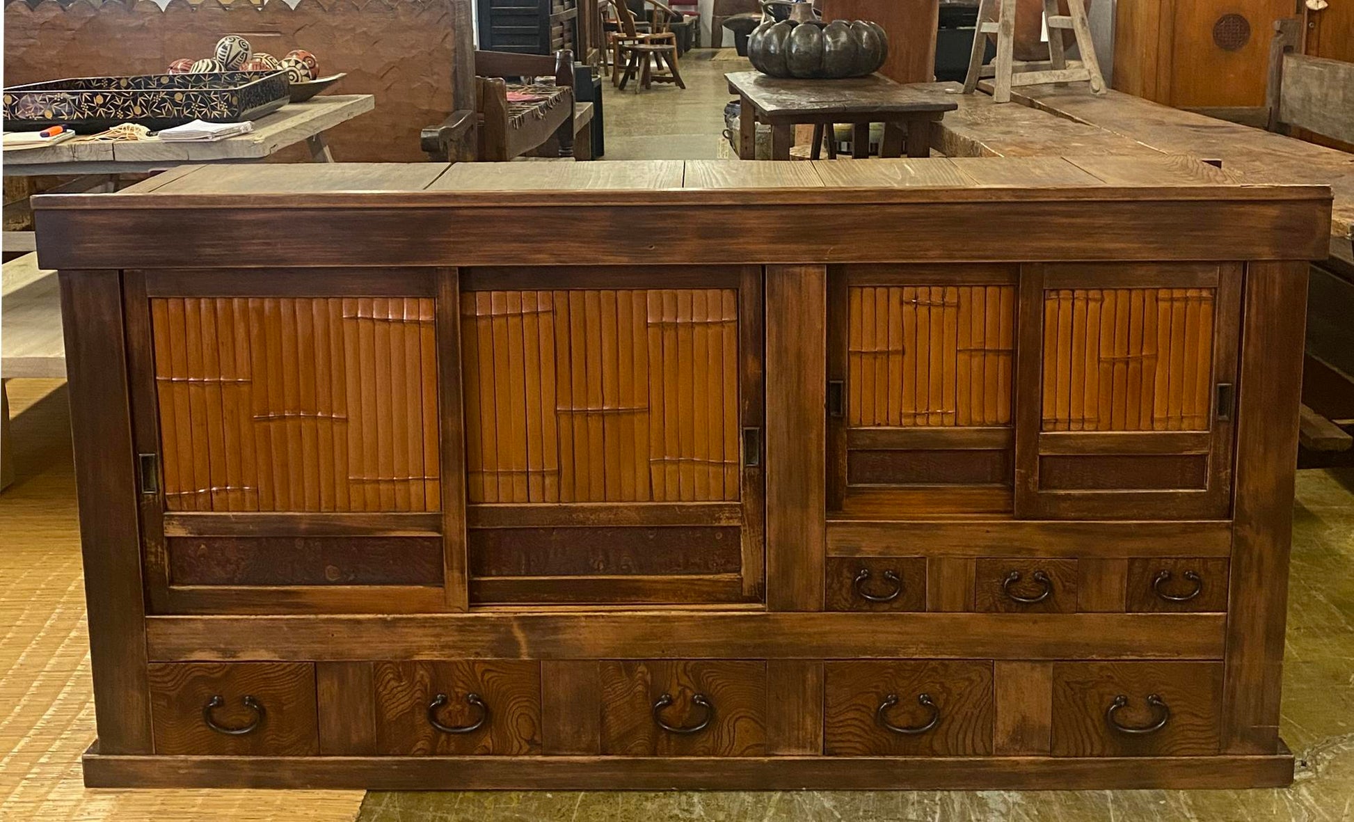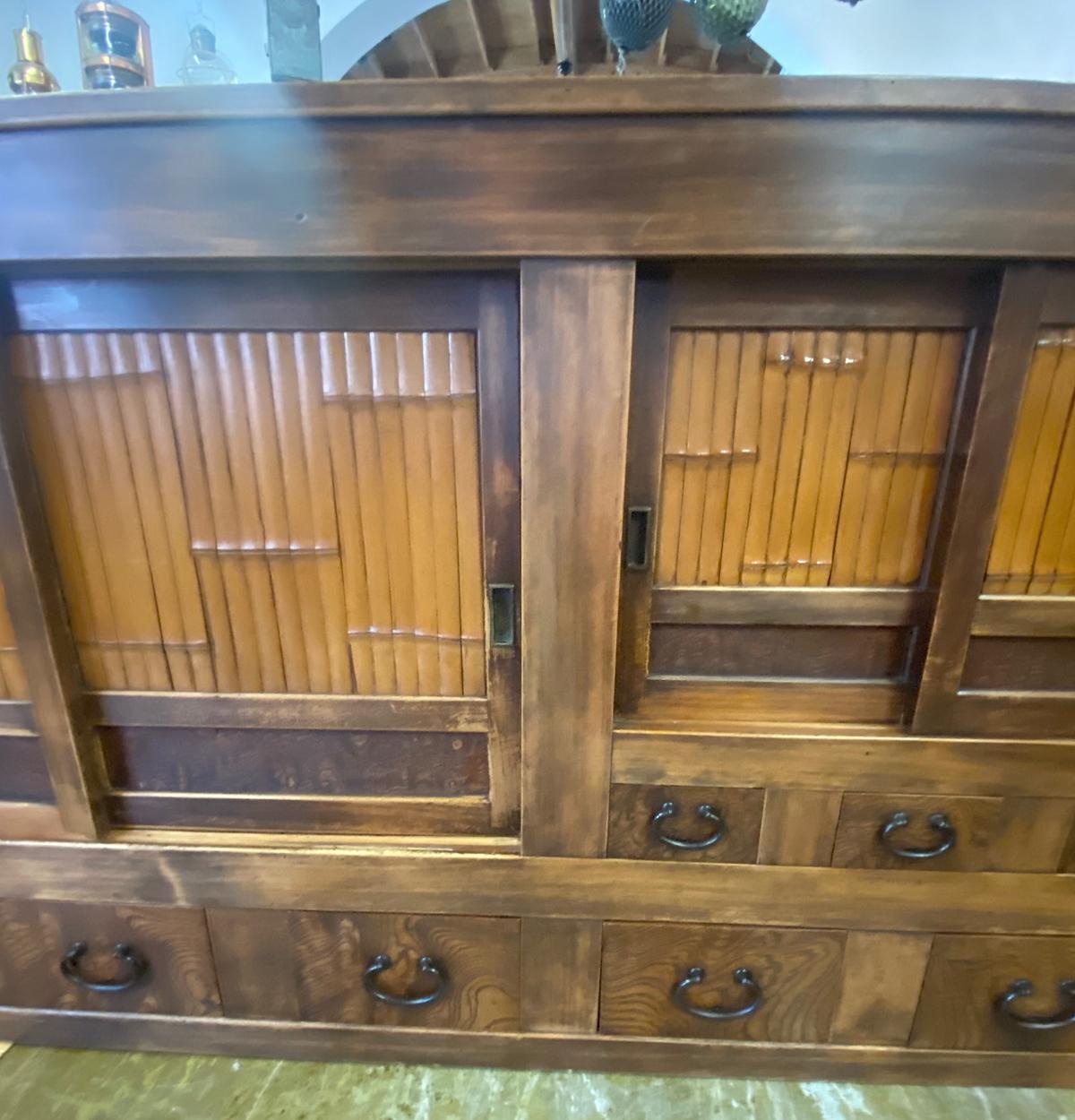 19th Century Shop Chest/Cabinet with Sliding Doors and Drawers. An unusual 19th century Japanese cabinet using bamboo and burled wood as design accents on the two sliding door sections and the drawers. The color of the wood variations of rich honey . This is a well constructed piece. Drawers have bamboo nails and work perfectly, as do the sliding doors. This is in very good condition considering its age and use. All hardware is original and forged iron. This cabinet is completely sturdy and functional.