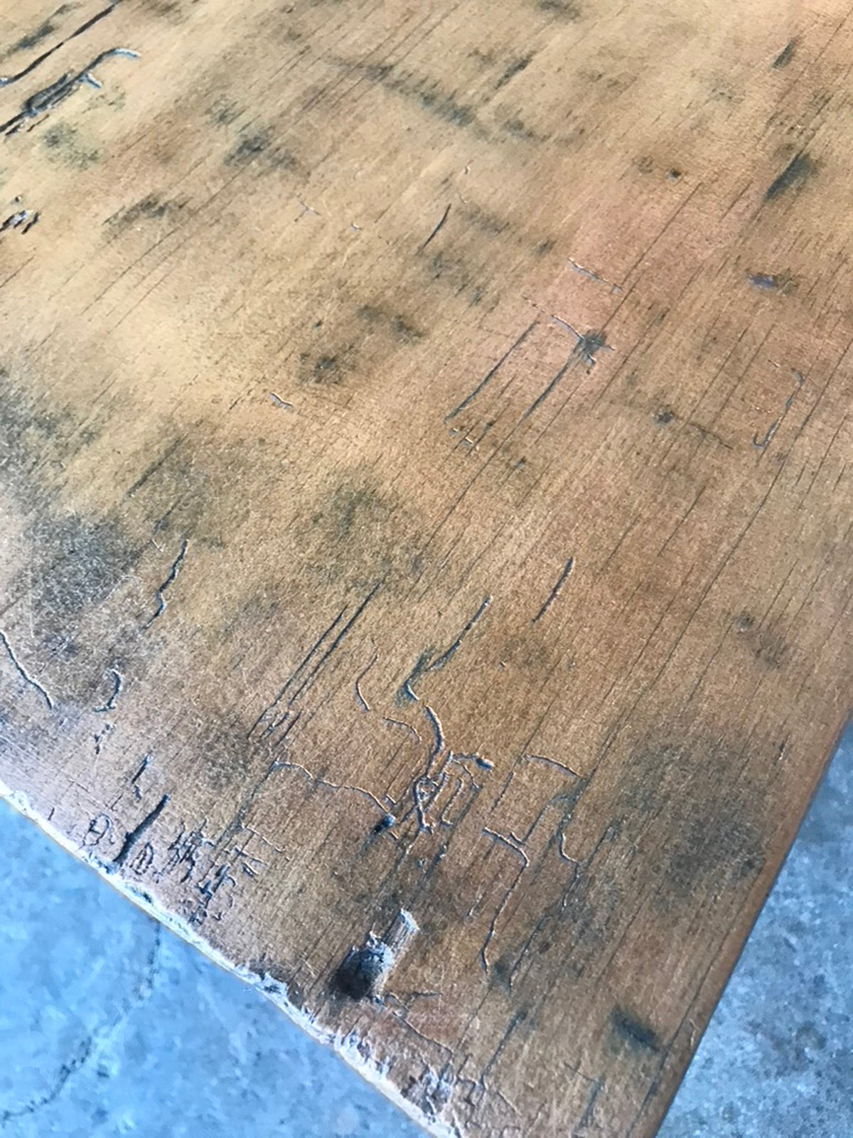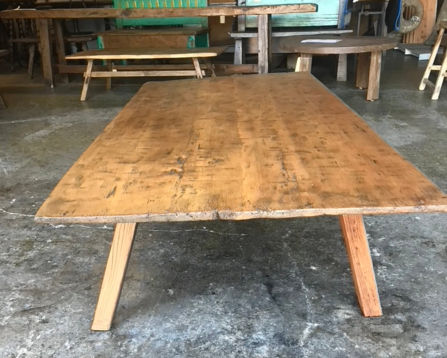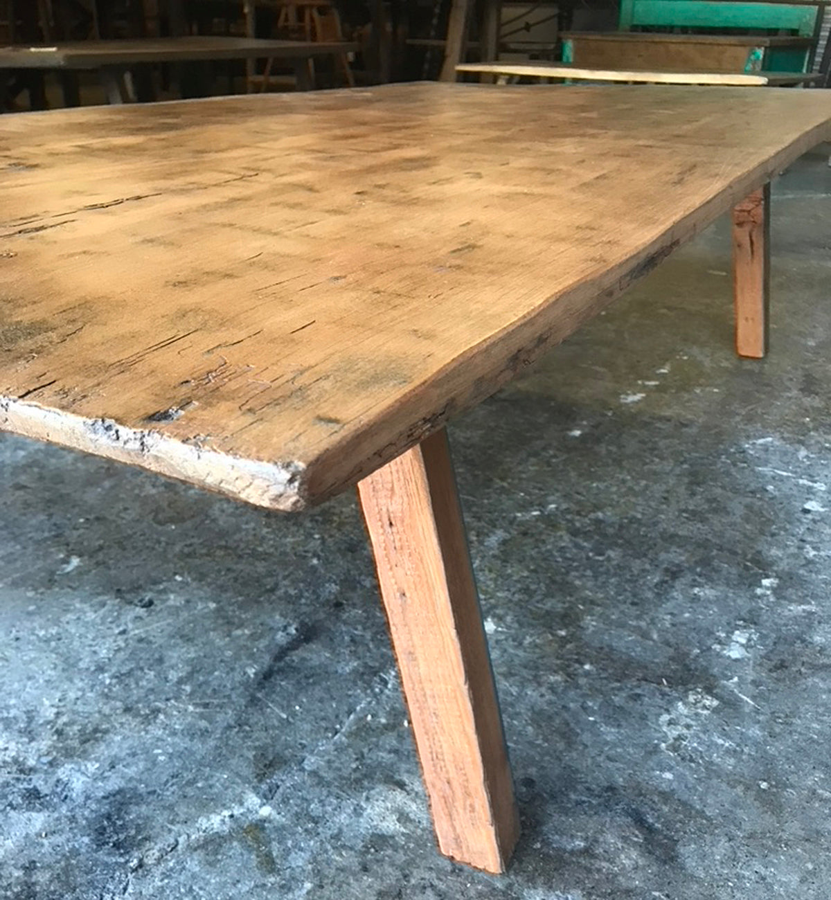 Rustic coffee table consisting of an antique, hand hewn, one wide board from Guatemala, atop contemporary legs, finished to match the top. The top has great patina and interest. It shows age appropriate wear, please see close up photos. Construction is new and sturdy