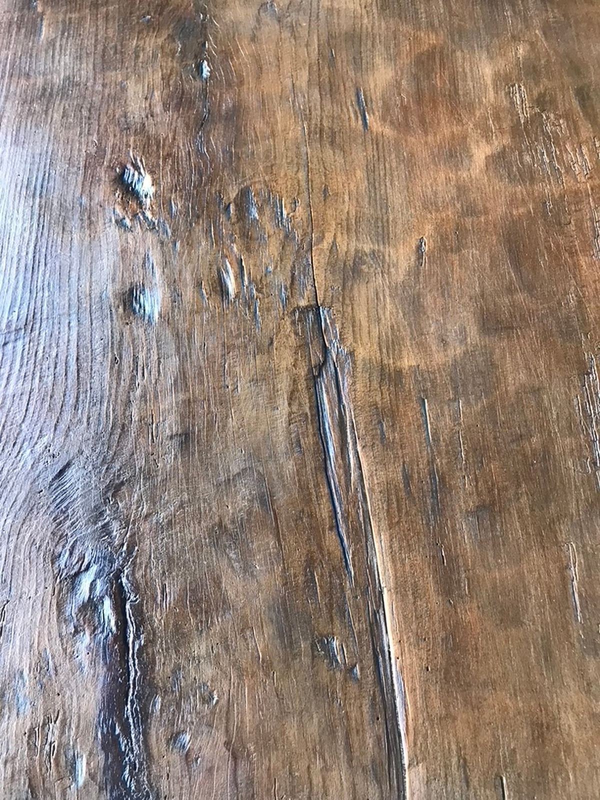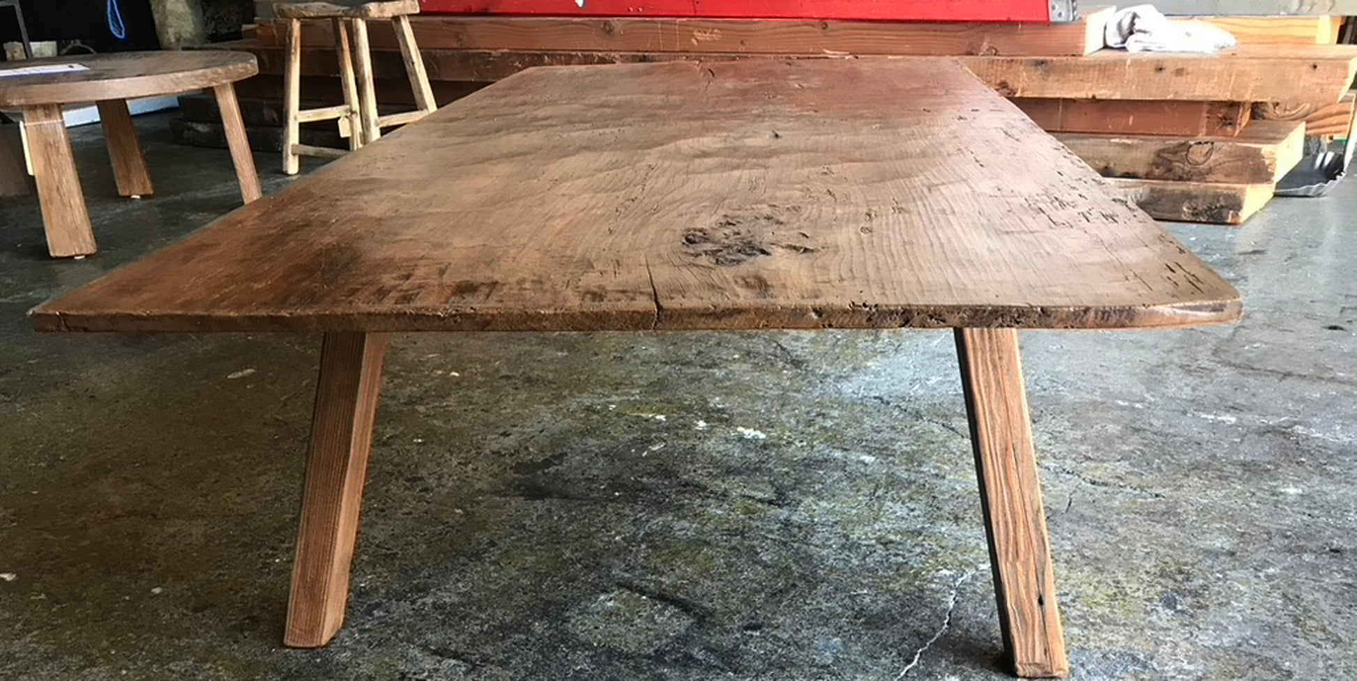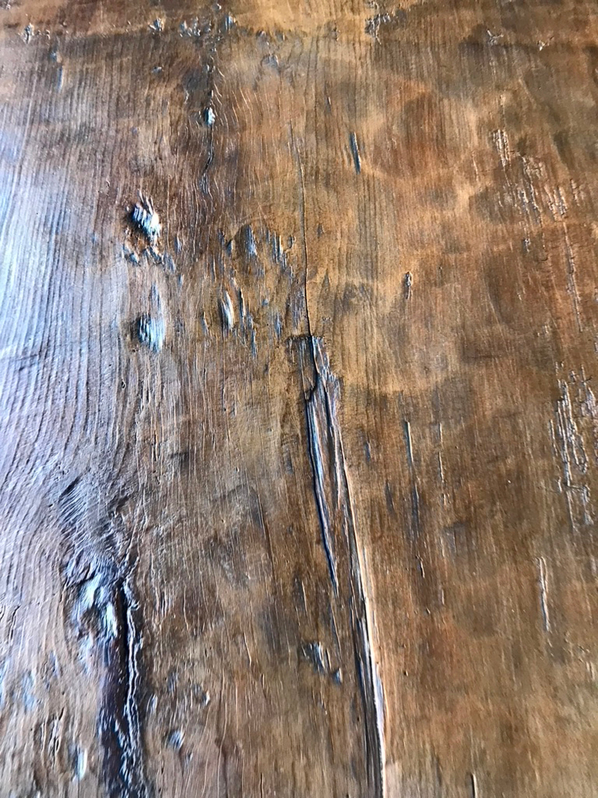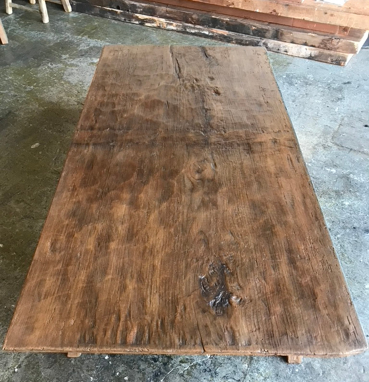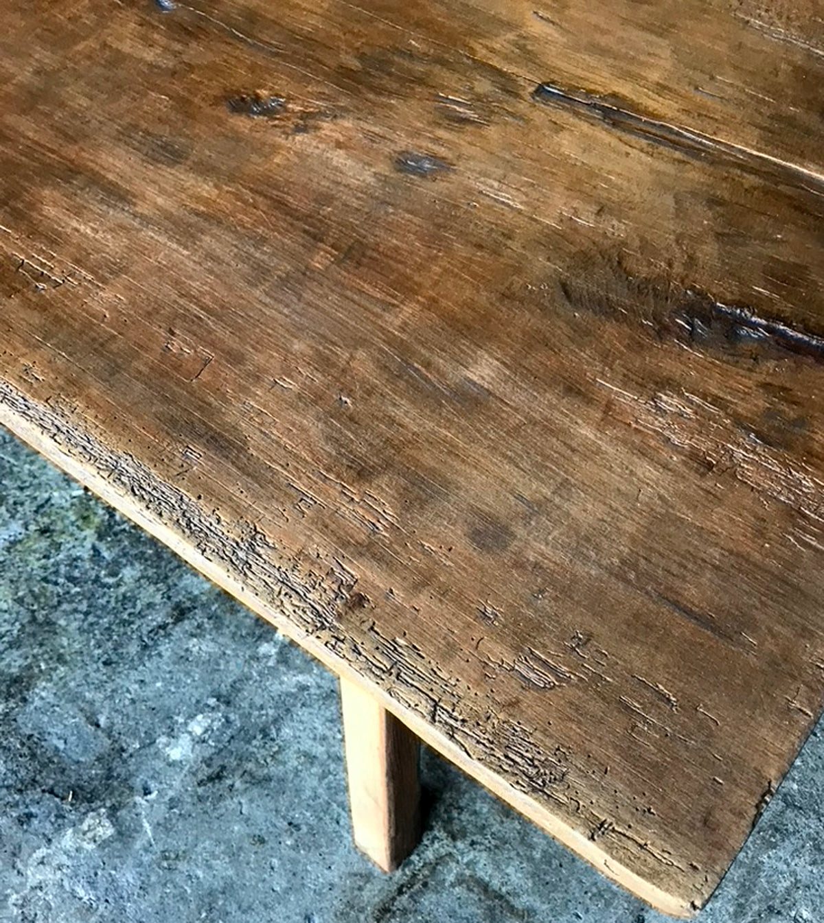 This coffee table consists of an old, hand-hewn top on new legs, finished to match the top. The wood has, age appropriate wear in a range of colors, all naturally distressed wit a smooth patina. This one wide piece of wood was at some part used on another piece of furniture, possibly an old grain bin, as you can see where the original hardware would have been. Beautiful, rustic and interesting!
