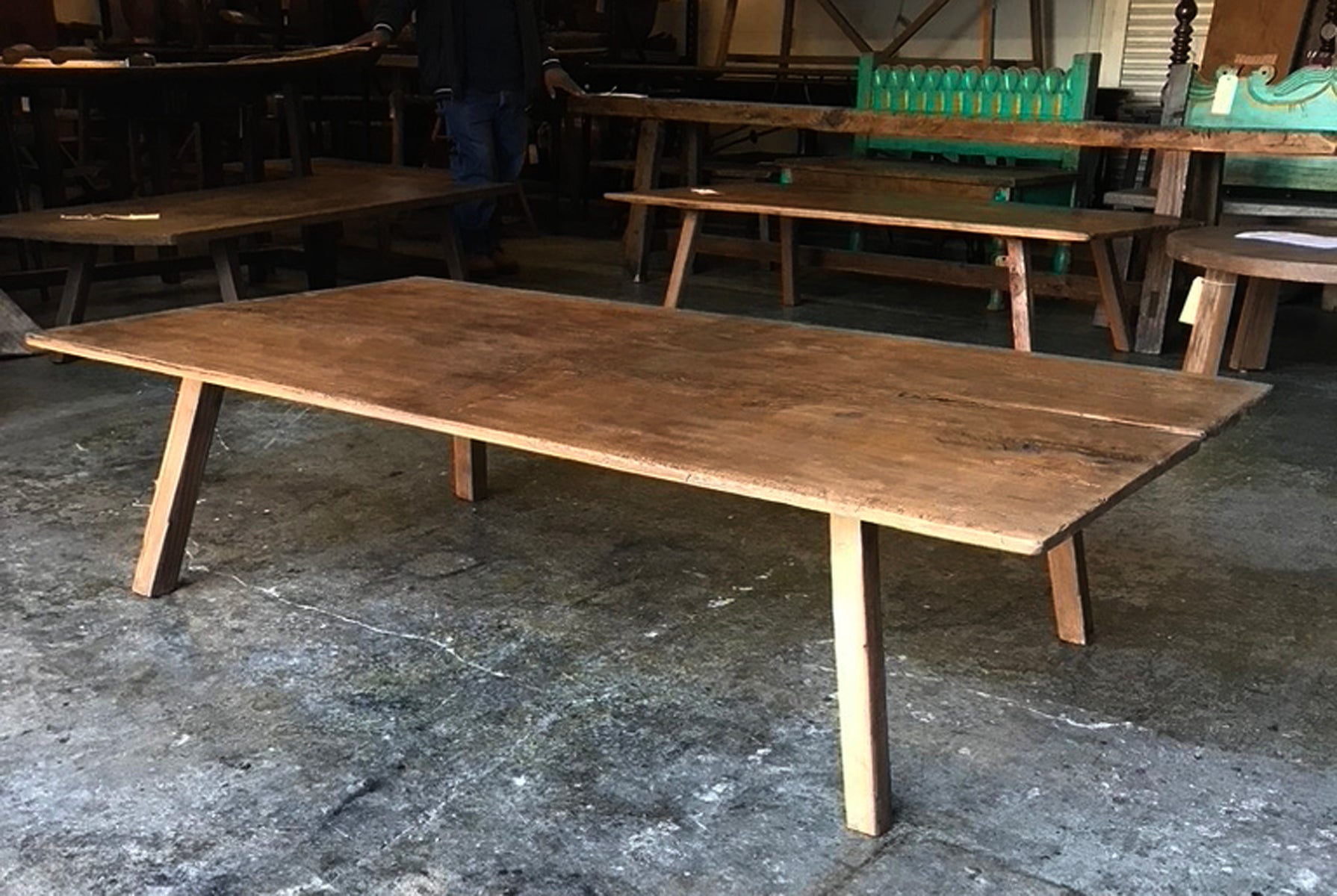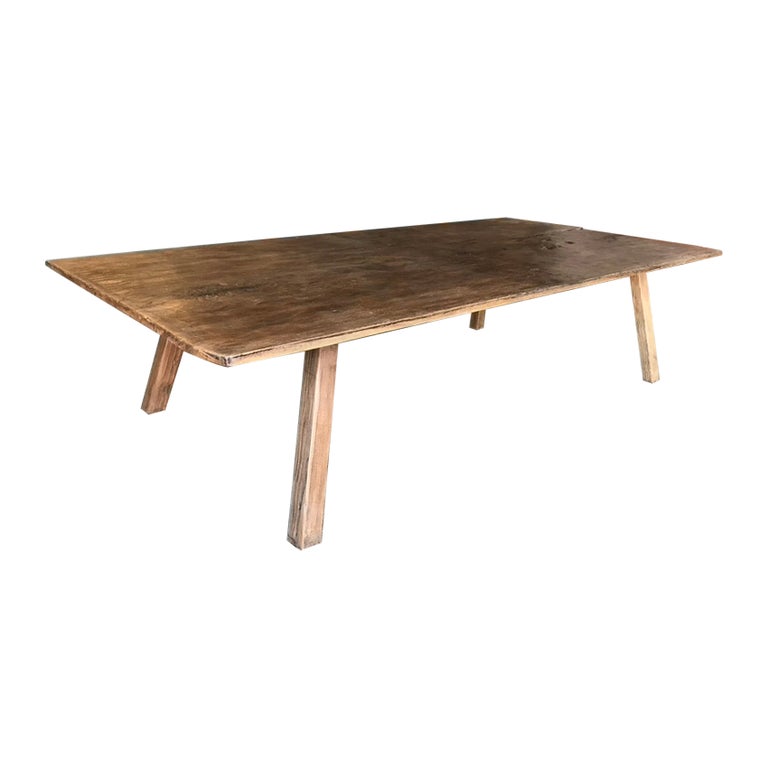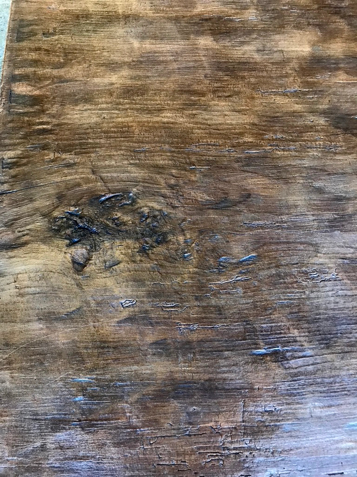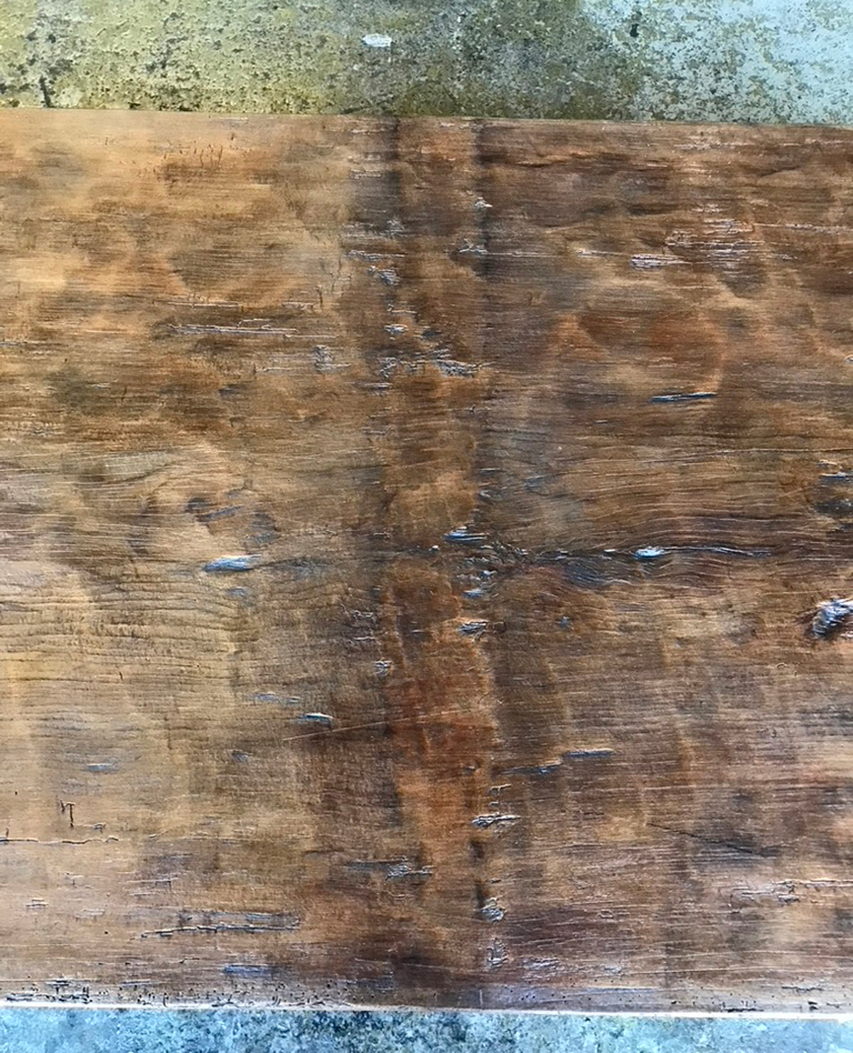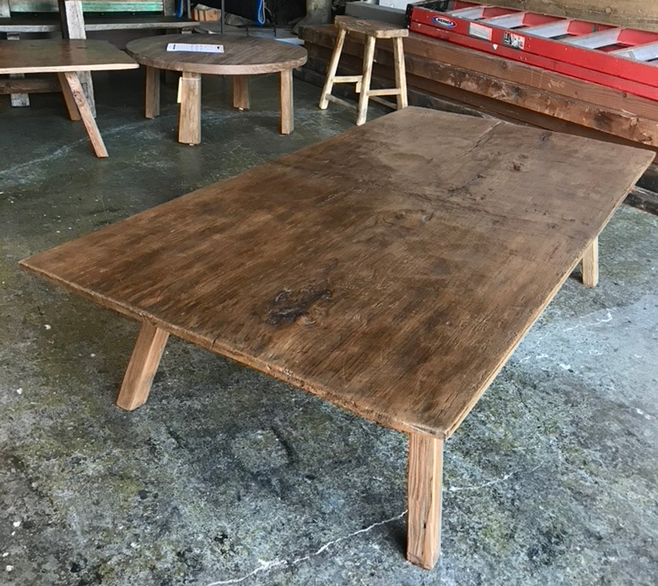 This coffee table consists of an old, hand-hewn top on new legs, finished to match the top. The wood has, age appropriate wear in a range of colors, all naturally distressed wit a smooth patina. This one wide piece of wood was at some part used on another piece of furniture, possibly an old grain bin, as you can see where the original hardware would have been. Beautiful, rustic and interesting!