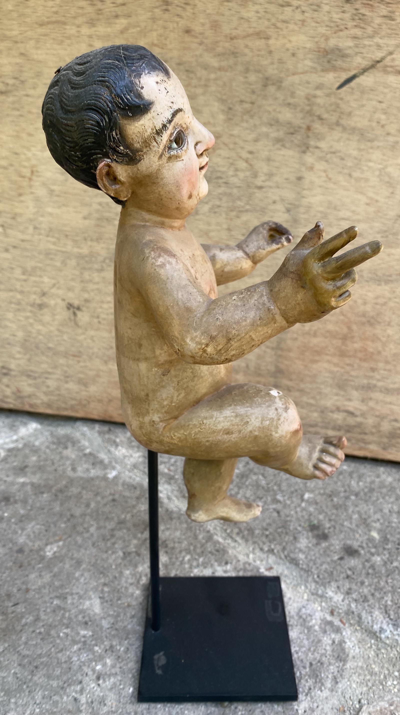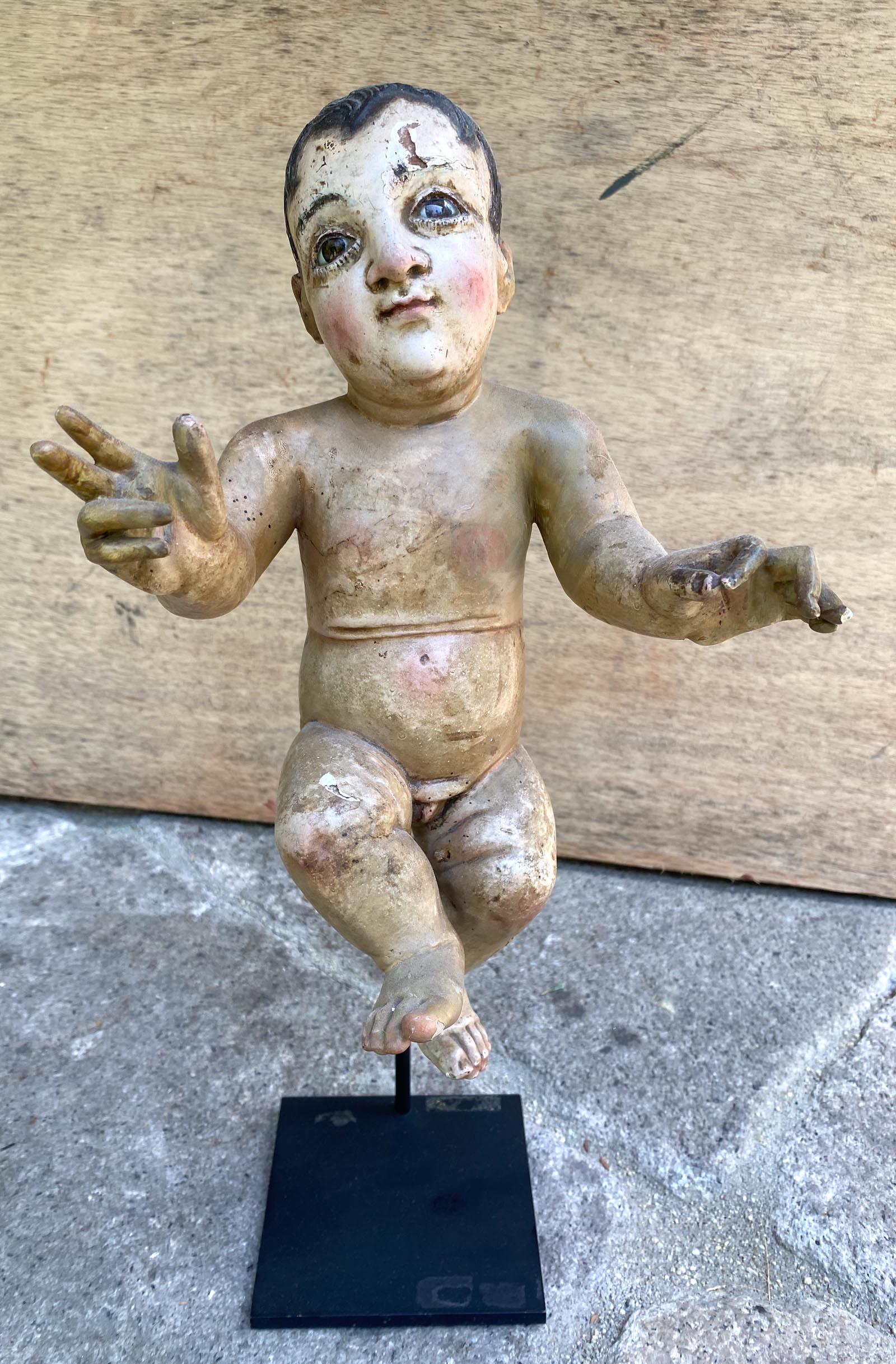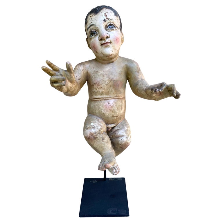 A striking and soulful 19th-century carved figure of the Infant Jesus (Niño Jesús) from Guatemala, crafted in the Spanish Colonial tradition. This devotional sculpture is rendered in hand-carved wood with its original polychrome gesso finish, retaining remarkable character and charm.