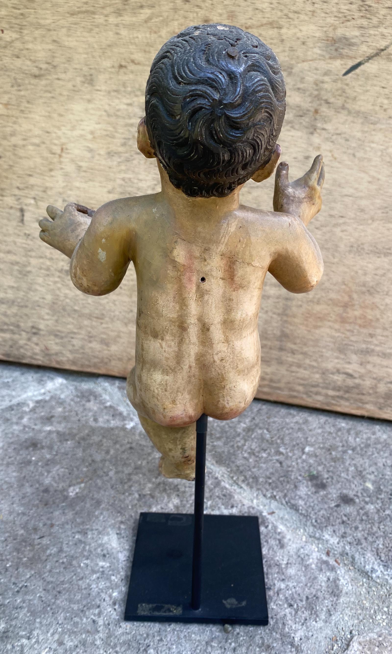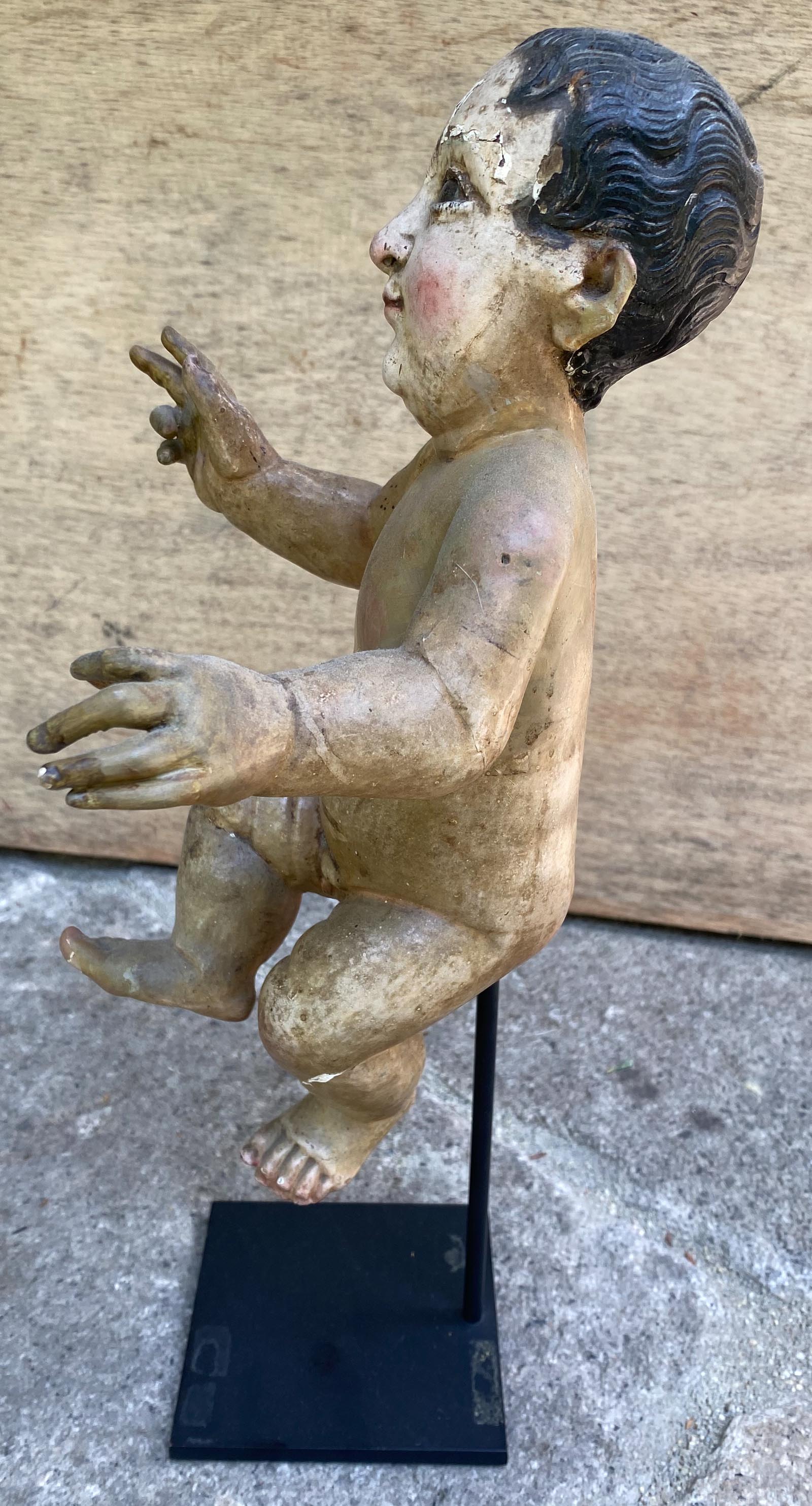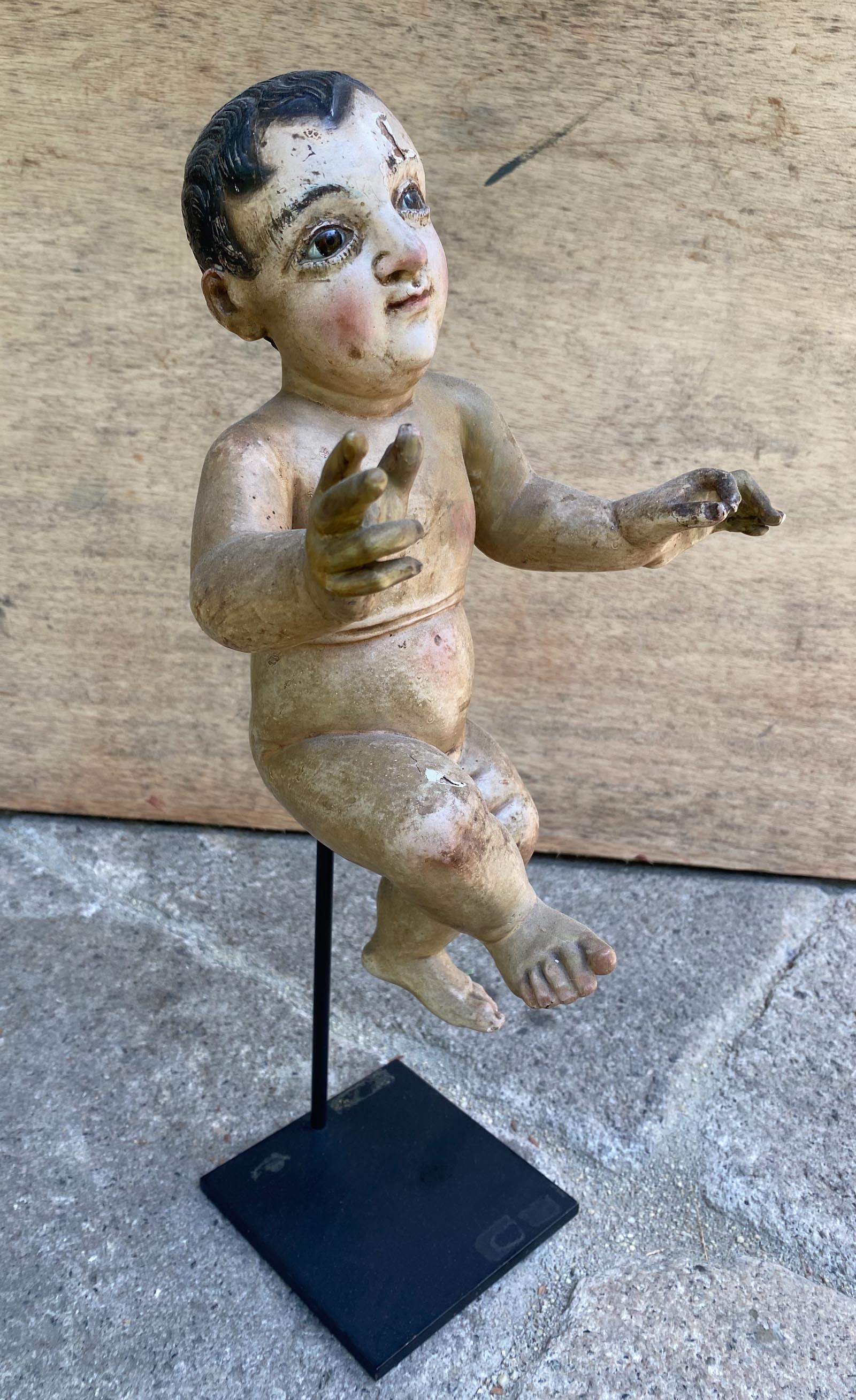A striking and soulful 19th-century carved figure of the Infant Jesus (Niño Jesús) from Guatemala, crafted in the Spanish Colonial tradition. This devotional sculpture is rendered in hand-carved wood with its original polychrome gesso finish, retaining remarkable character and charm.