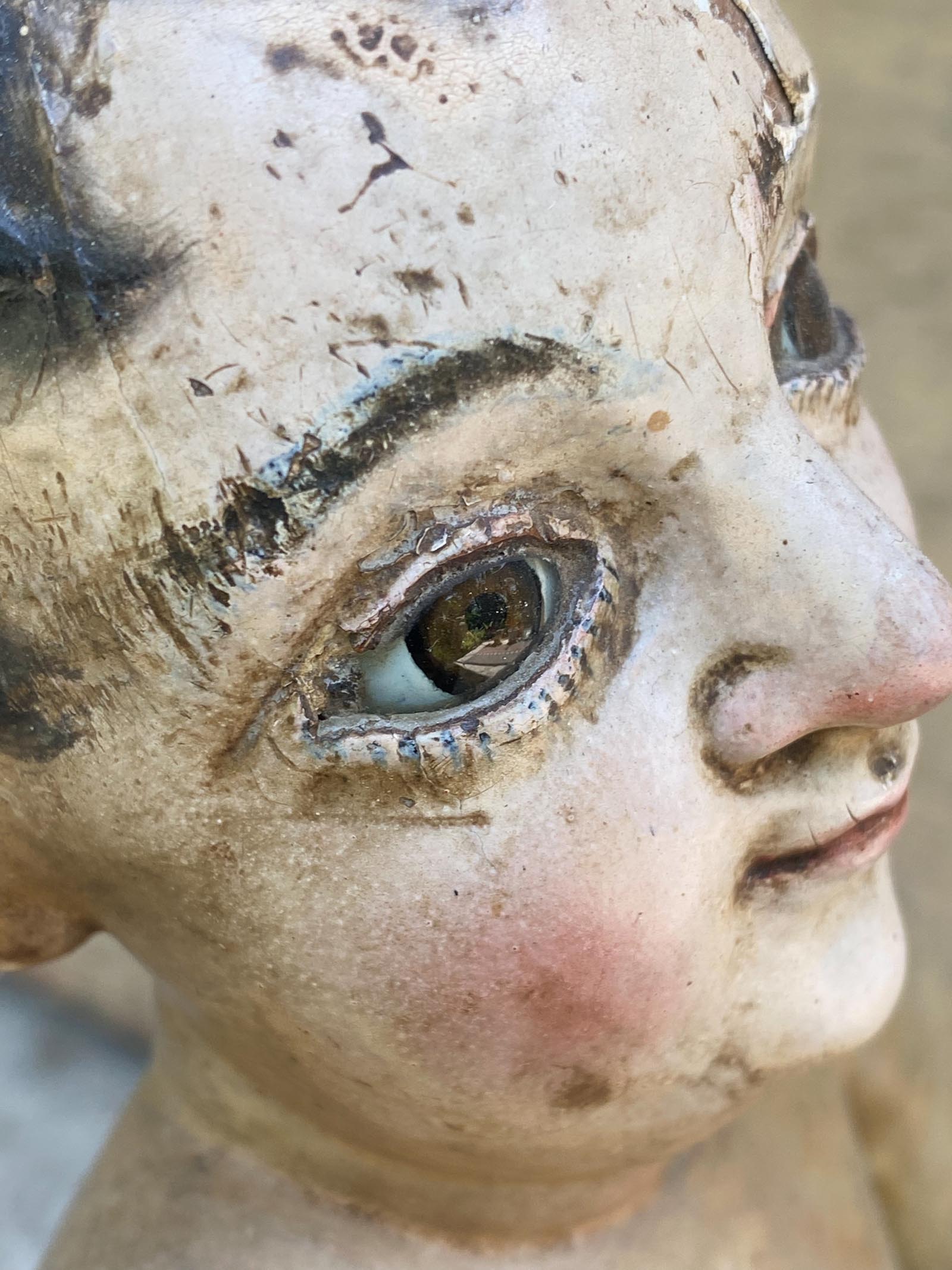 The Niño features a finely modeled face with a lifelike expression, inset brown glass eyes, and a delicately formed pink mouth. The hair is intricately carved, adding to the realistic quality of the piece. The figure is shown in a traditional blessing gesture, both hands and all toes intact.