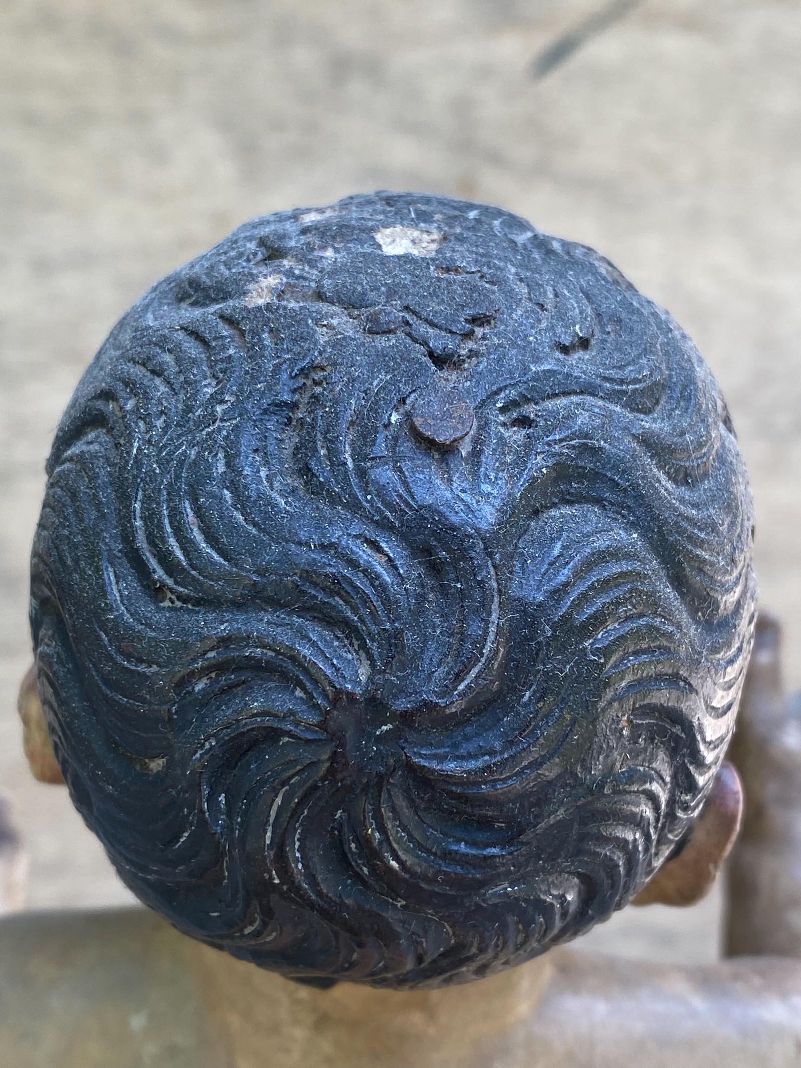 Minor paint chipping is visible throughout, along with natural surface flaking and a professionally repaired area on one ear—wear consistent with age and devotional use. The figure stands freely mounted on a custom base for display.