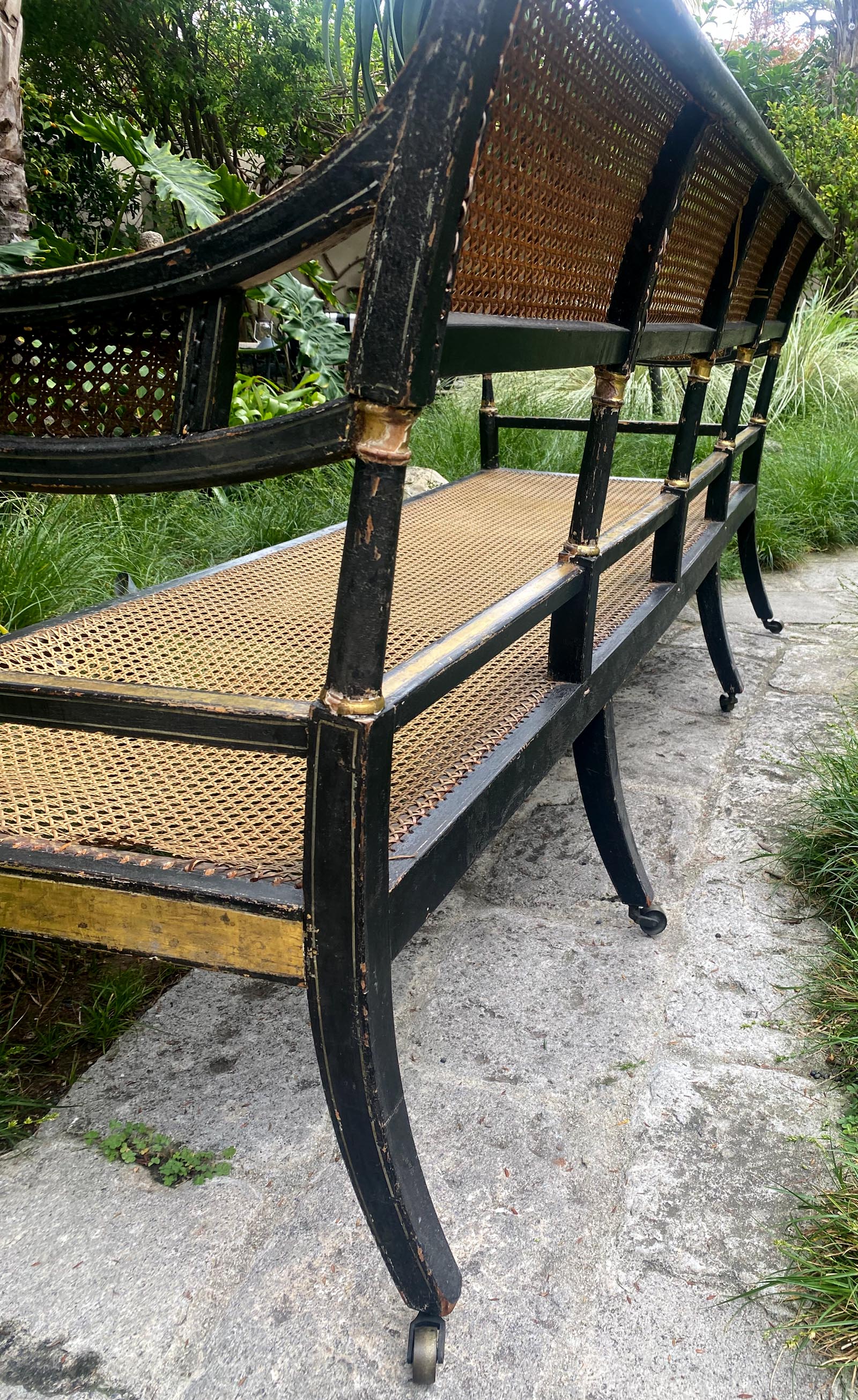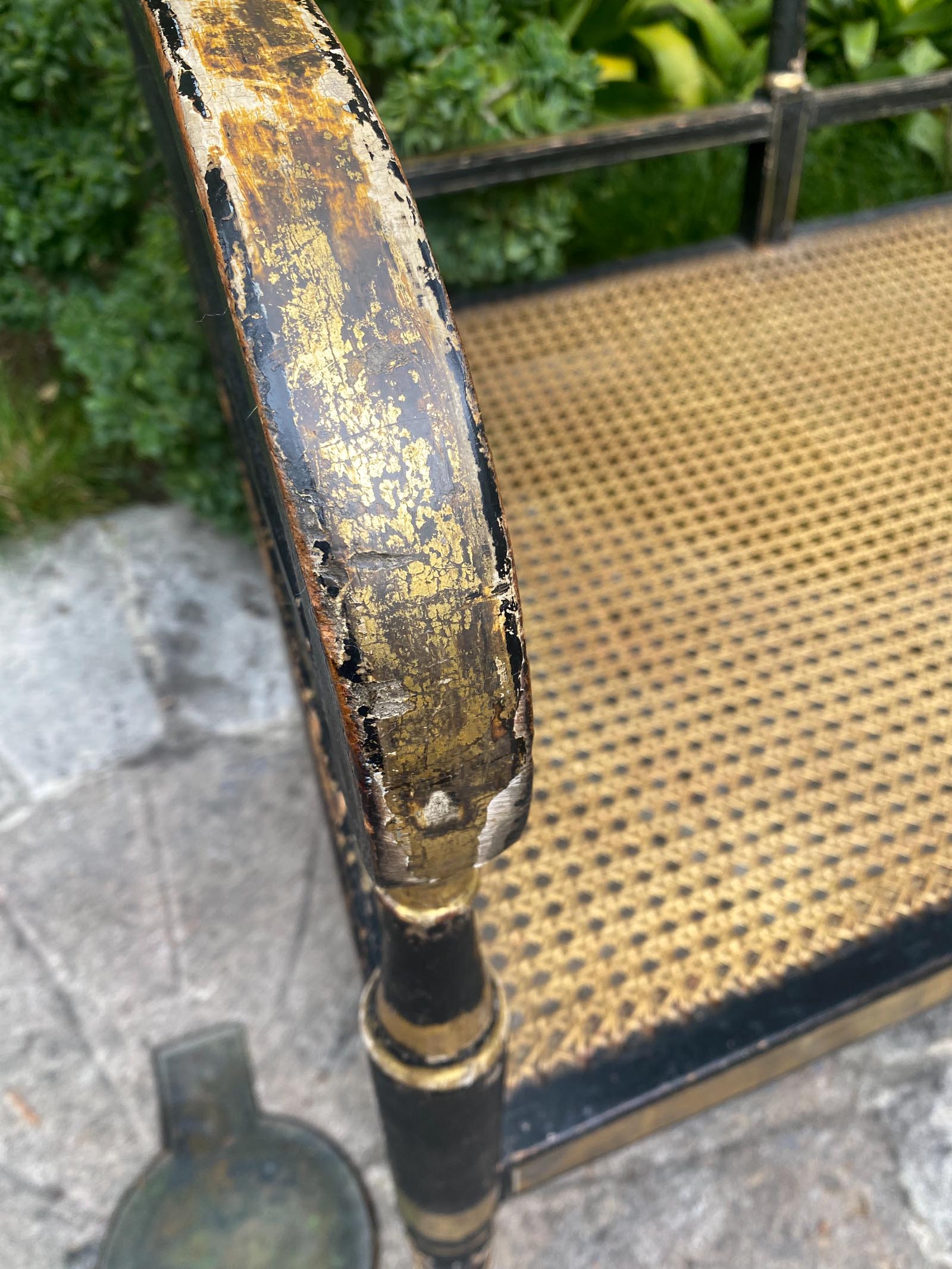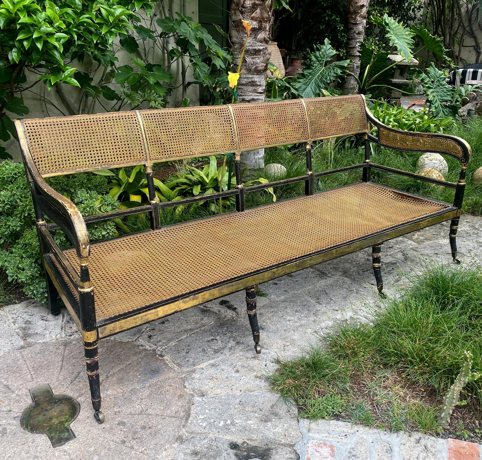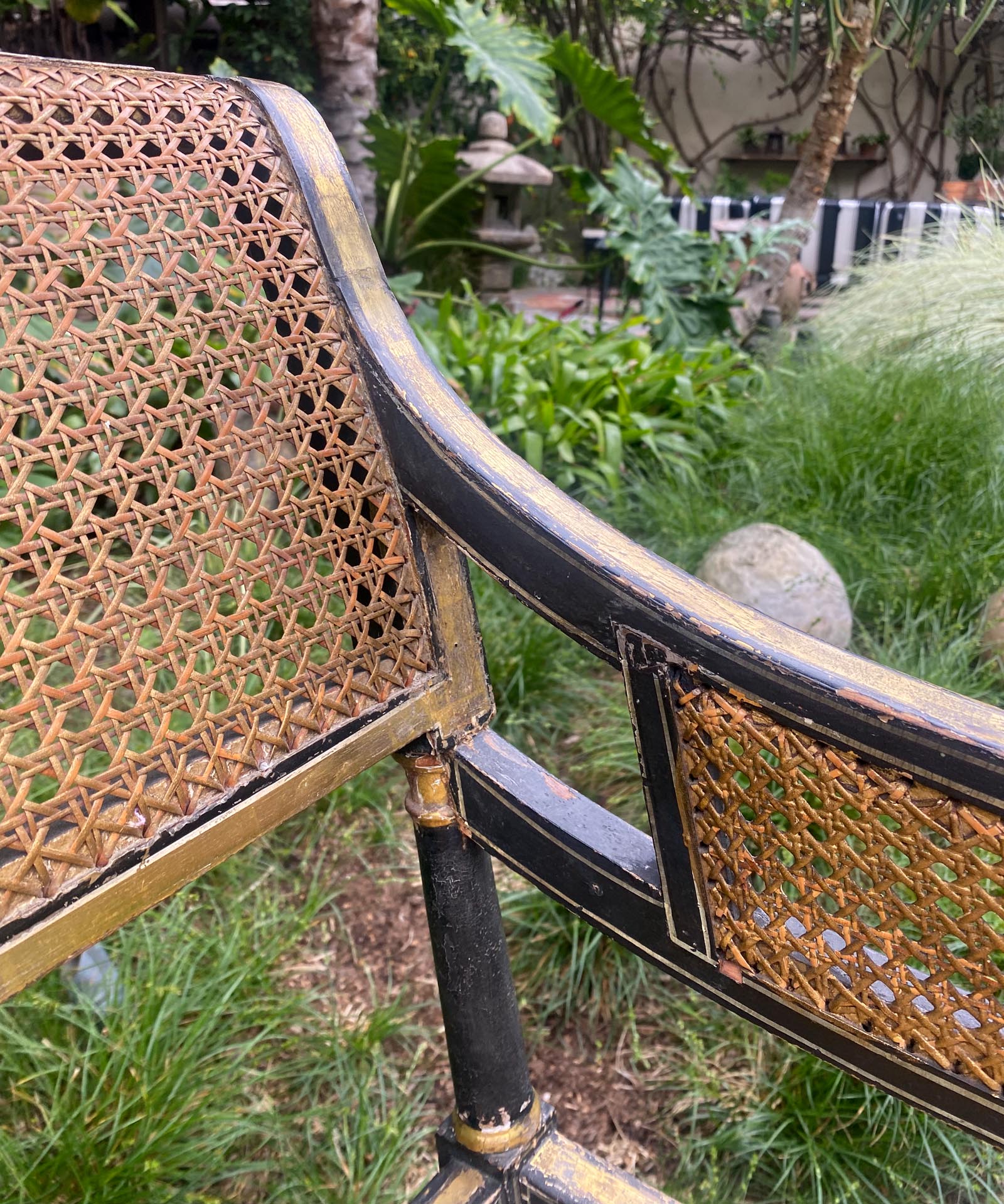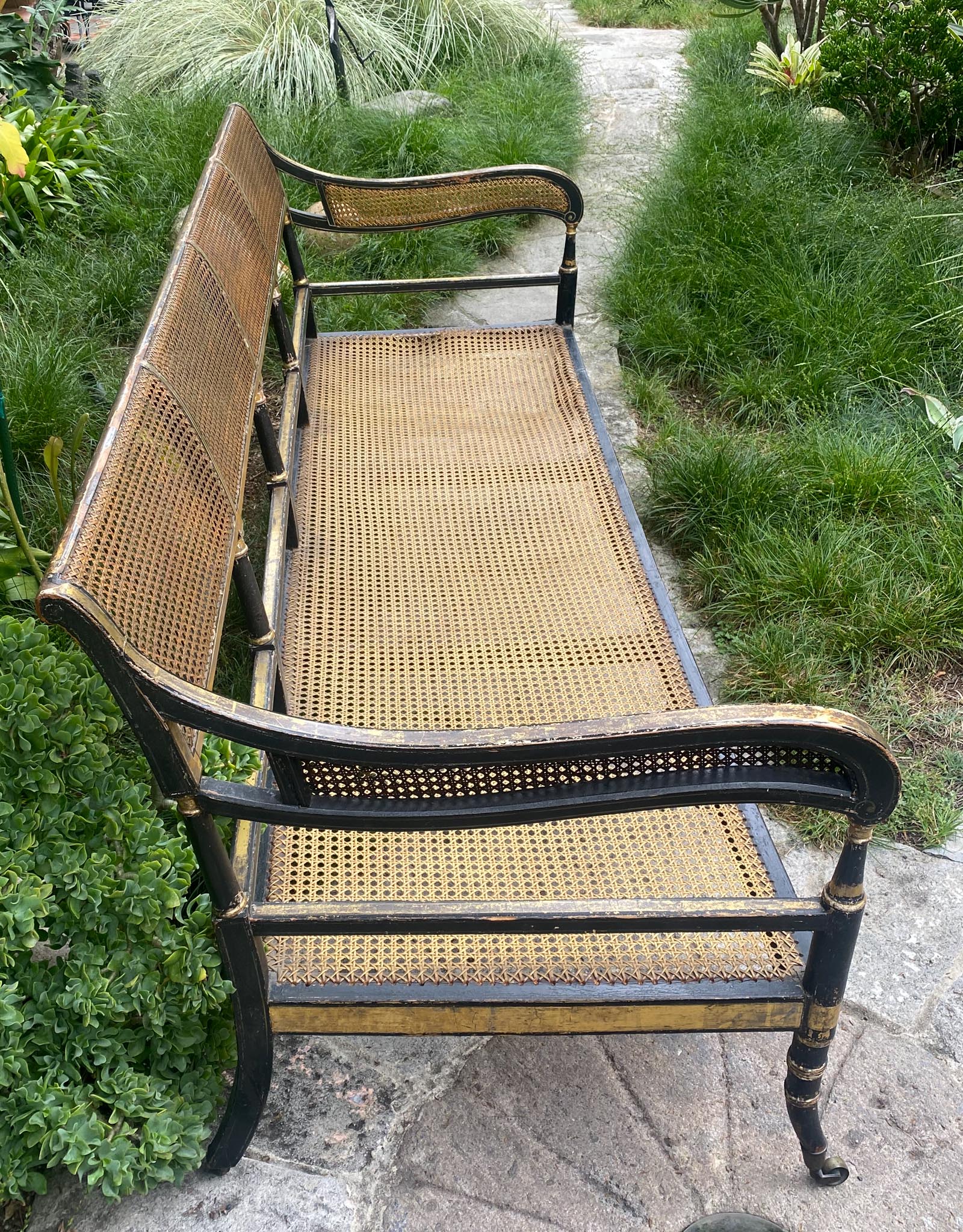 Stunning, all original, Regency gilt caned settee, expertly crafted and finished in lustrous black lacquer with refined gilt gold accents. Reflecting the classical influence of early 19th-century design, this piece features a gently arched back, elegantly turned legs, and delicate arm supports, all embellished with subtle golden highlights that enhance its sculptural form.