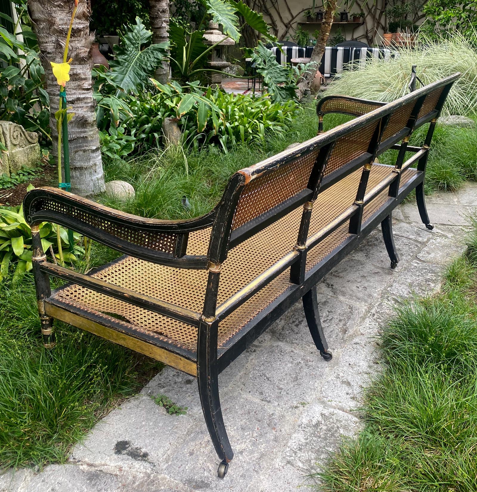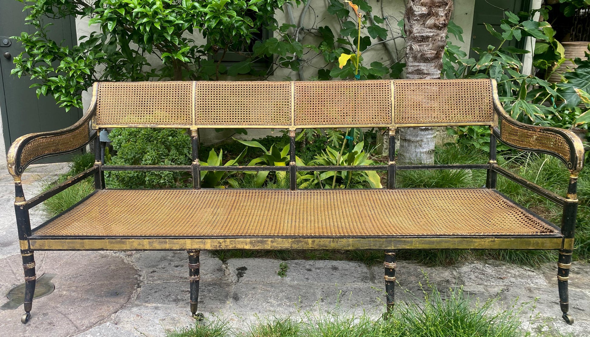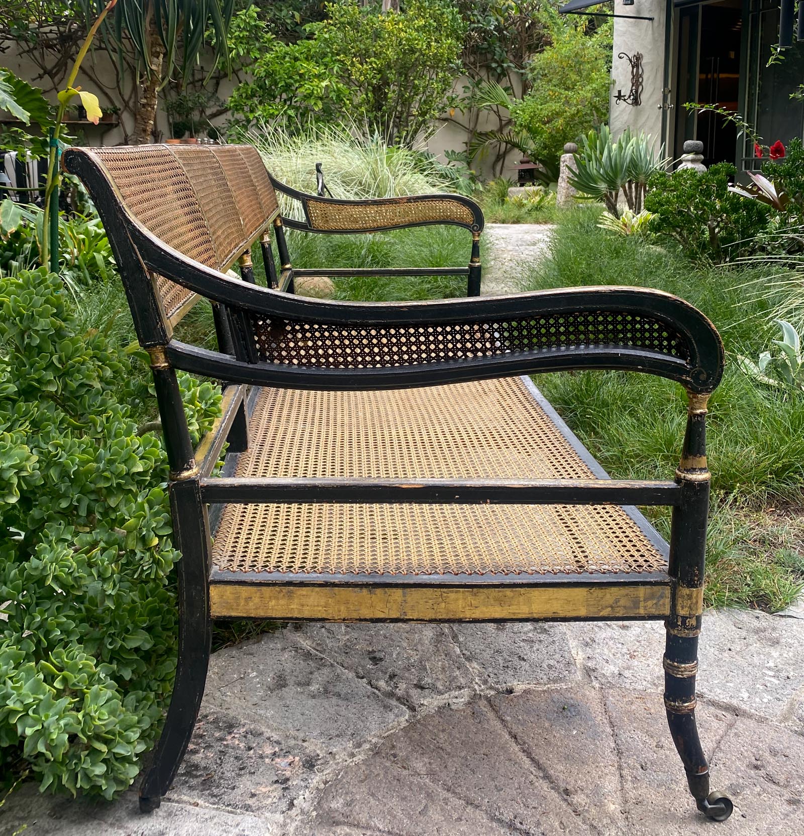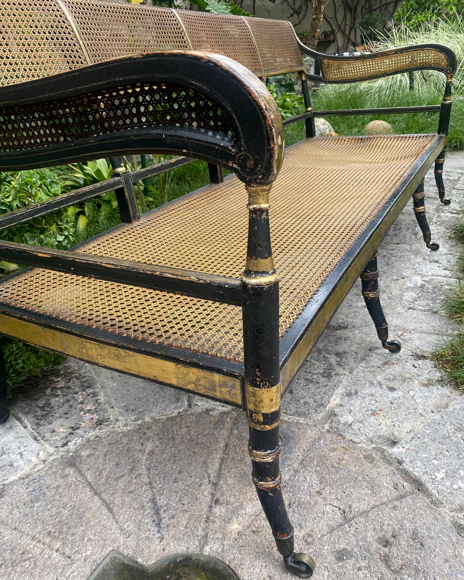Stunning, all original, Regency gilt caned settee, expertly crafted and finished in lustrous black lacquer with refined gilt gold accents. Reflecting the classical influence of early 19th-century design, this piece features a gently arched back, elegantly turned legs, and delicate arm supports, all embellished with subtle golden highlights that enhance its sculptural form.