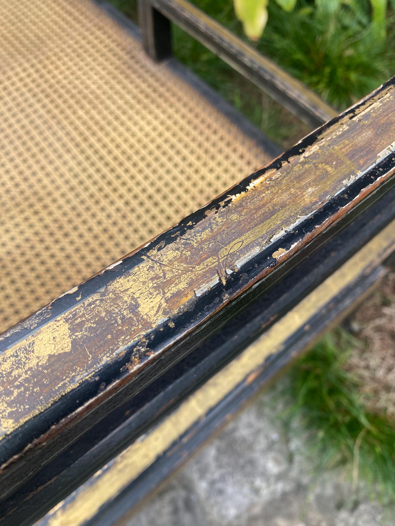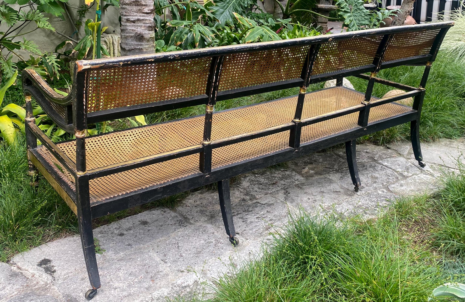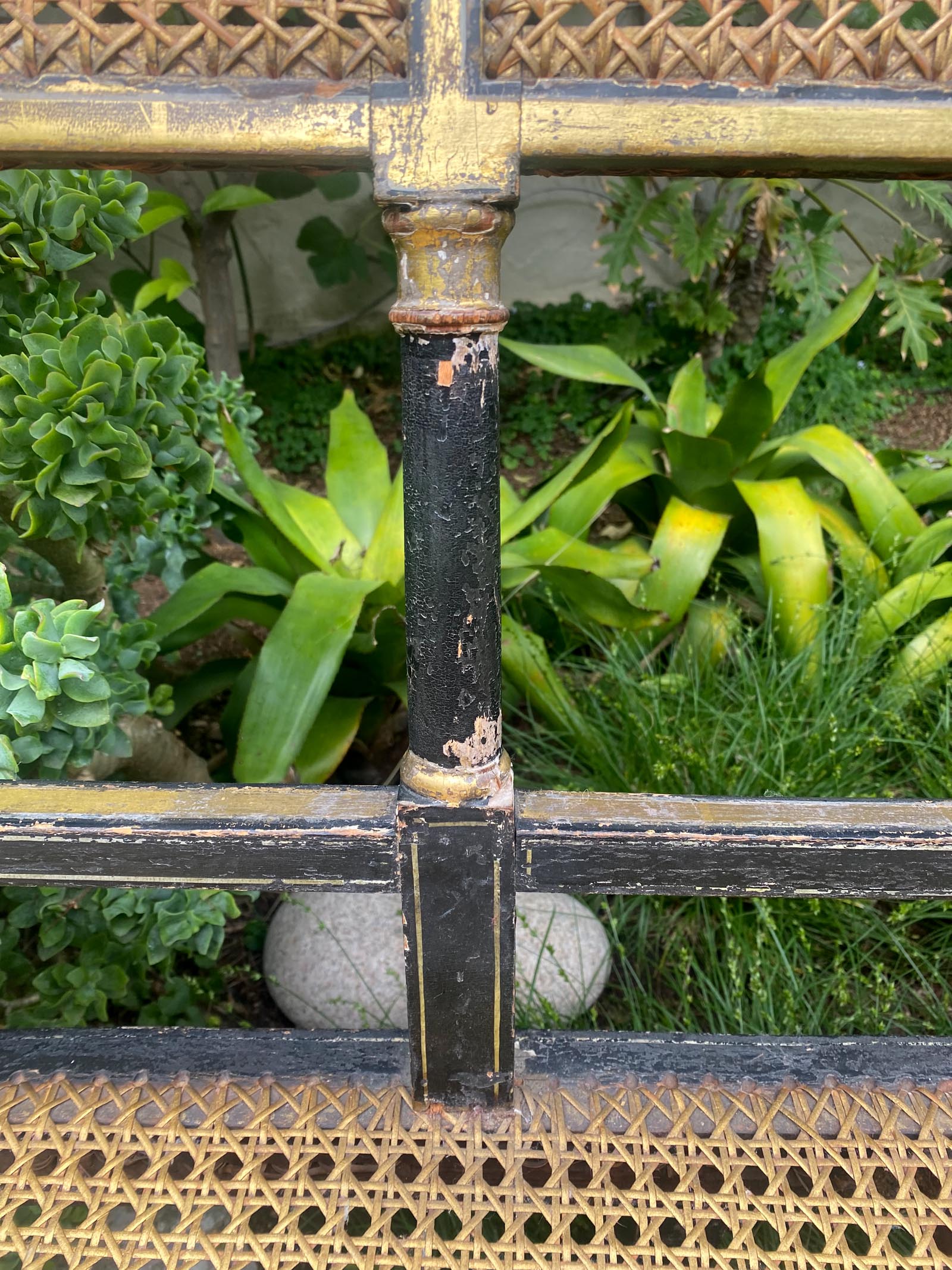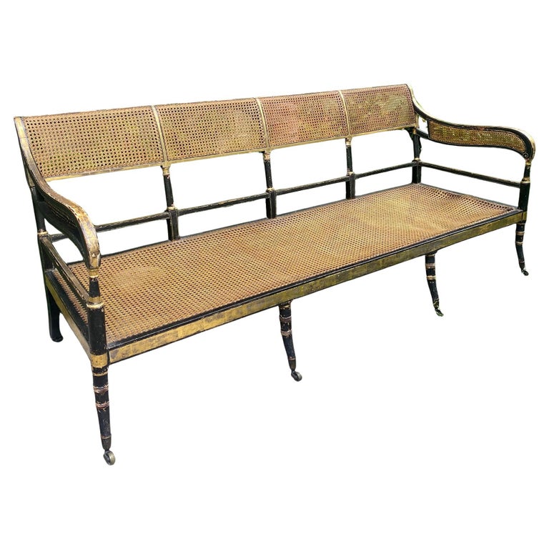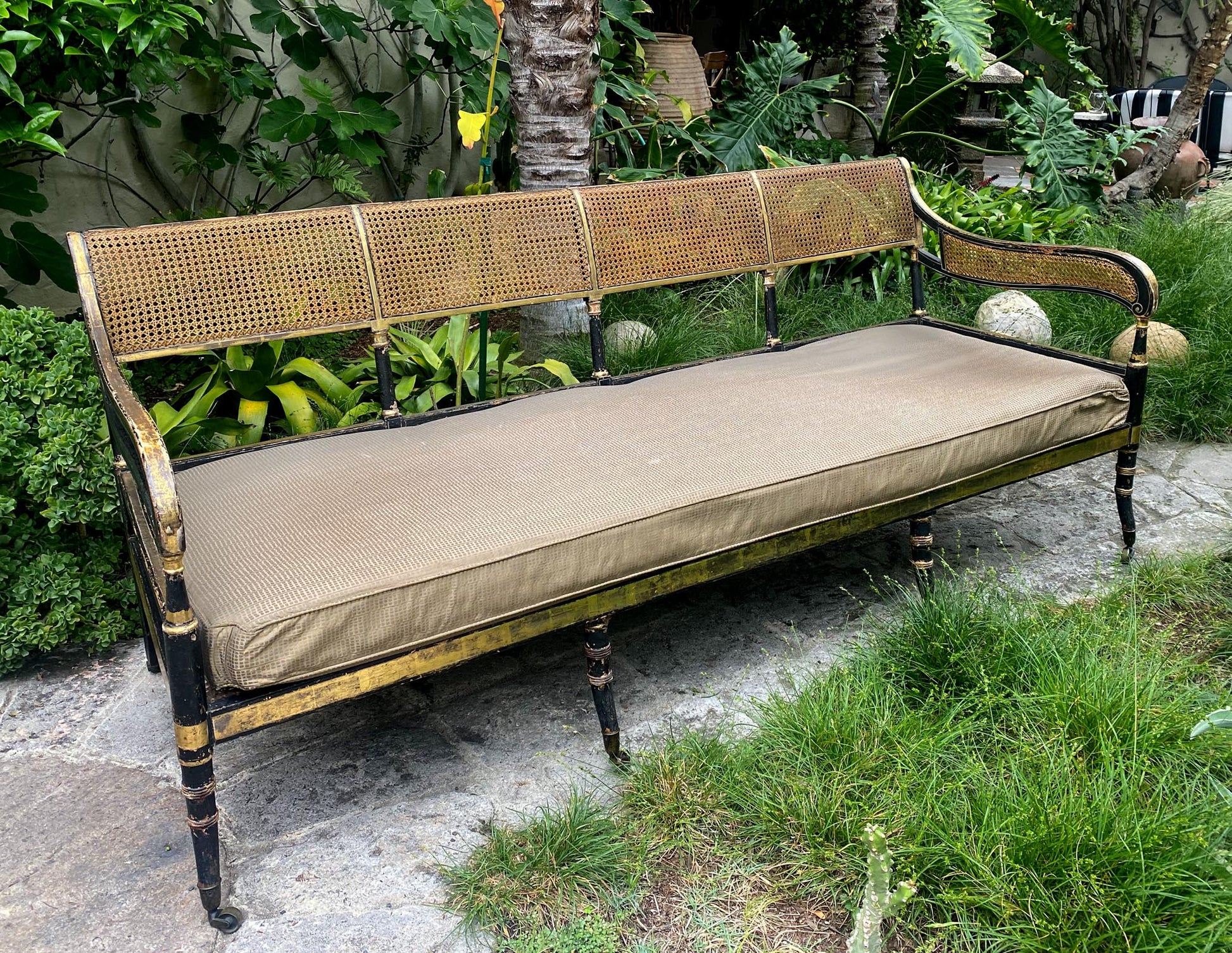 Stunning, all original, Regency gilt caned settee, expertly crafted and finished in lustrous black lacquer with refined gilt gold accents. Reflecting the classical influence of early 19th-century design, this piece features a gently arched back, elegantly turned legs, and delicate arm supports, all embellished with subtle golden highlights that enhance its sculptural form.