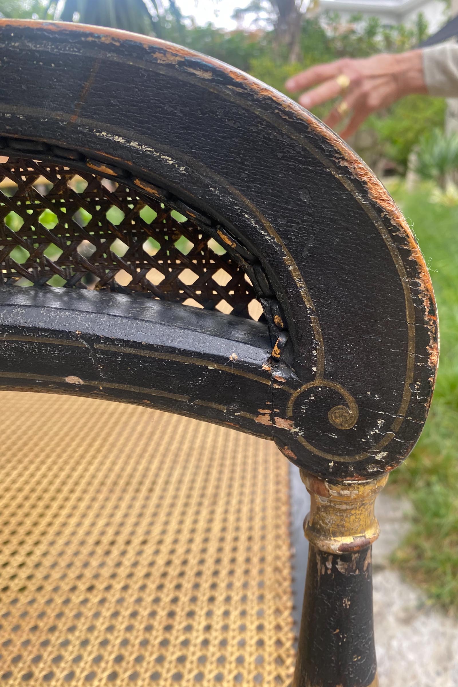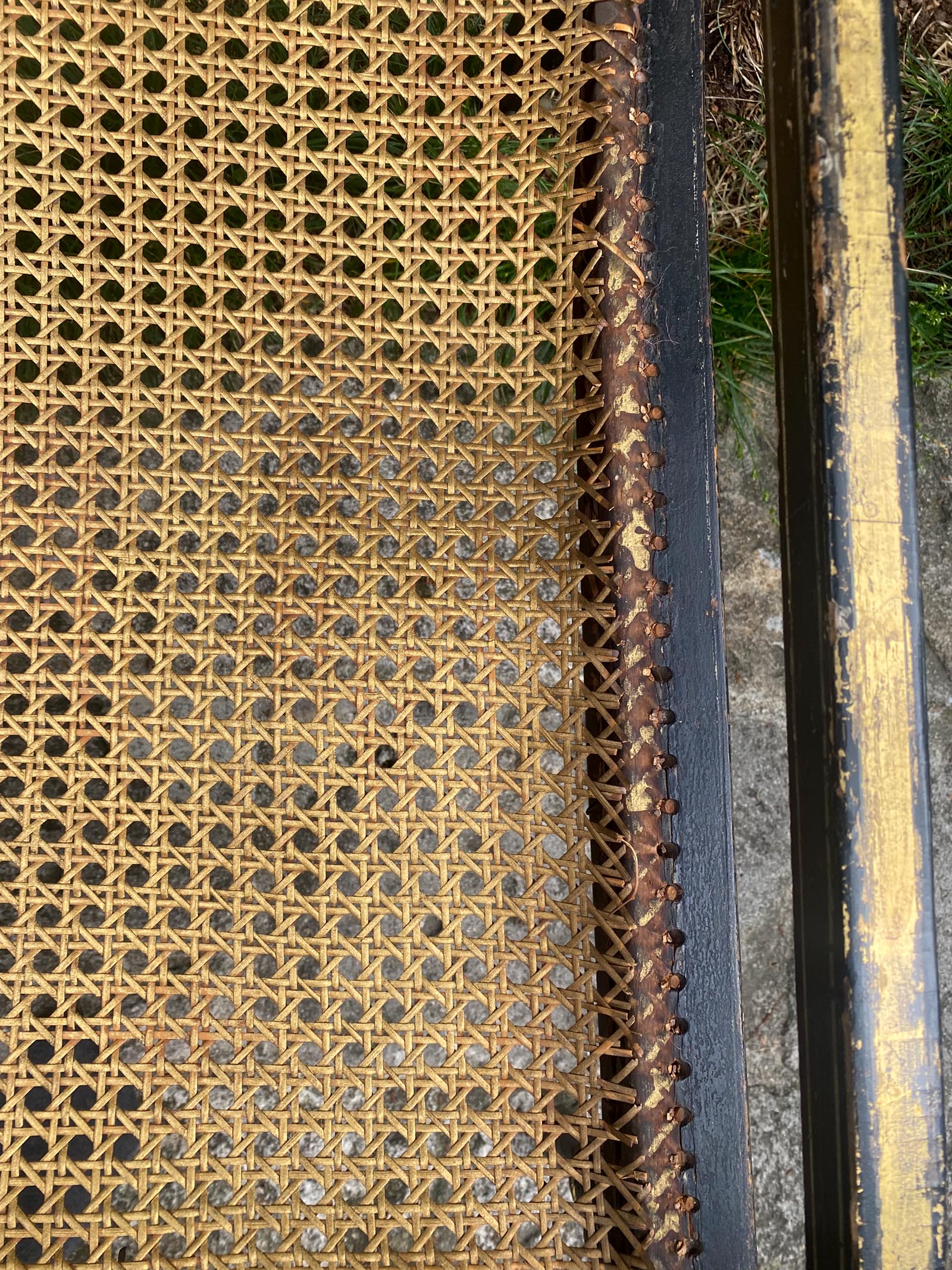 The handwoven cane seat and backrest offer breathable comfort while showcasing traditional artisan craftsmanship. The right side of the seat caning has come away from the frame. Bronze casters on all four legs not only speak to the piece’s authentic period detailing but also provide effortless mobility.