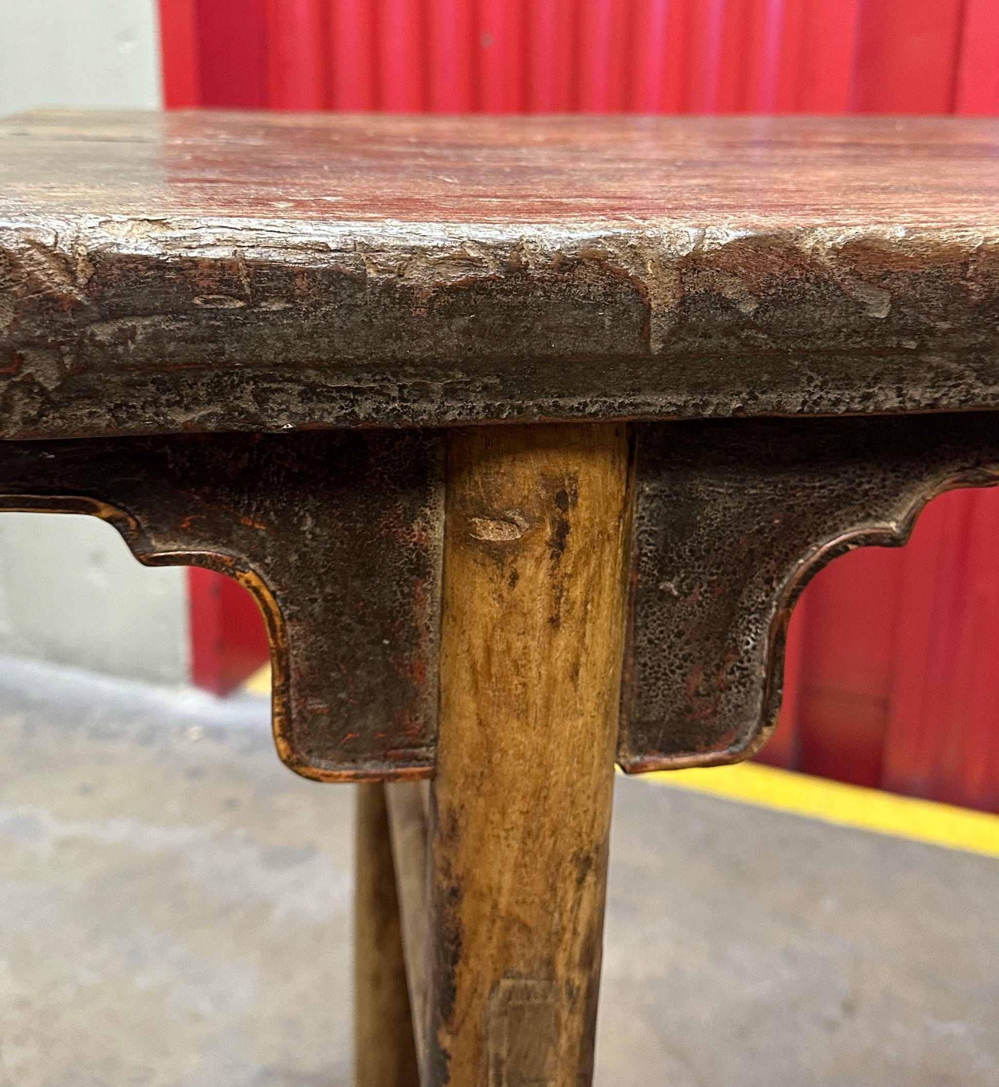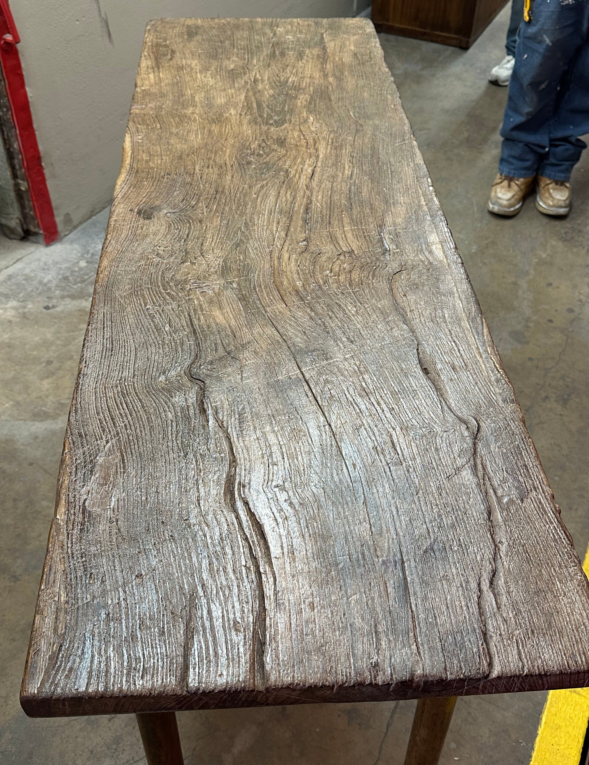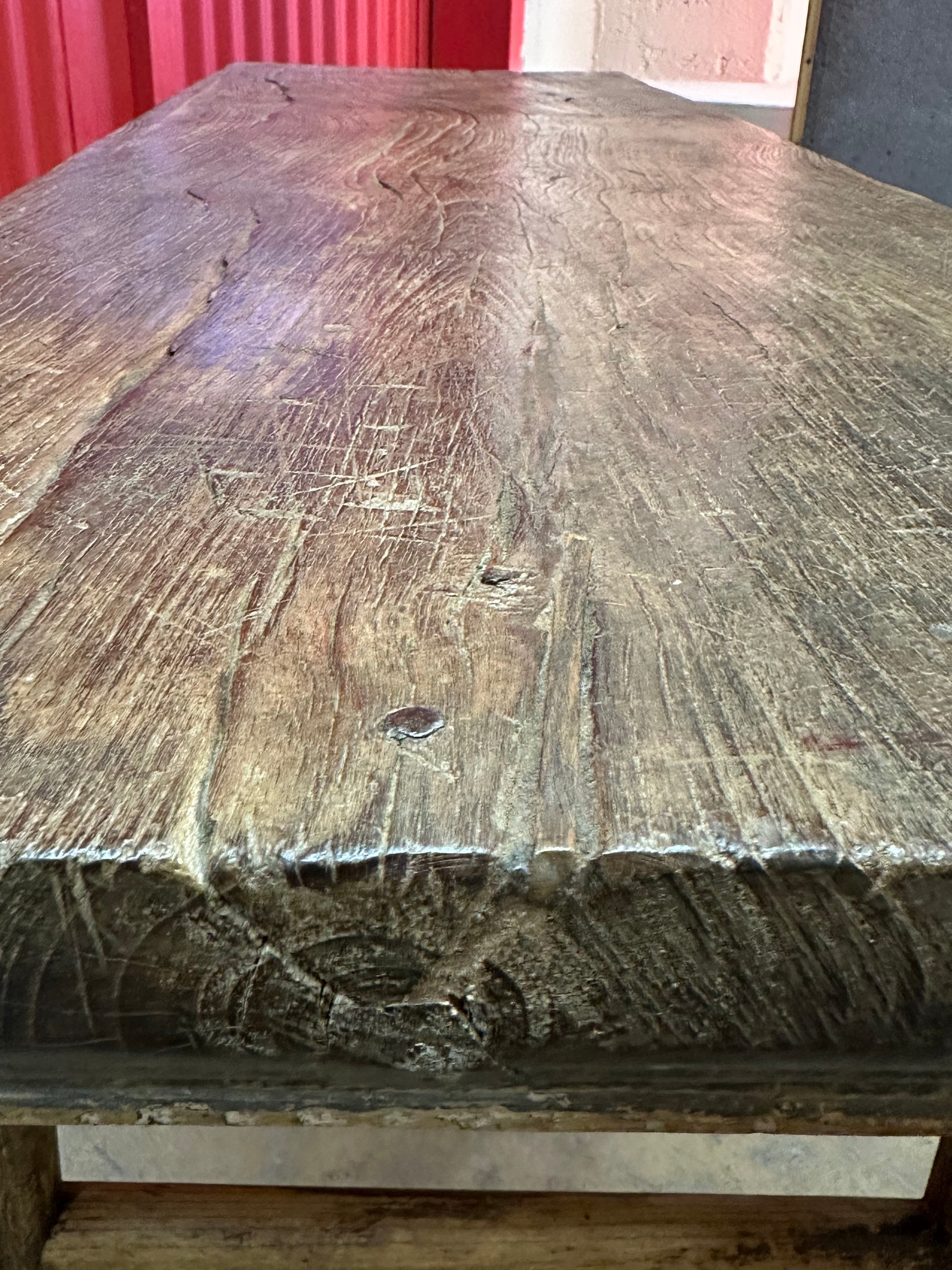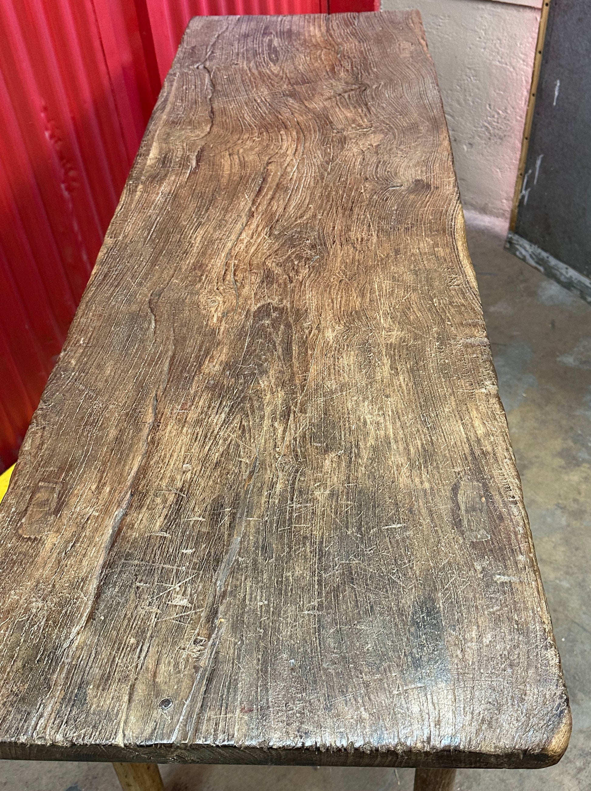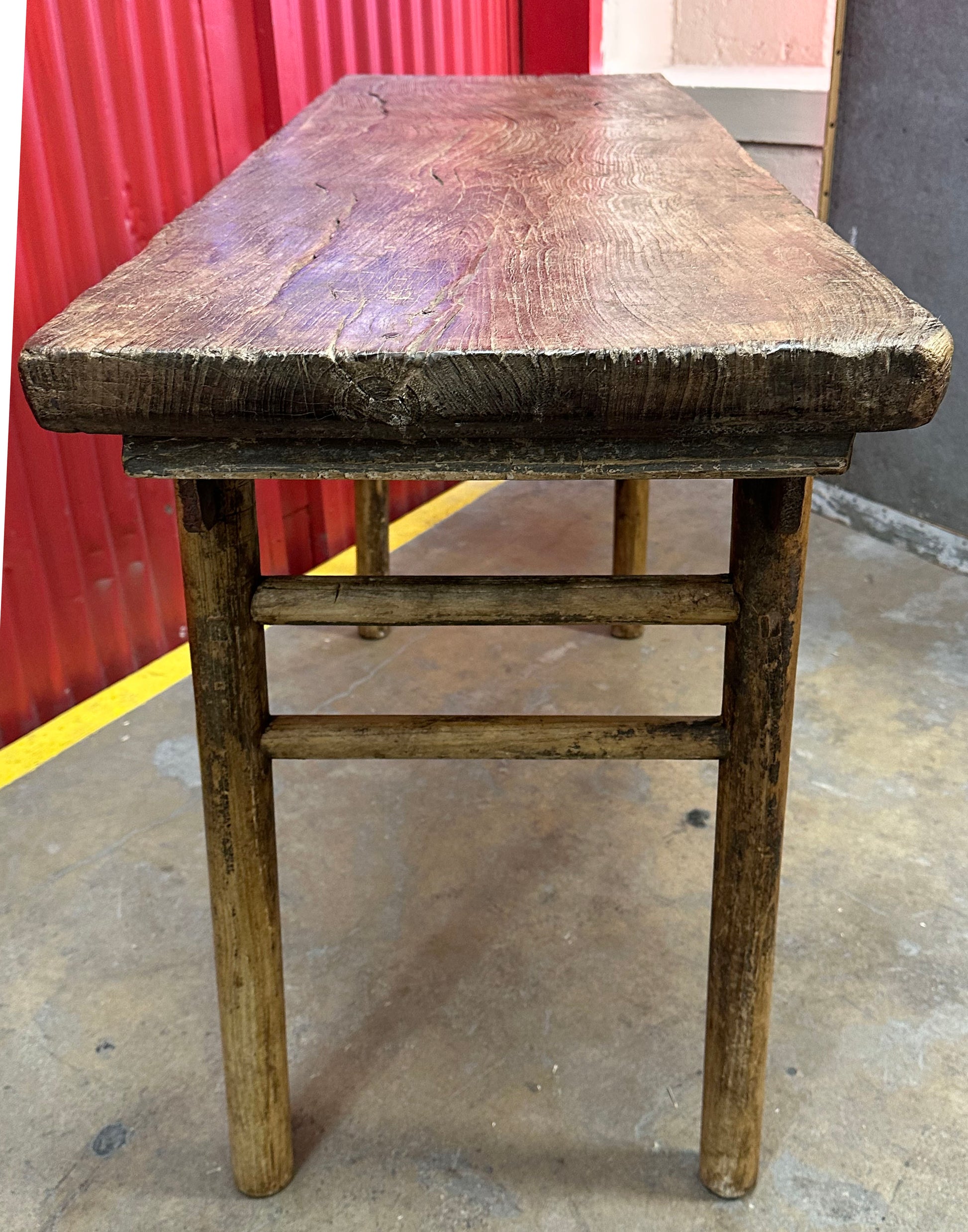 The table’s surface is its most striking feature. The wood has transitioned into a rich, warm tone with visible weathering, honest wear, and a "shou" (longevity) quality that makes it a standout focal point.