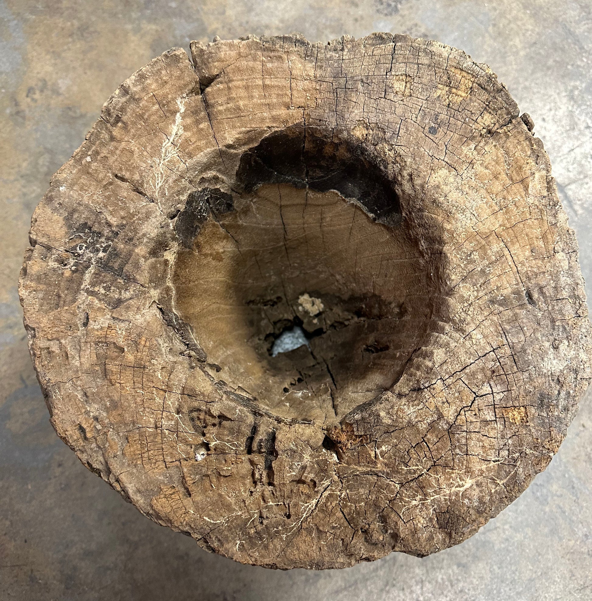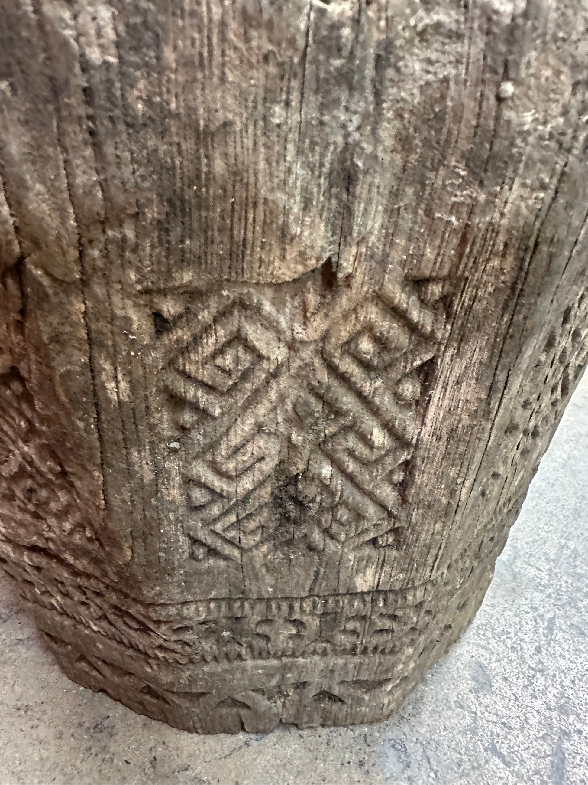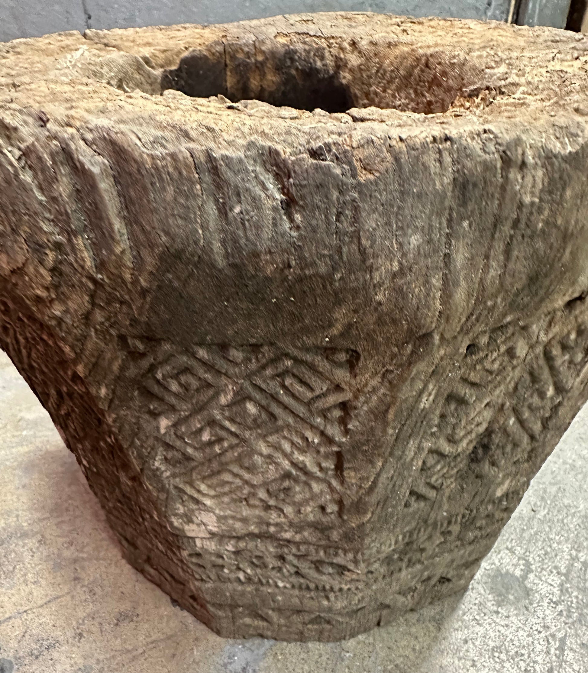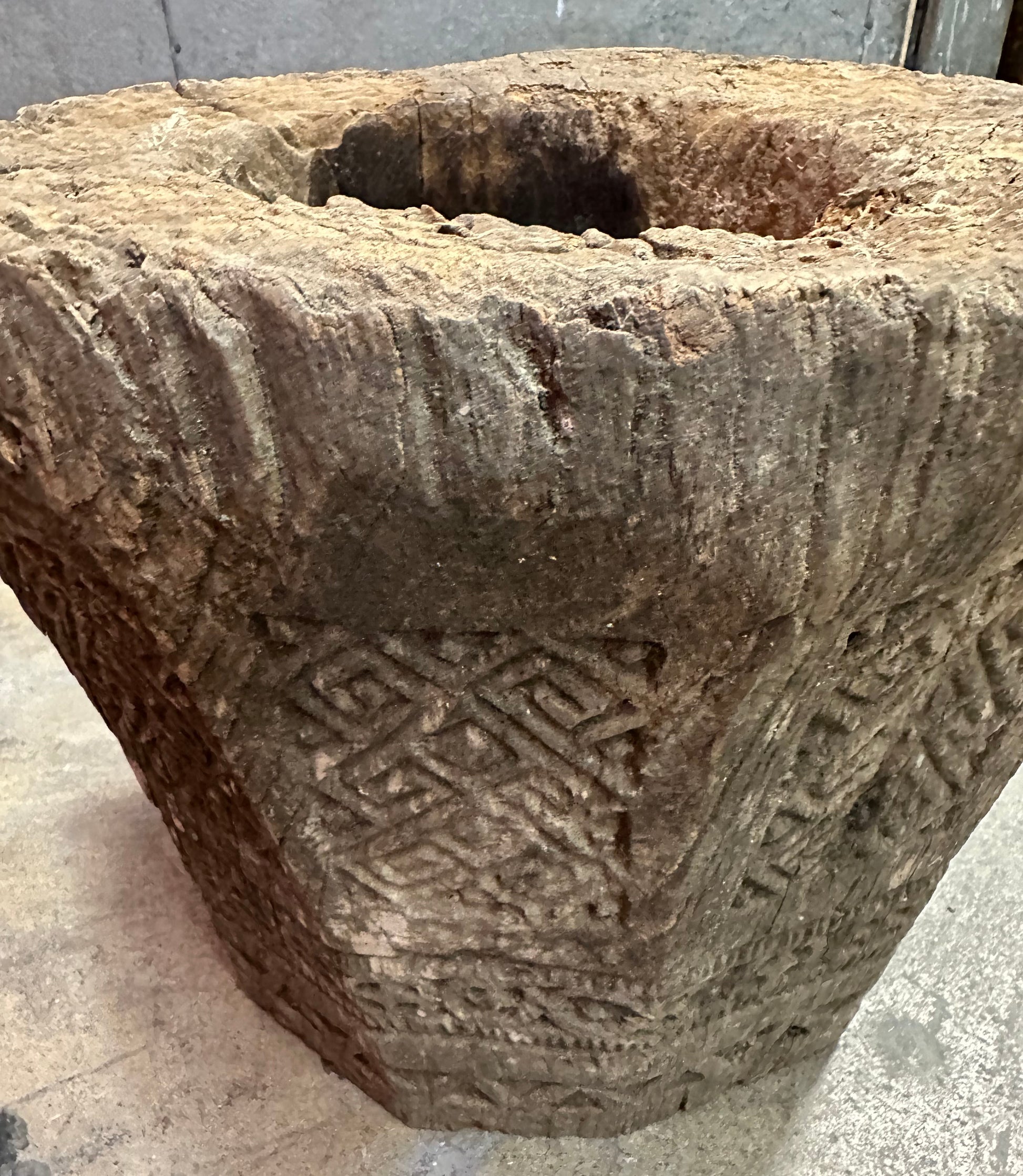 The form tapers slightly toward the base, with a thick, hollowed bowl showing pronounced age, wear, and patina consistent with long, practical use. Visible tool marks, surface cracking, and erosion add to its authenticity and sculptural presence, telling the story of decades of handling and ritual or domestic use.