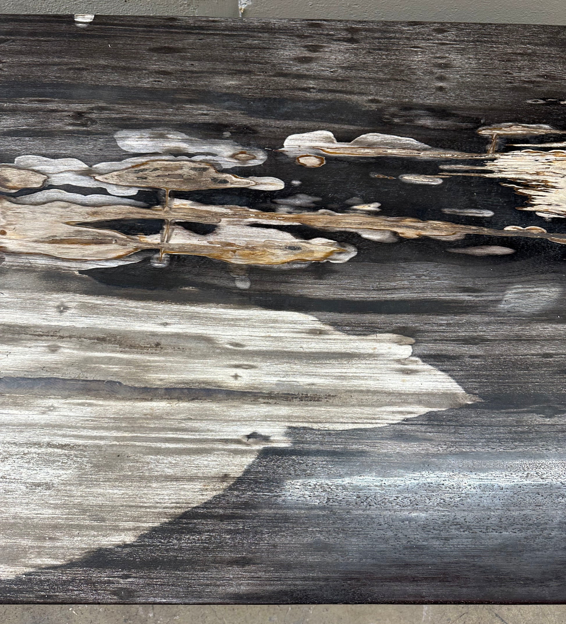 This Indonesian petrified slab, approximately 4.5 inches thick preserves the organic form and mineral grain of the original tree, transformed over millennia into stone with rich tonal variation. The slab rests on two 19th century Guatemalan carved stone bases. Their weathered surfaces provide deep grounded contrast to the refined plane above. Together the materials create a powerful and sculptural piece.