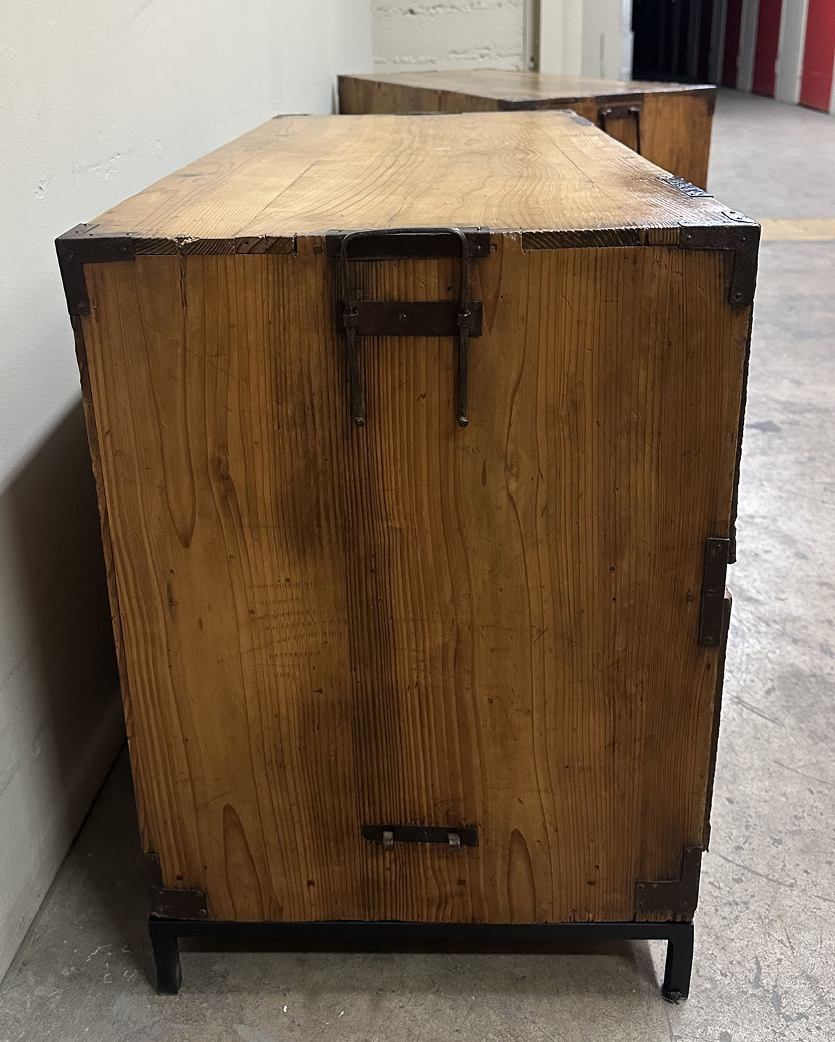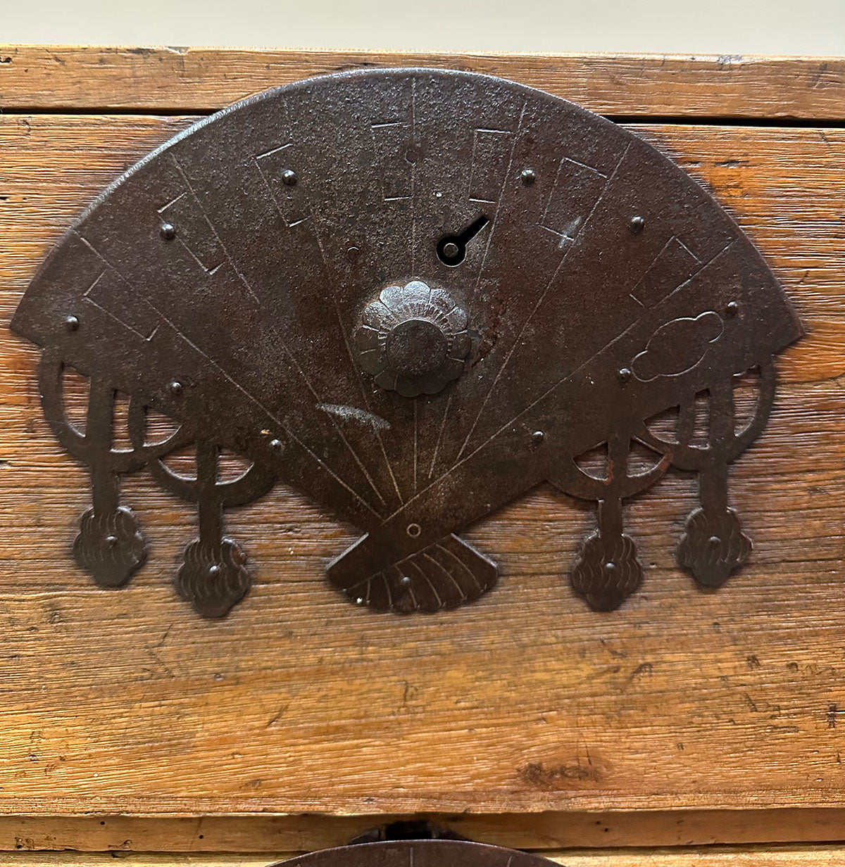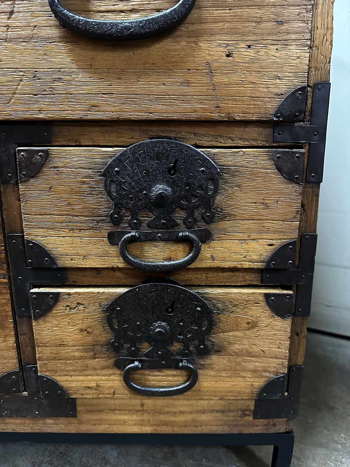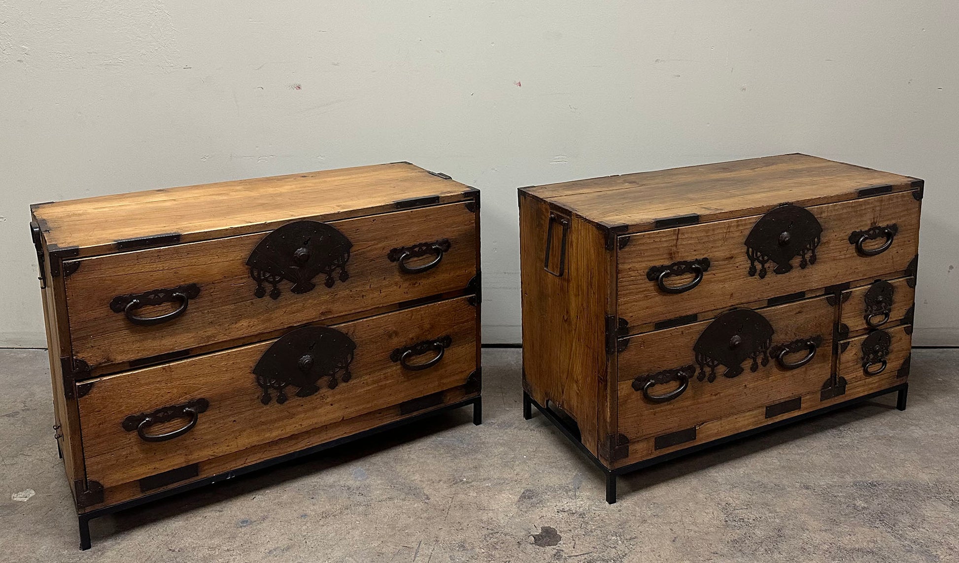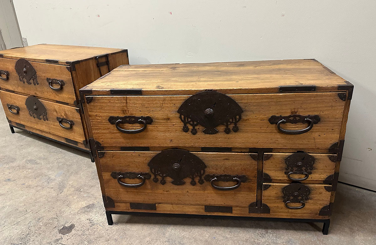The chests are adorned with heavy hand-forged iron hardware. The highlight is the oversized fan-shaped lock plates (maete)