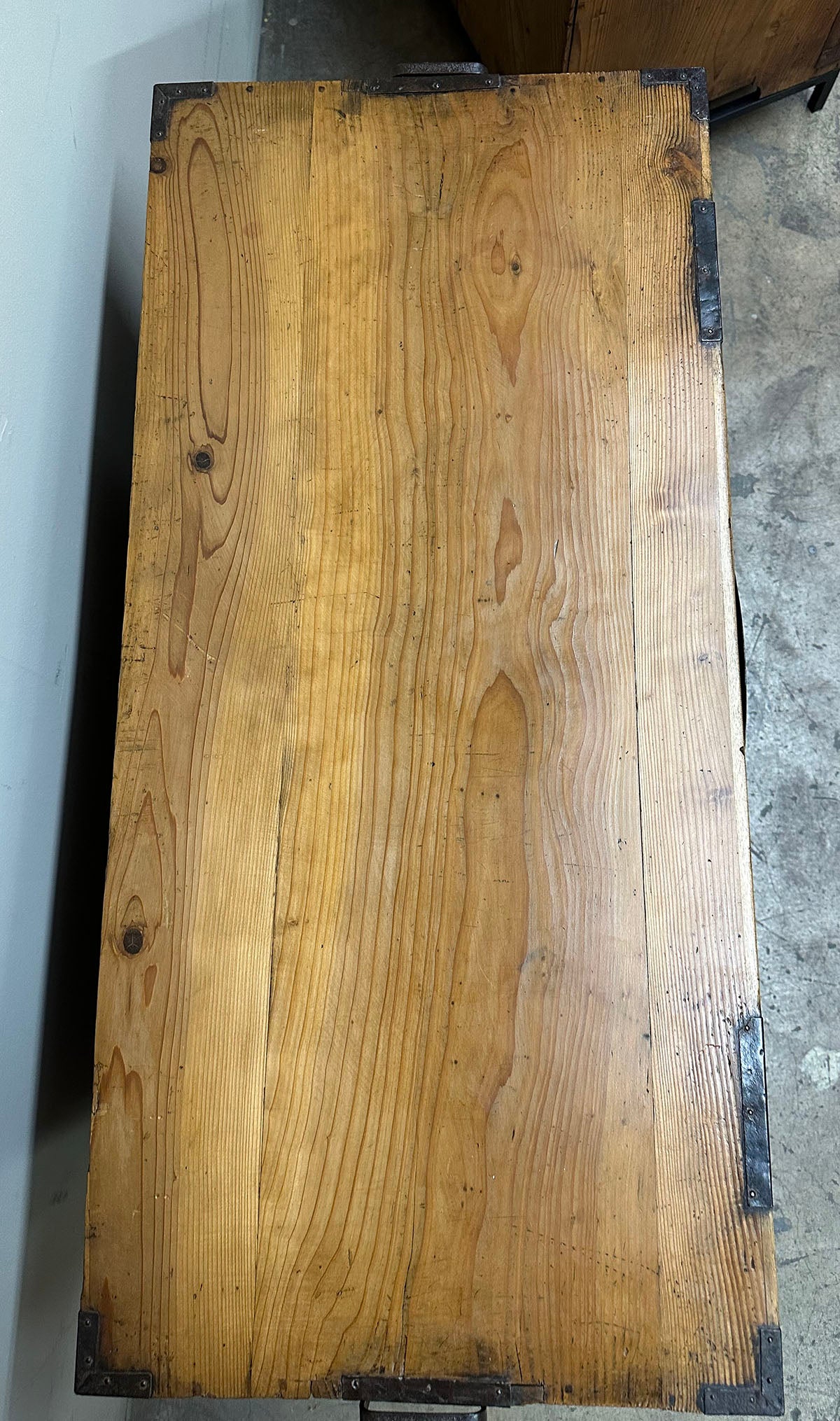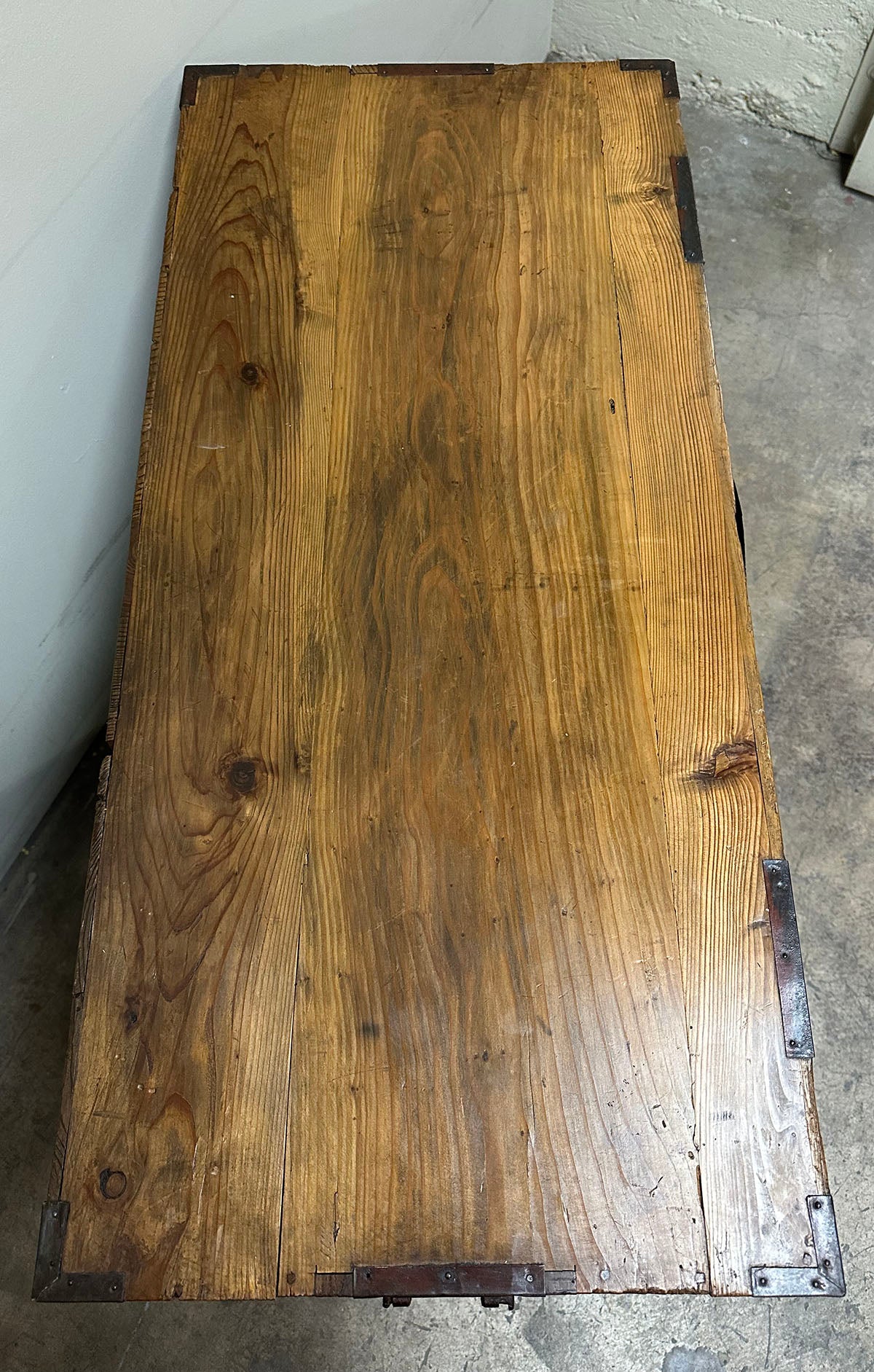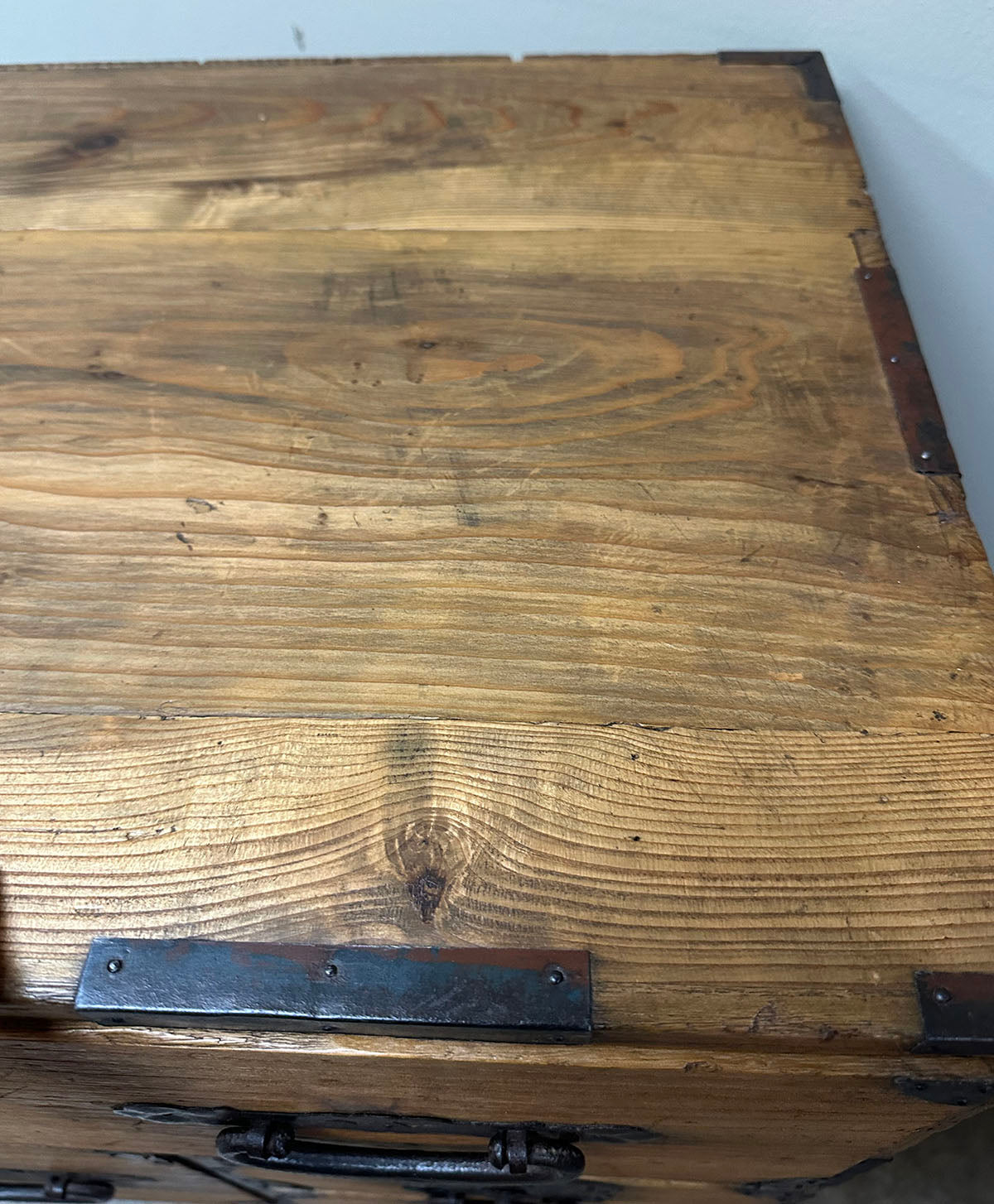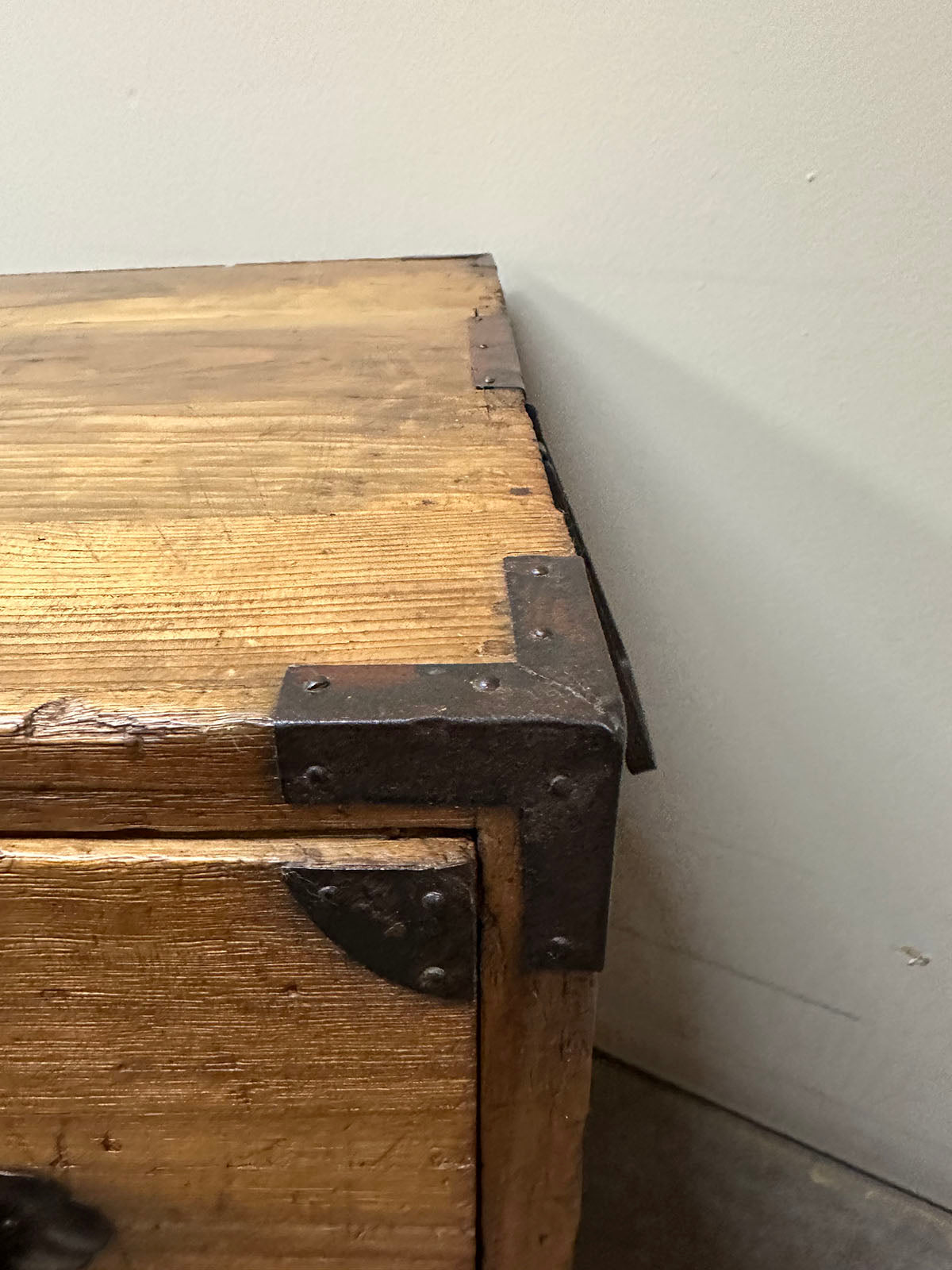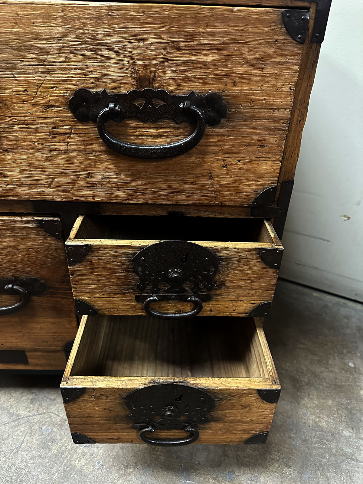 The chests are adorned with heavy hand-forged iron hardware. The highlight is the oversized fan-shaped lock plates (maete)