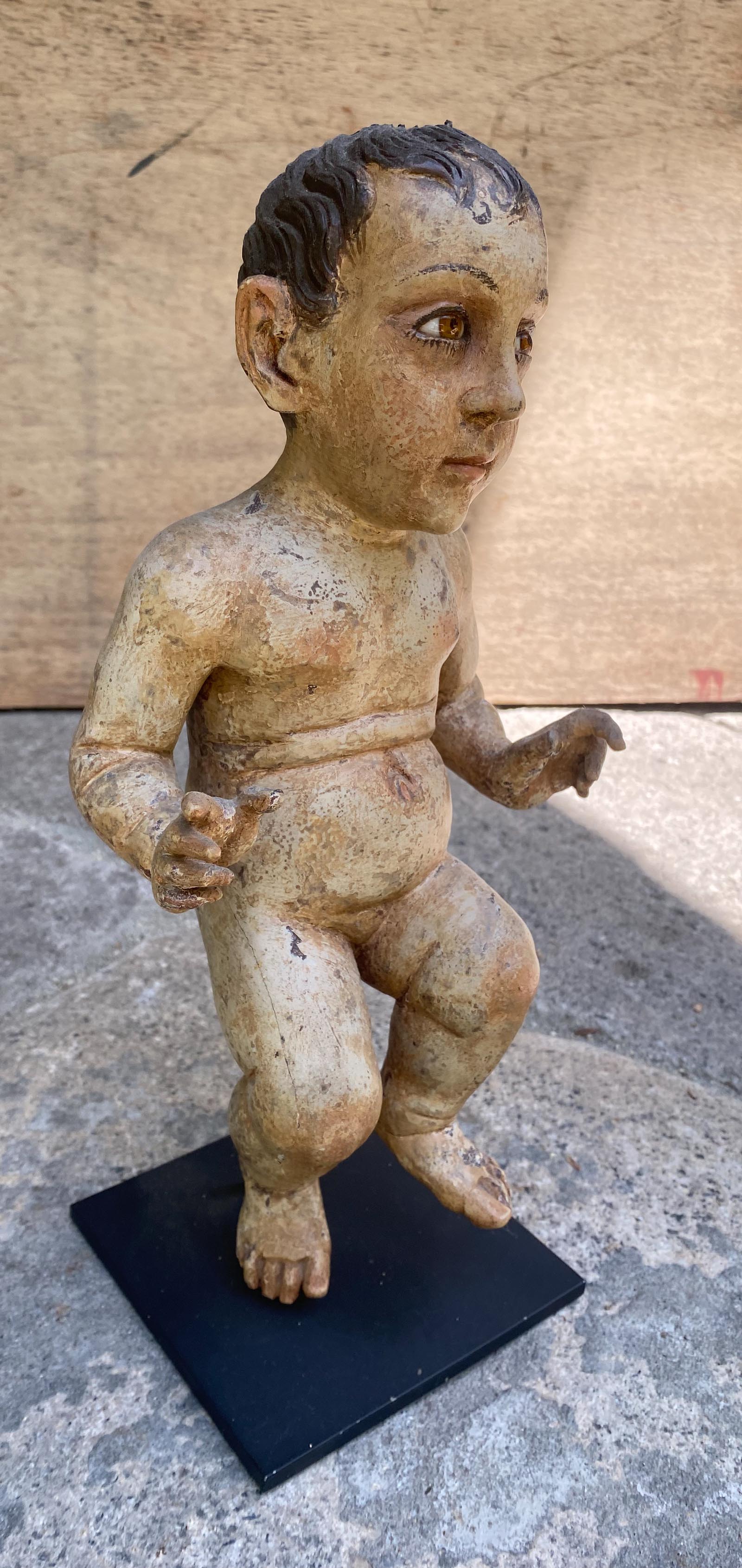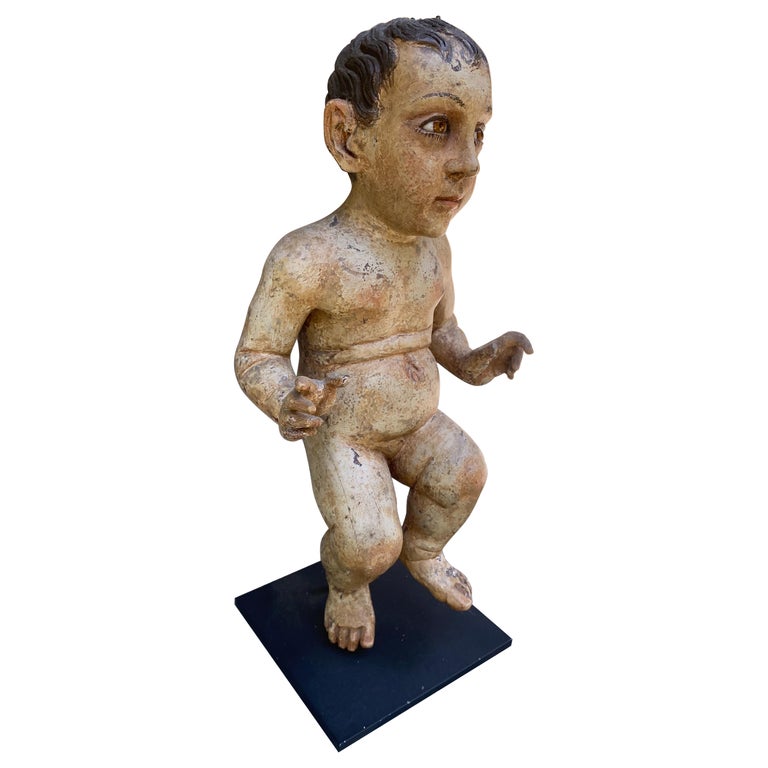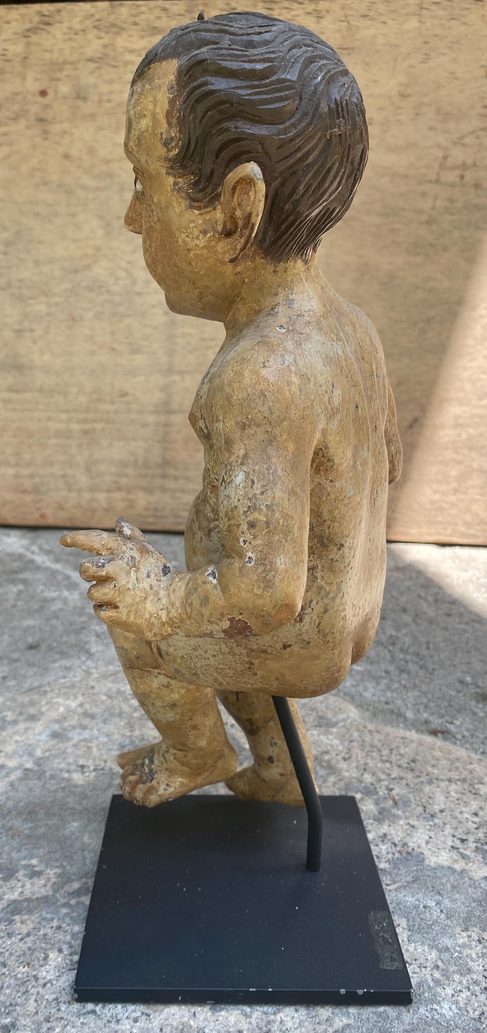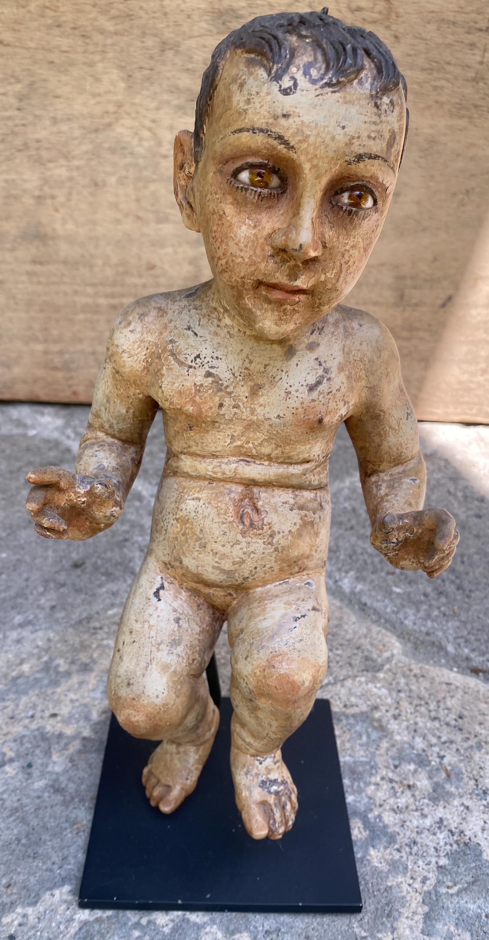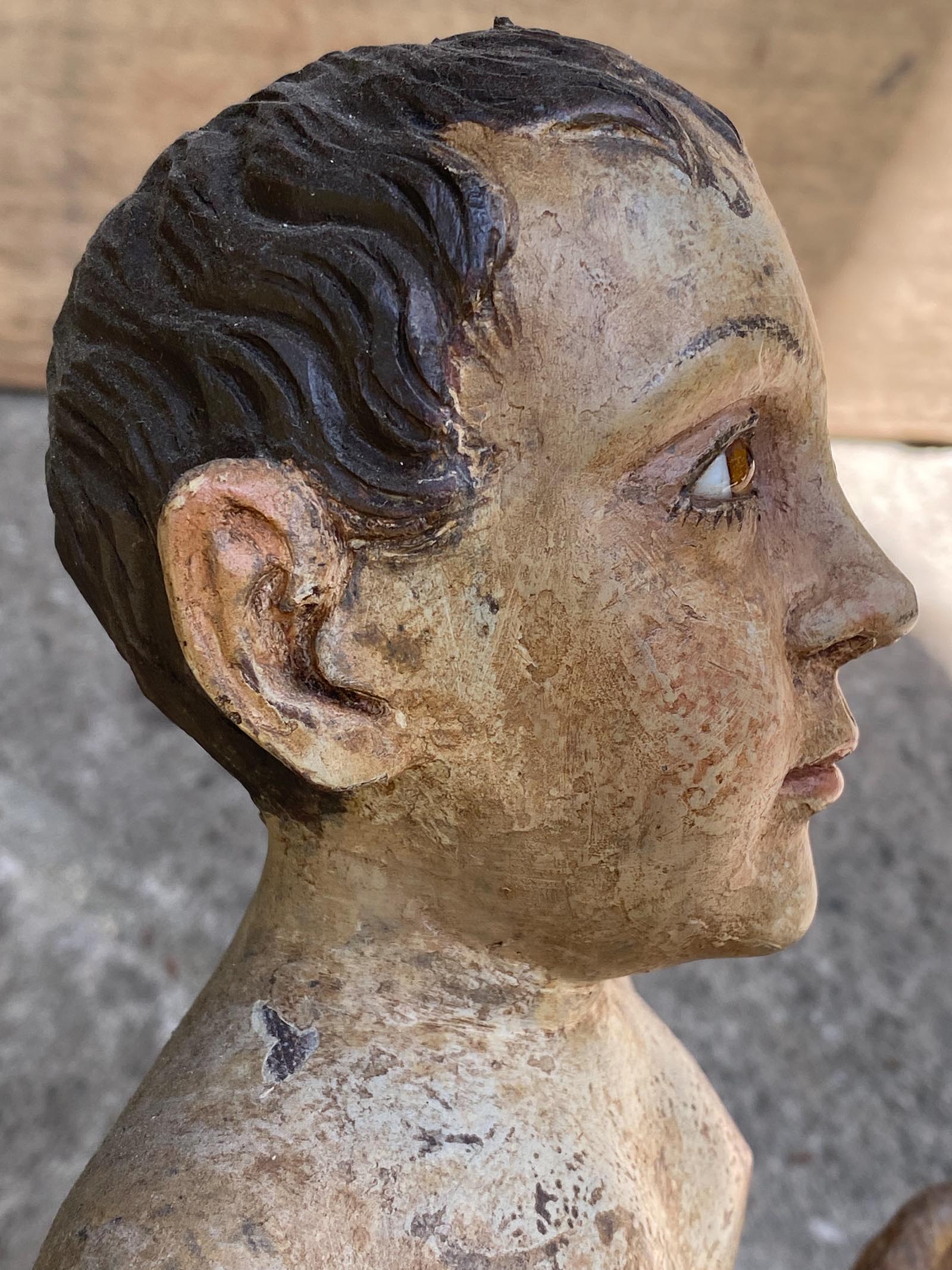 This is a beautiful example of a Spanish Colonial Nino/ Christ Child/Jesus. It has beautiful, life like brown glass eyes, which were a later Spanish Colonial feature (earlier figures had painted eyes). Brown was the most typical, symbolizing realism and humility. It is polychrome with carved hair. Carved hair (instead of wig hair) suggests a slightly earlier or more modest figure, maybe mid-1700s to early 1800s.