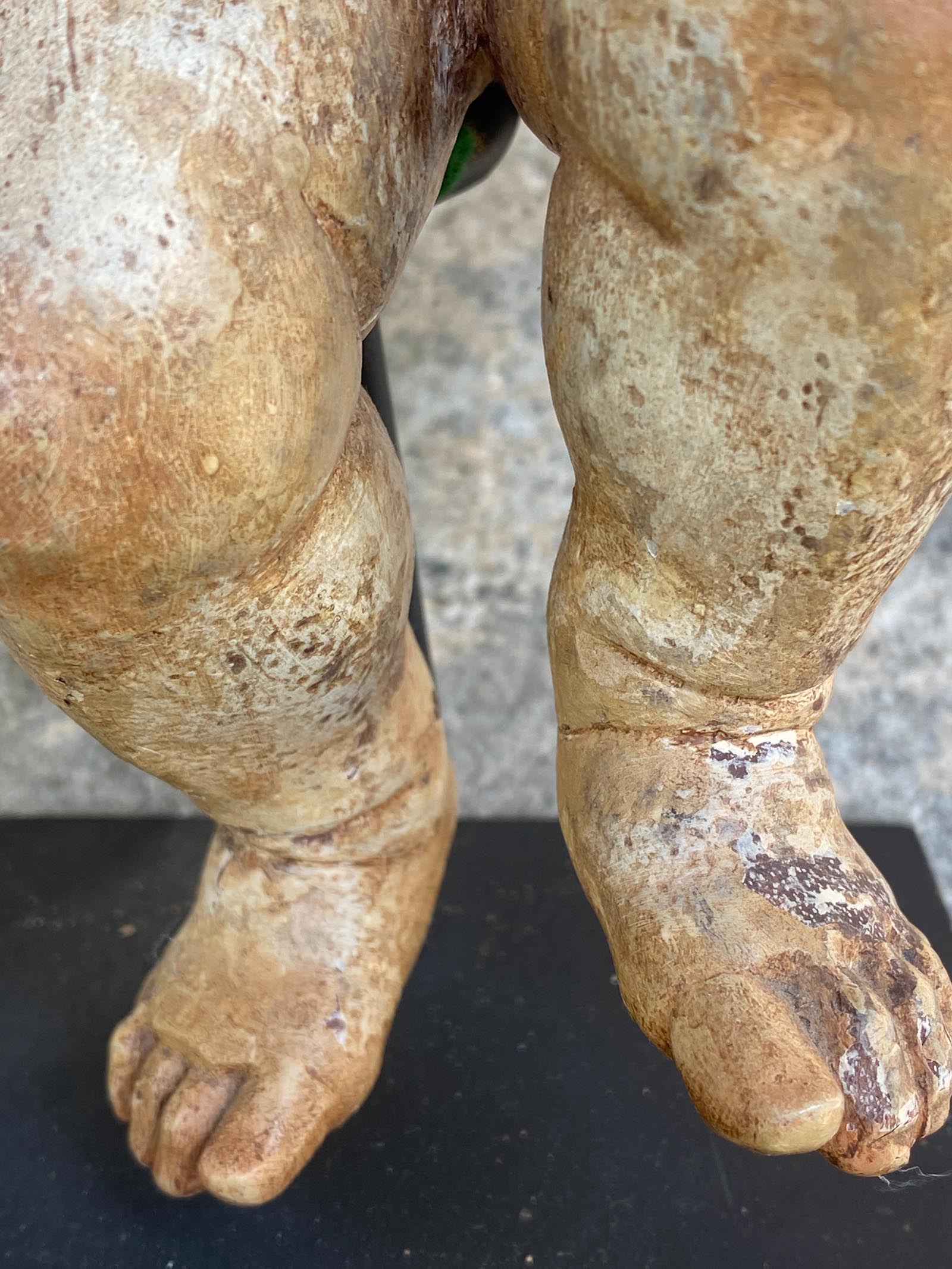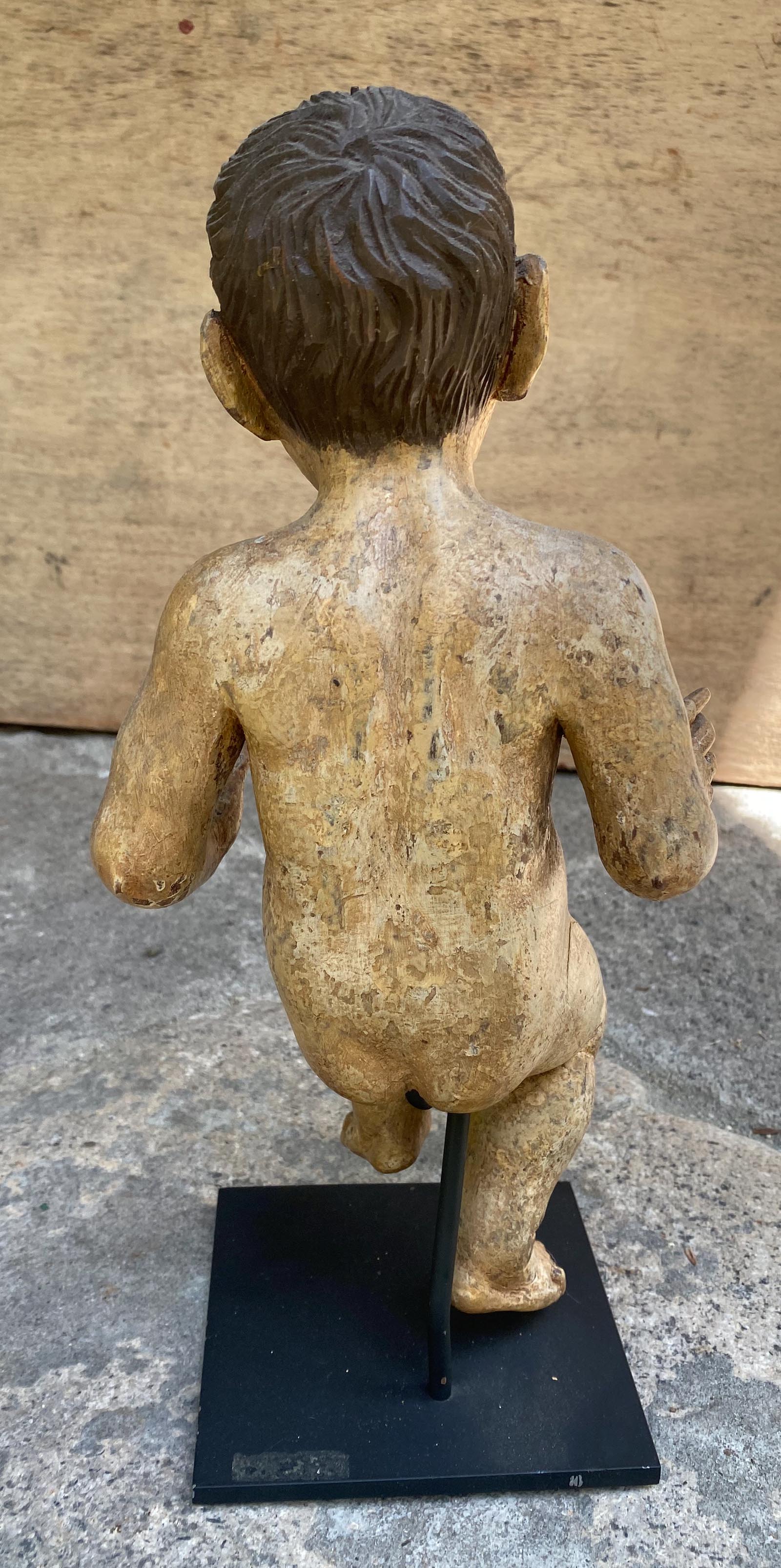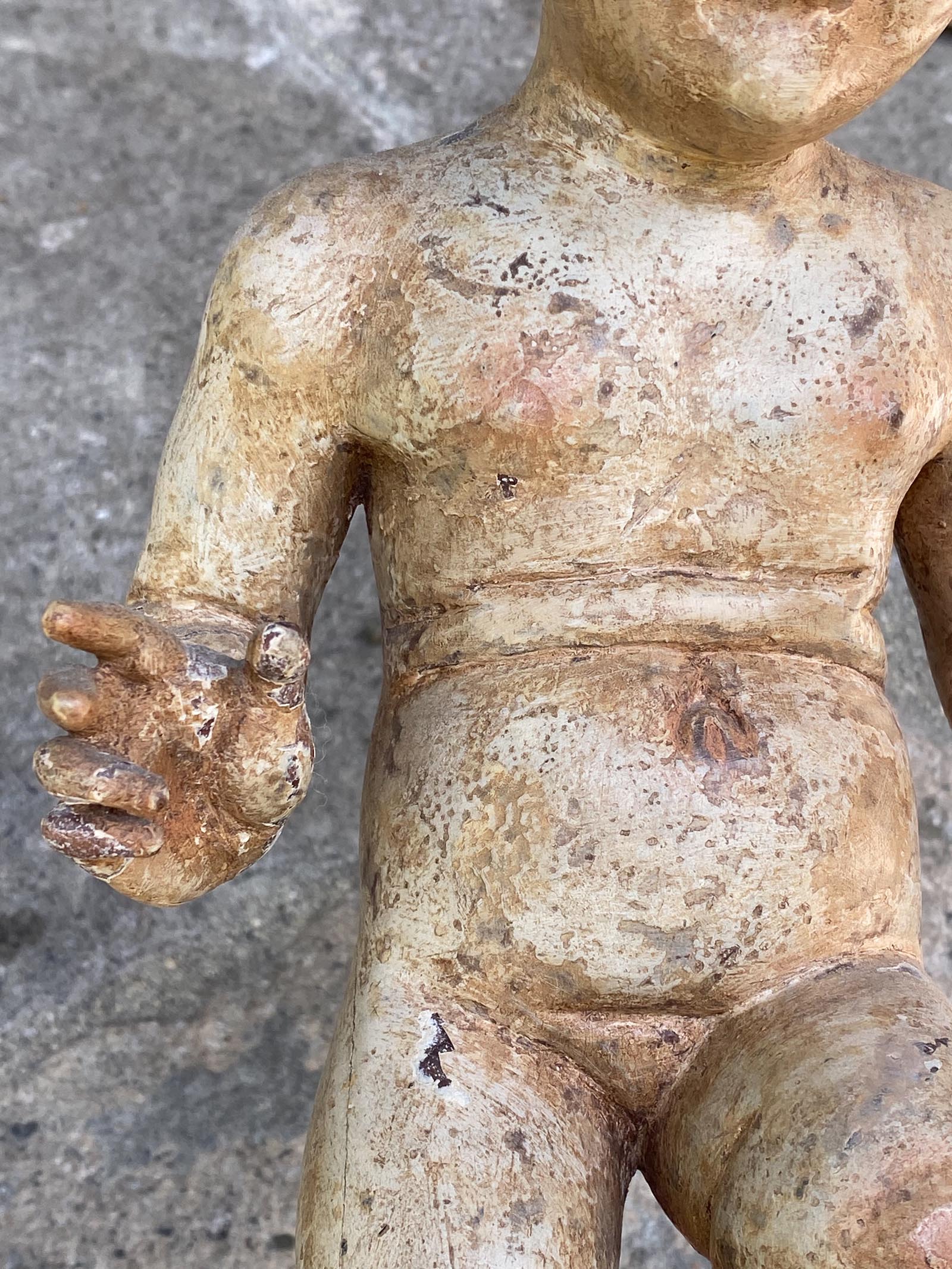 Normal paint loss throughout Nino. Paint naturally flakes off polychrome surfaces over decades/centuries. In otherwise great condition