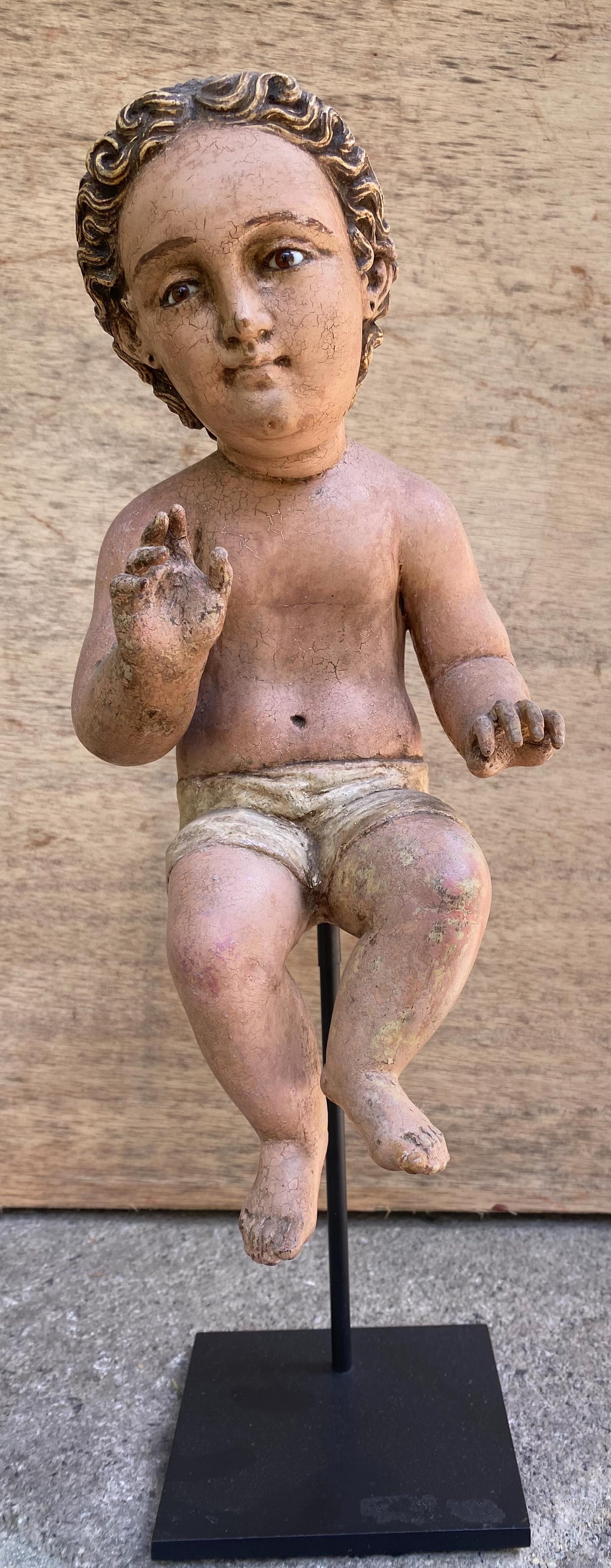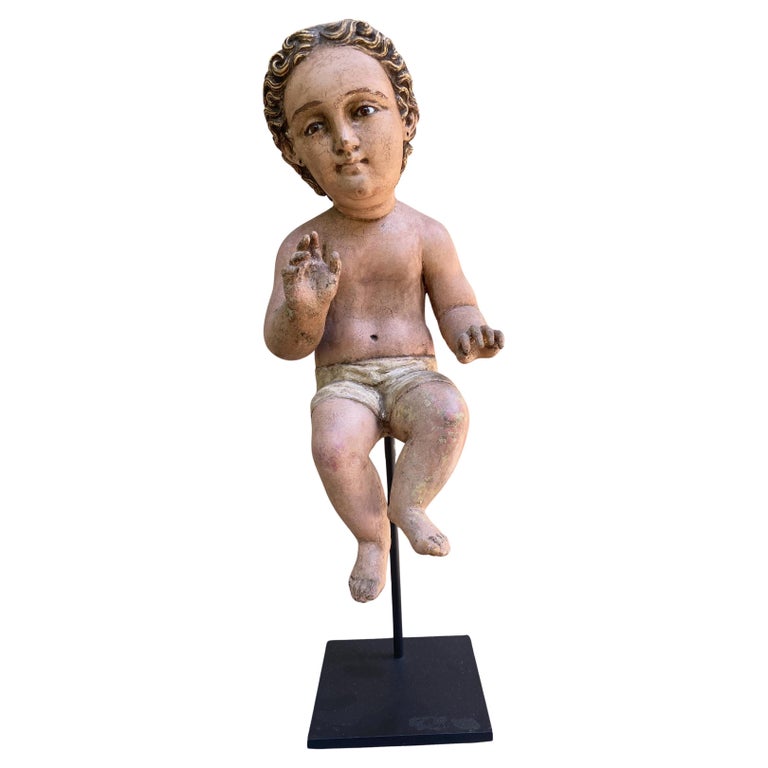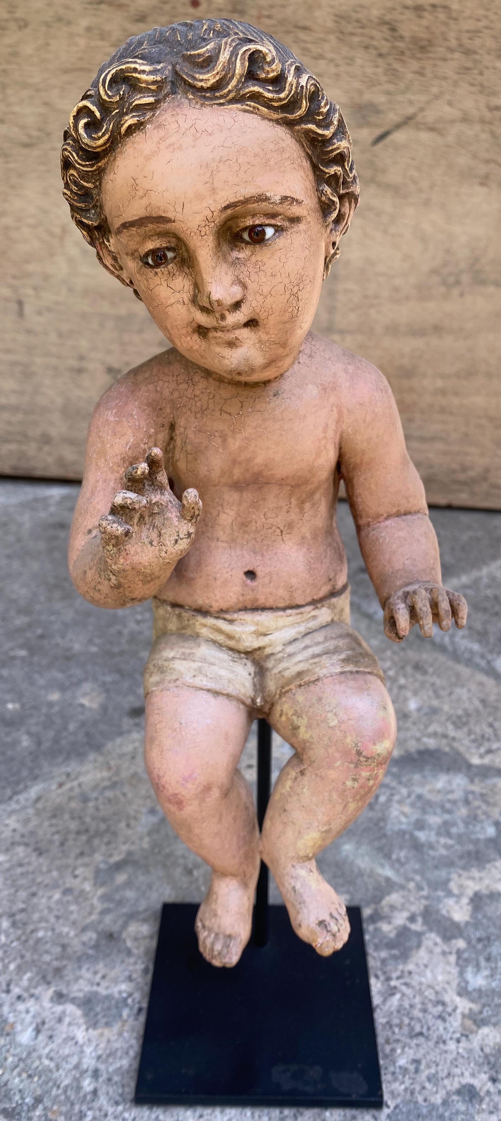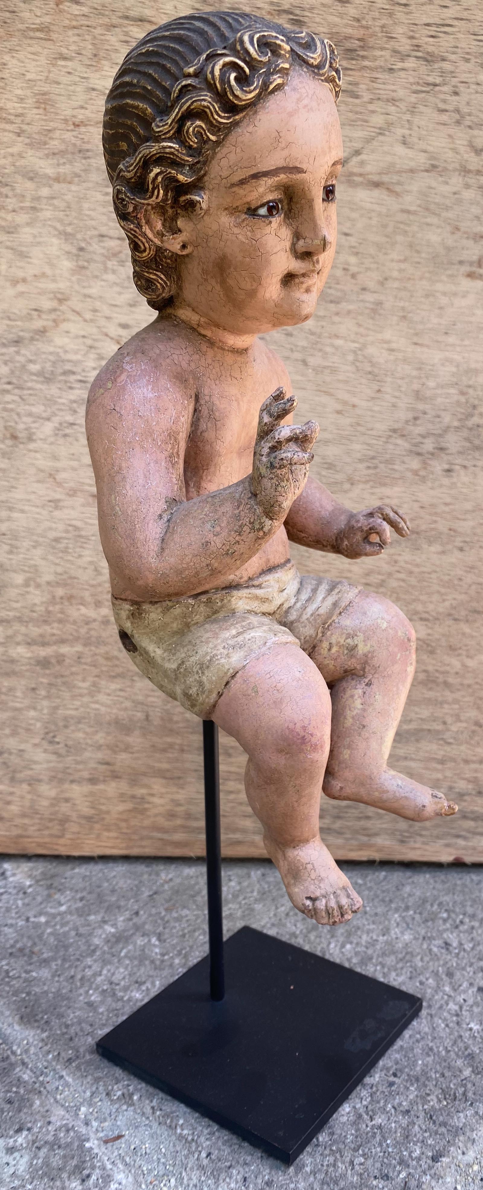 Rare for pieces of this age, all fingers remain intact, enhancing both its artistic and historical value. The serene expression and graceful posture convey a sense of innocence and sanctity, characteristic of religious sculpture in the Spanish Colonial tradition.