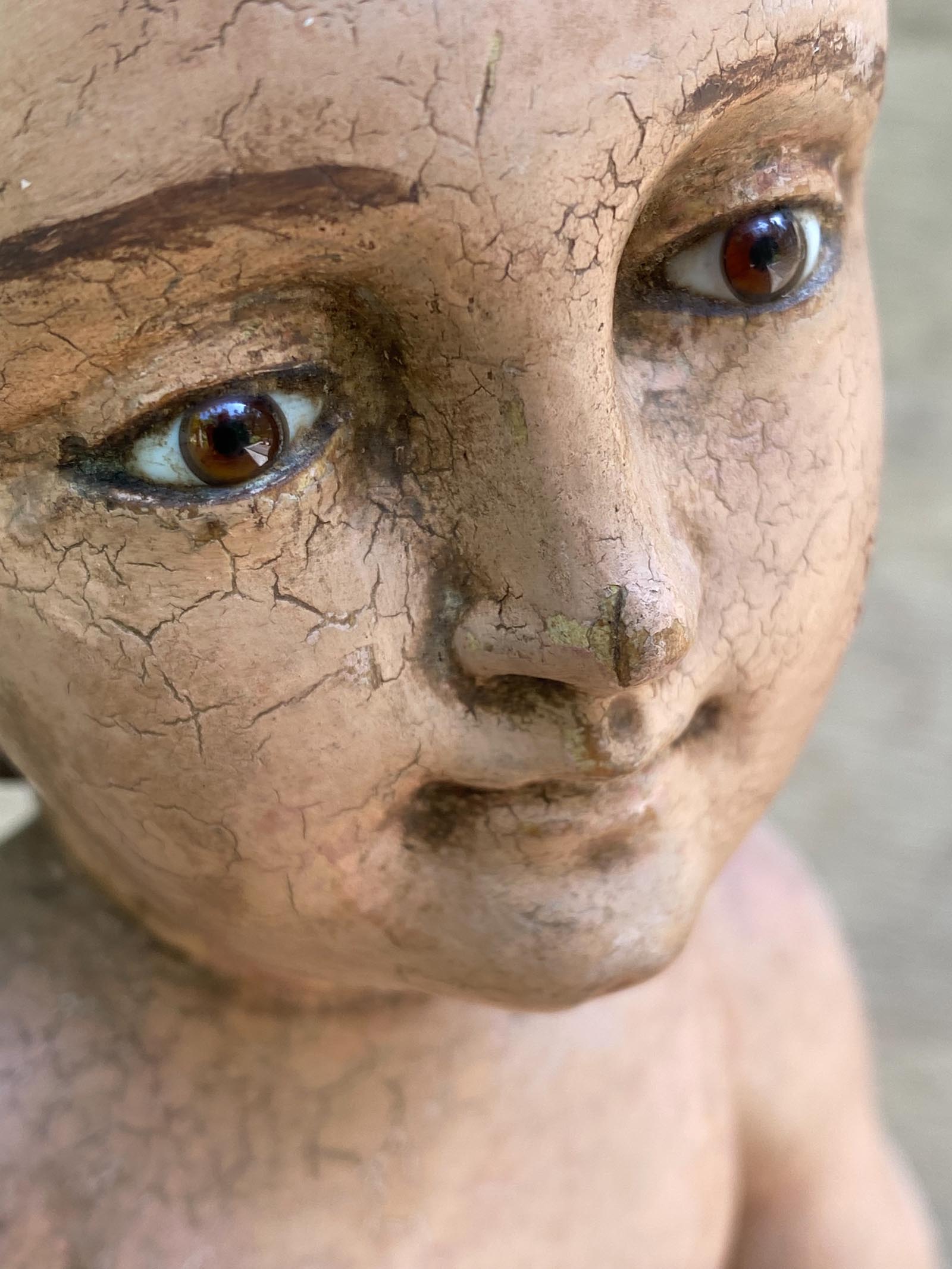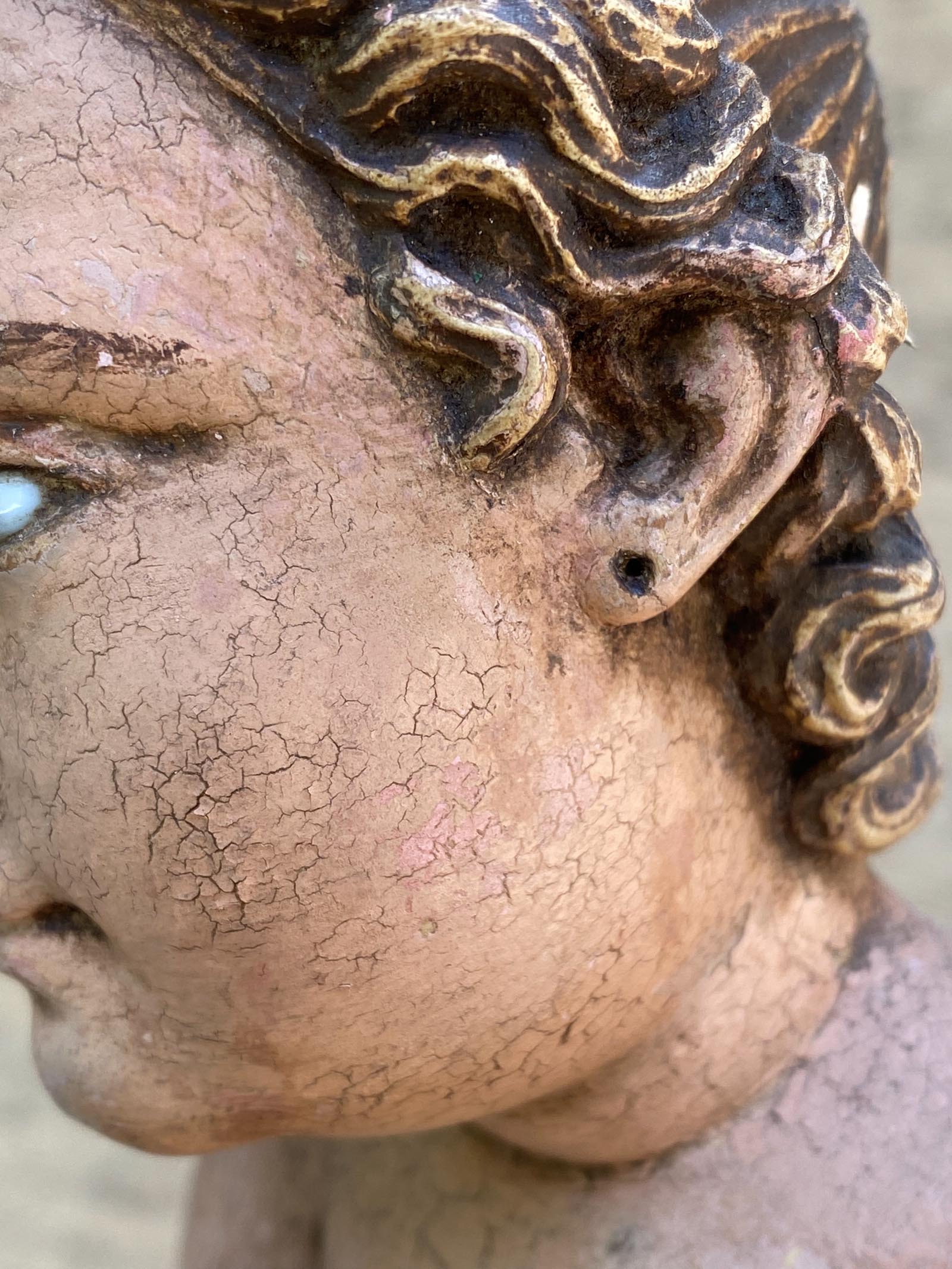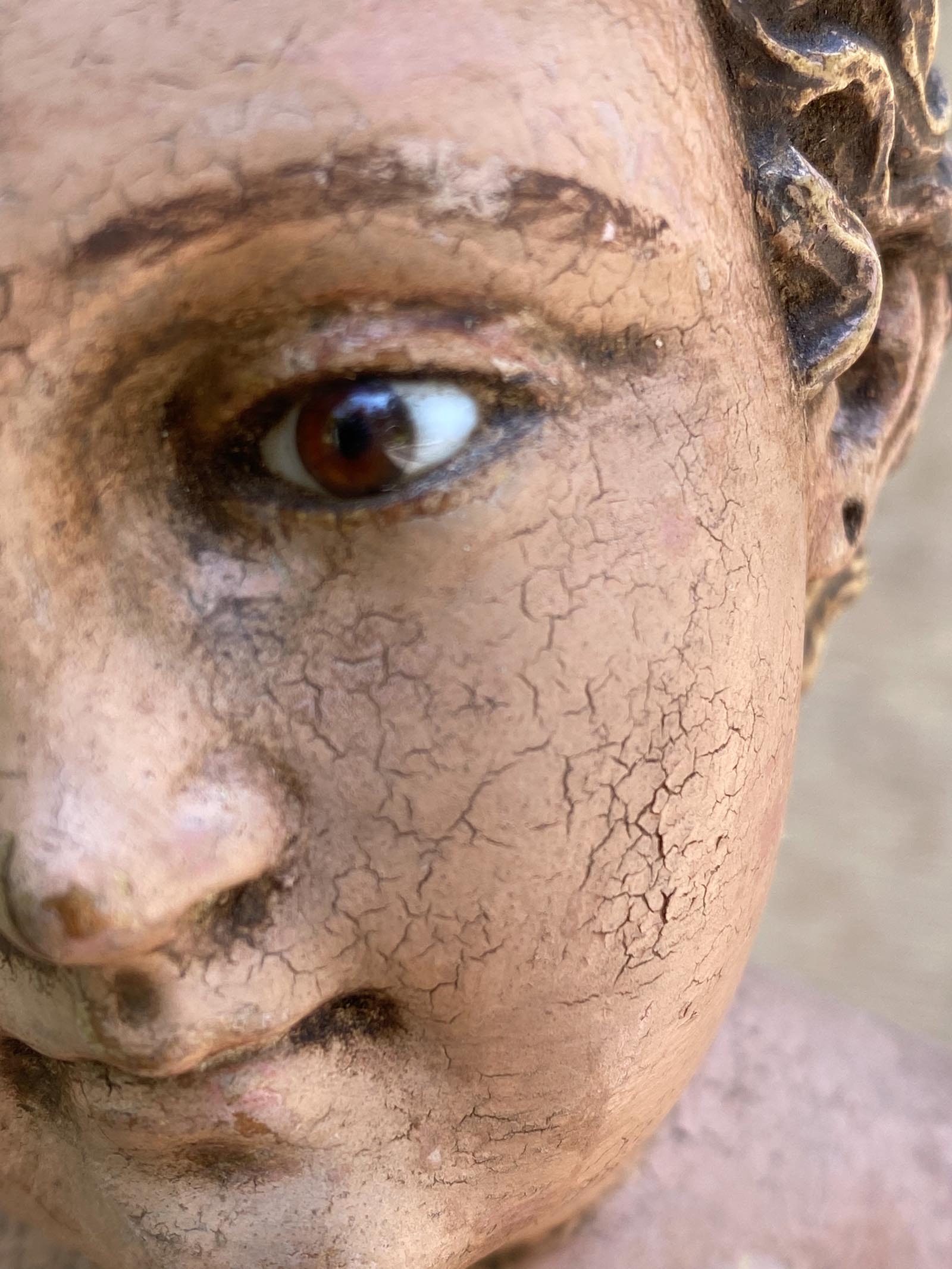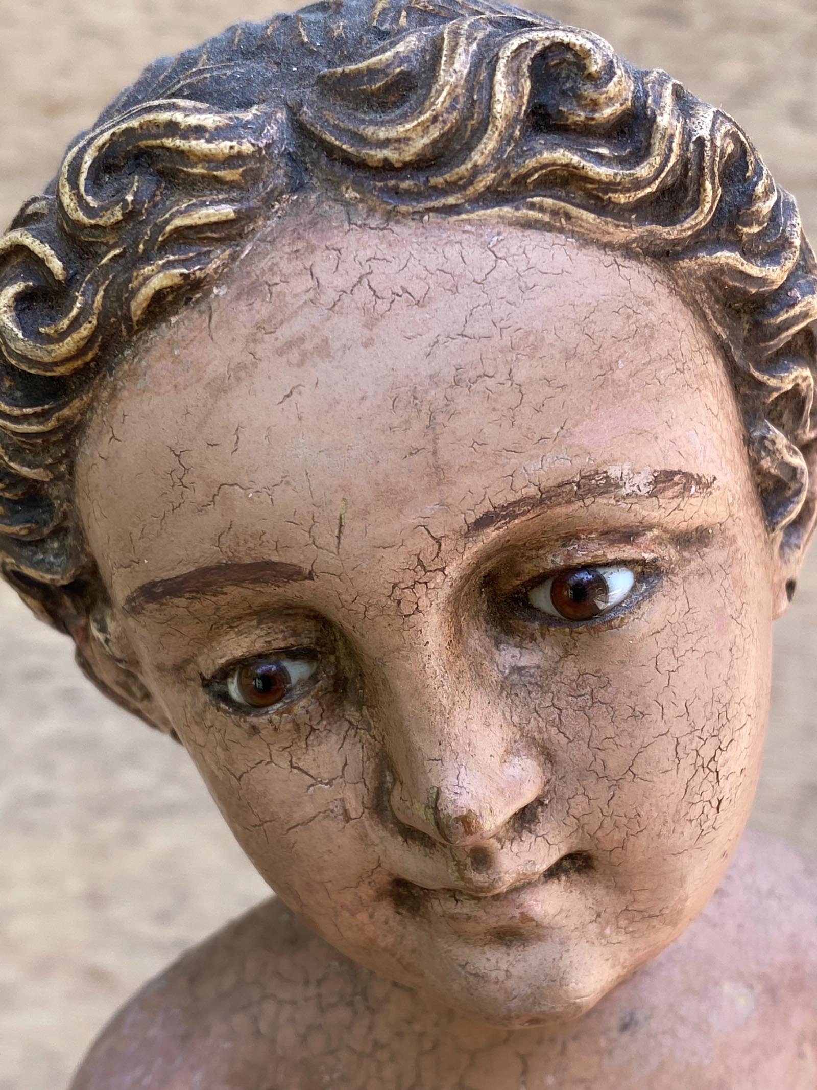 The figure is rendered with delicately modeled features, including intricately carved hair, inserted glass eyes, and pierced ears—elements that suggest she was once adorned with earrings in accordance with local devotional customs. The statue retains its original polychrome surface, though with notable areas of paint loss—evidence of prolonged devotional use.