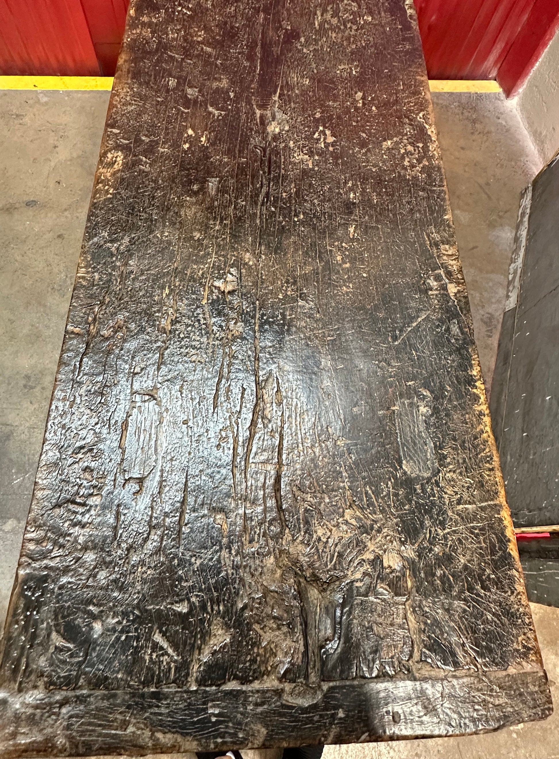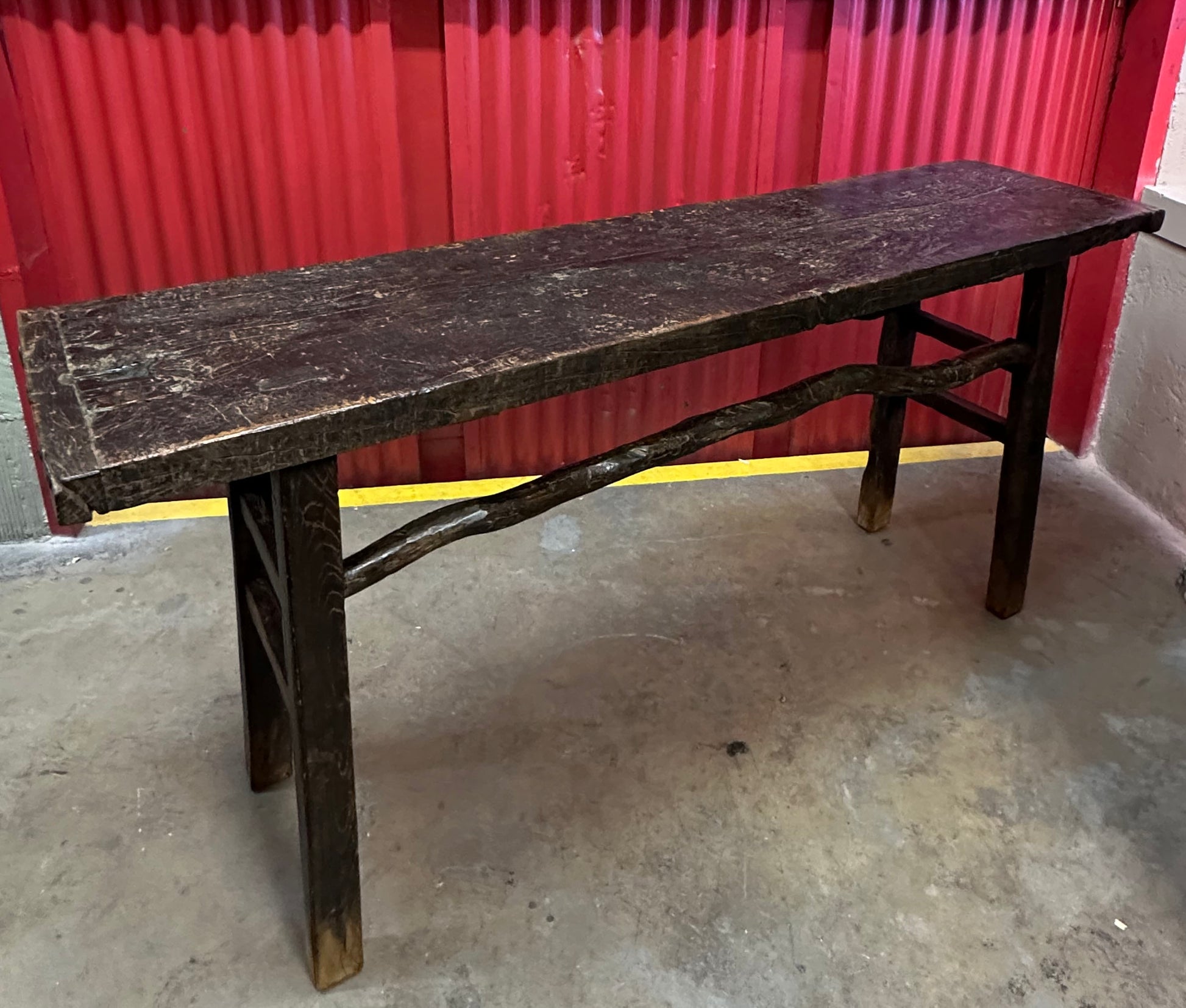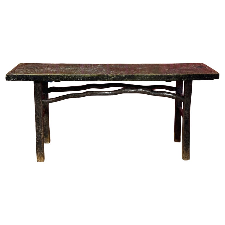 A striking Chinese console table, likely Qing dynasty period, crafted from black Yumu wood (Northern Elm), distinguished by its elegant proportions and naturally expressive form. The solid 2-inch-thick plank top rests above a refined base with organically curved stretchers, showcasing the inherent beauty of the wood and the hand of the maker.