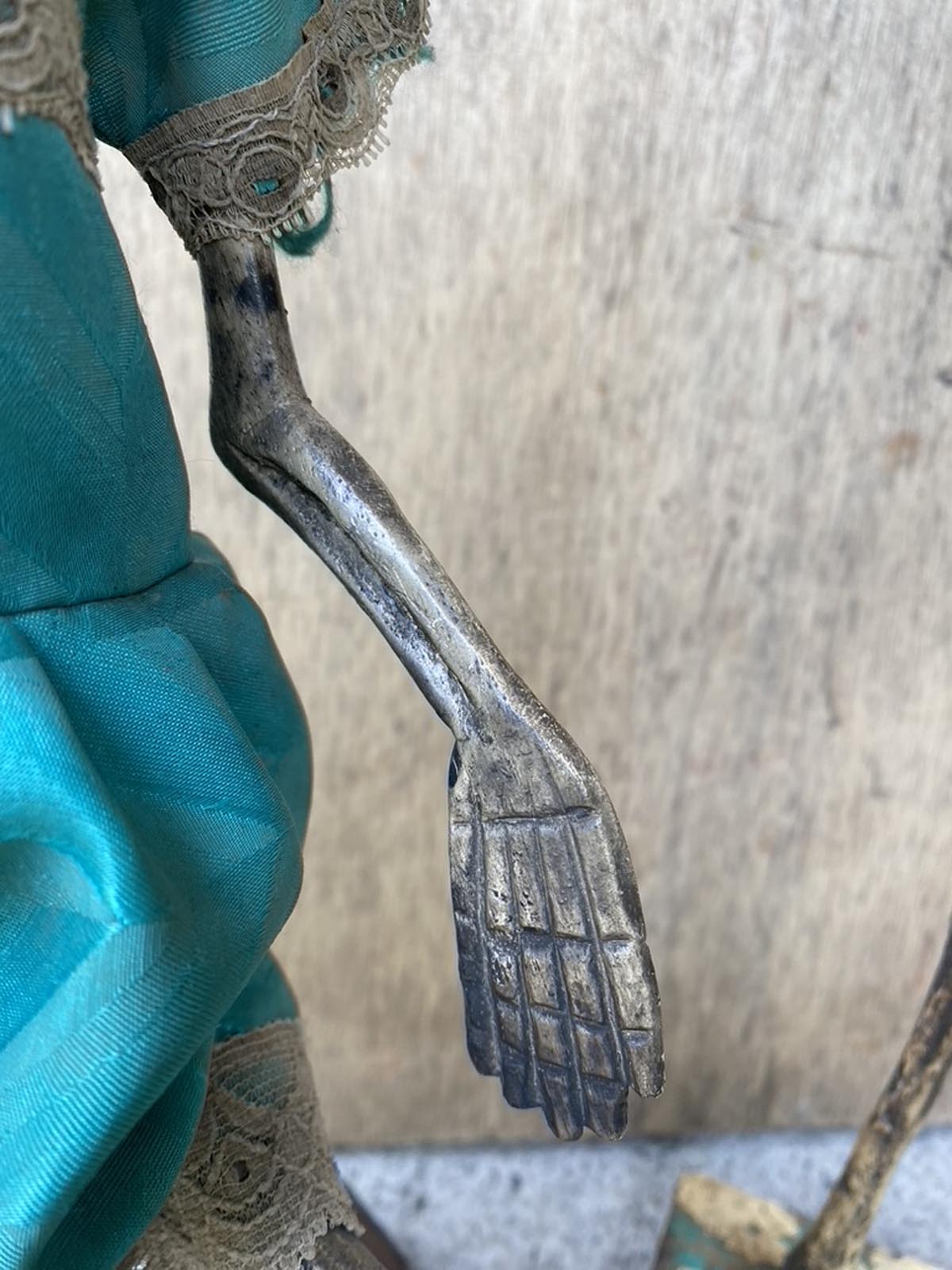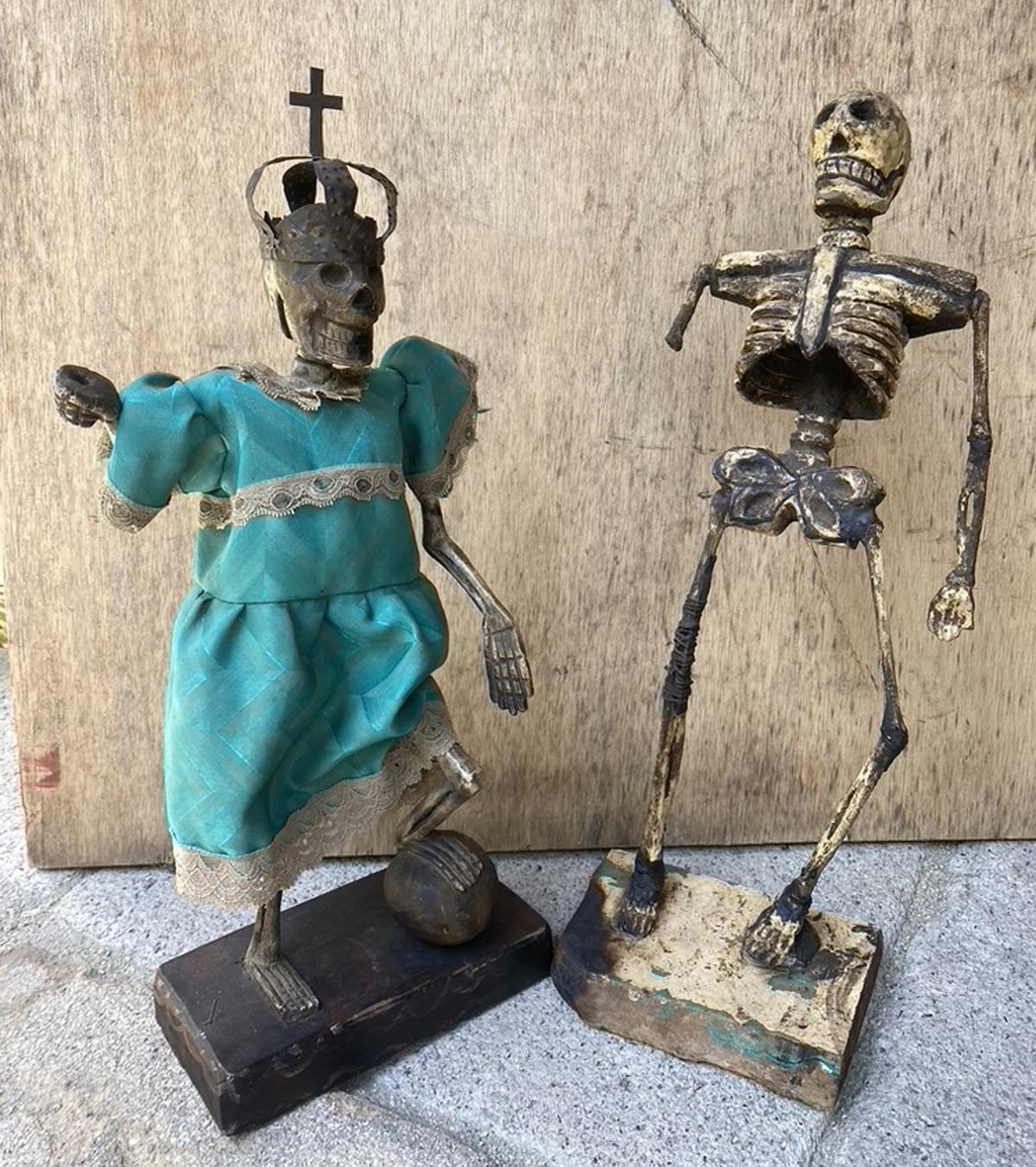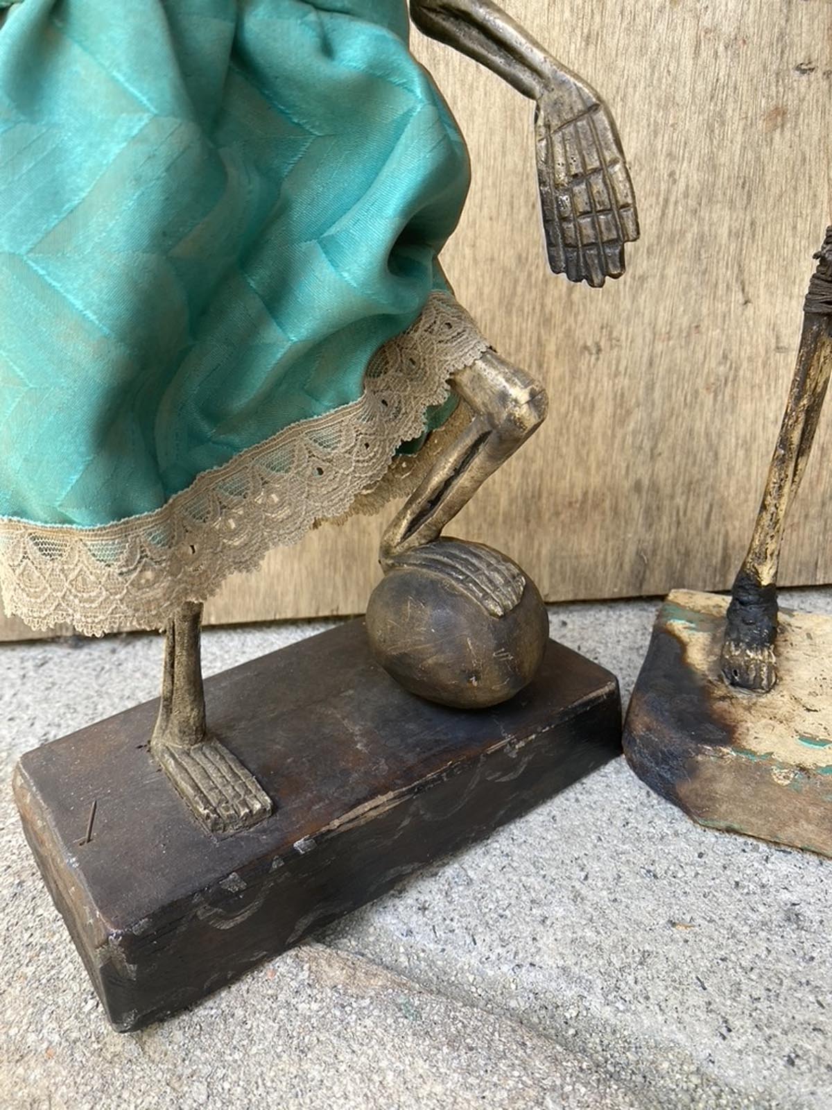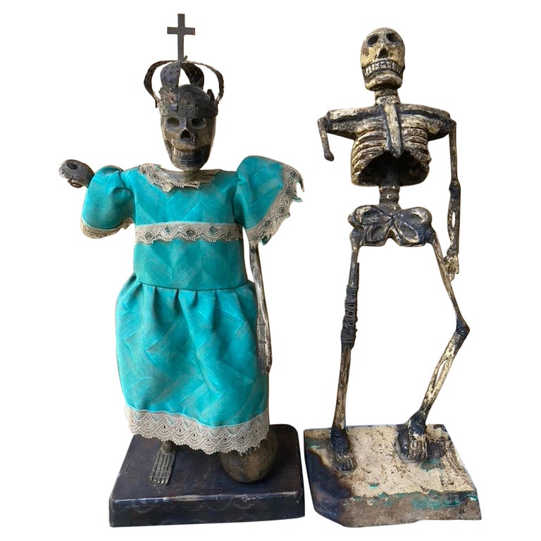 This striking pair of Guatemalan skeletal figures—male and female representations of Santa Muerte—embody the reverent and complex relationship between death, protection, and healing in folk religious practice. The crowned female figure wears a turquoise dress with lace trim, evoking attributes of sanctity and maternal care. The male figure, skeletal and bare, stands with pronounced ribs and a bowed posture, suggestive of his role as a guardian of the graveyard.