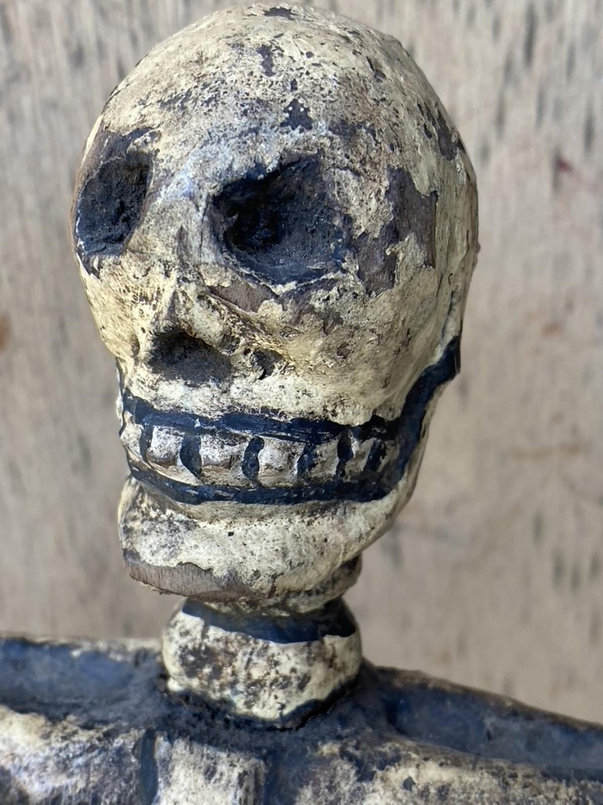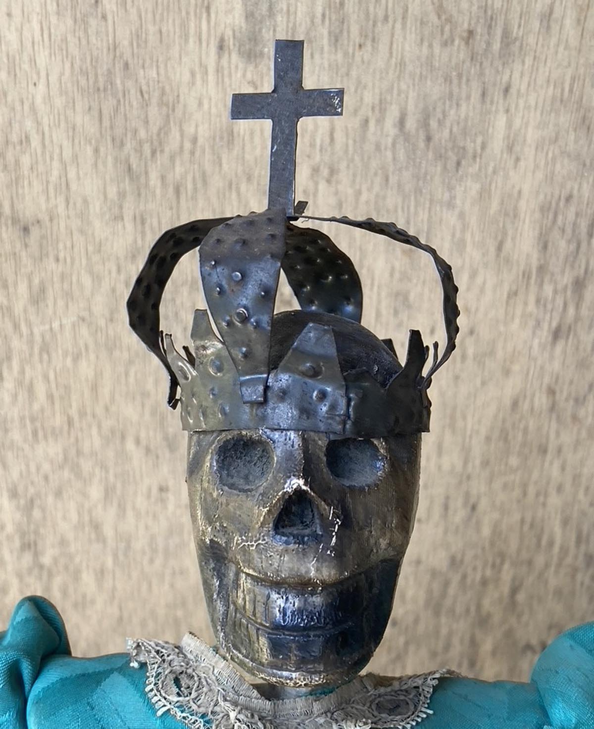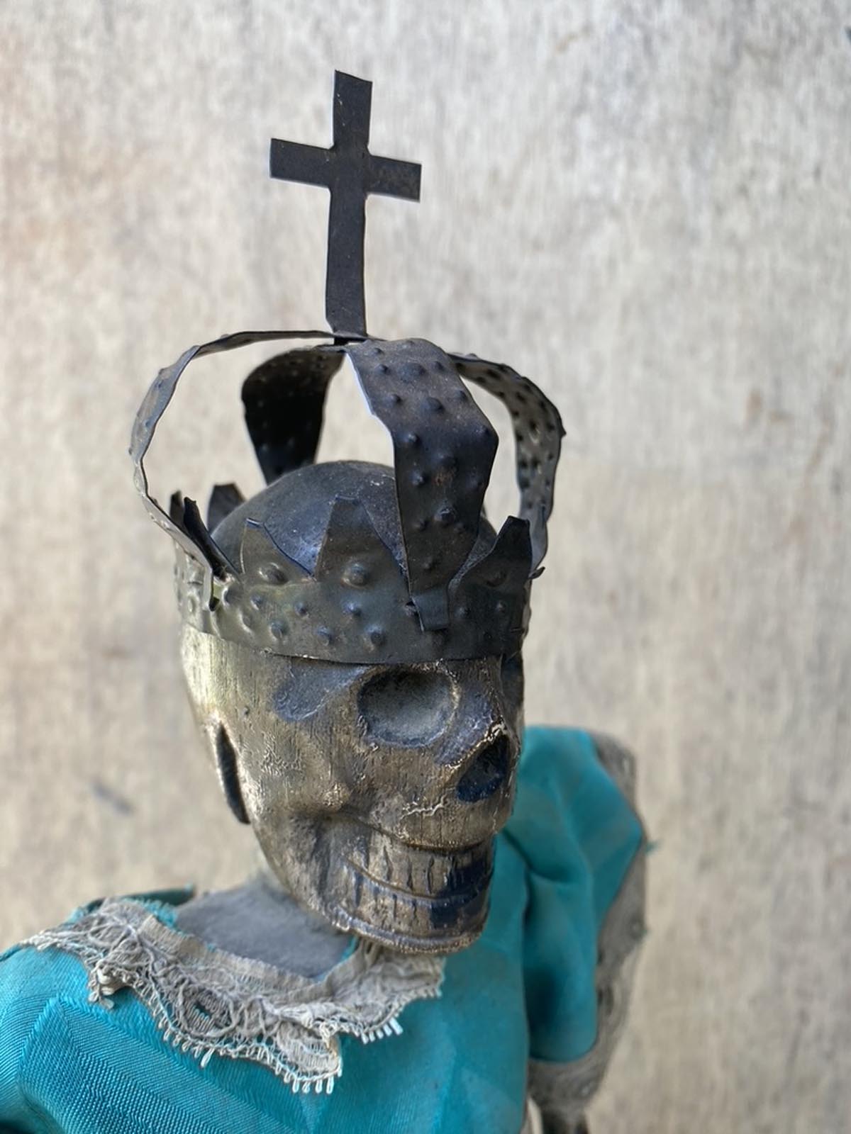 In Guatemalan and broader Mesoamerican syncretic traditions, such representations are associated with folk saints believed to offer protection, healing, and safe passage for souls. Santa Muerte (“Holy Death”) is particularly invoked for health, justice, and protection, and though more commonly linked with Mexican spirituality, figures like these reflect localized iterations throughout Central America.