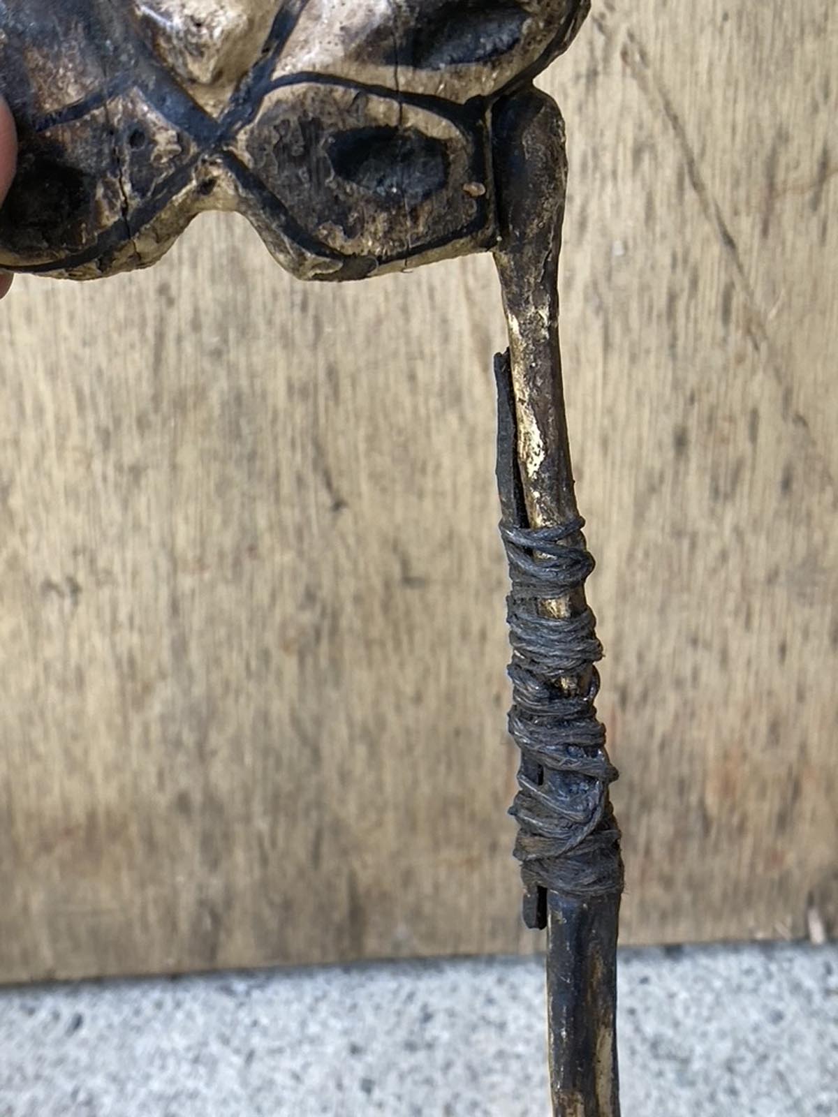 The figures are mounted on wooden bases and crafted from carved and assembled materials, giving them a rustic yet expressive presence. Their stylized features and handmade charm speak to vernacular craftsmanship rooted in deep spiritual symbolism.